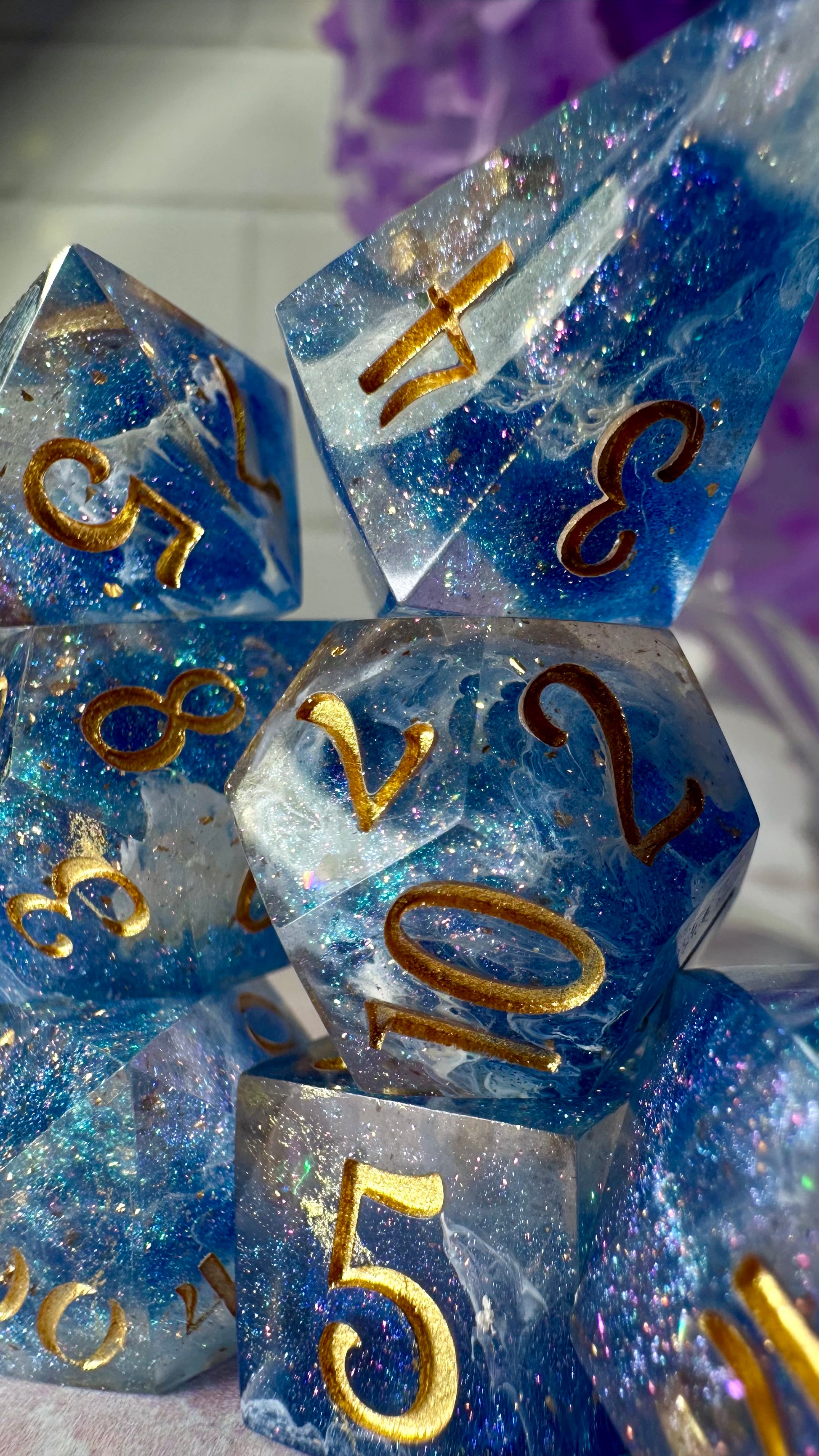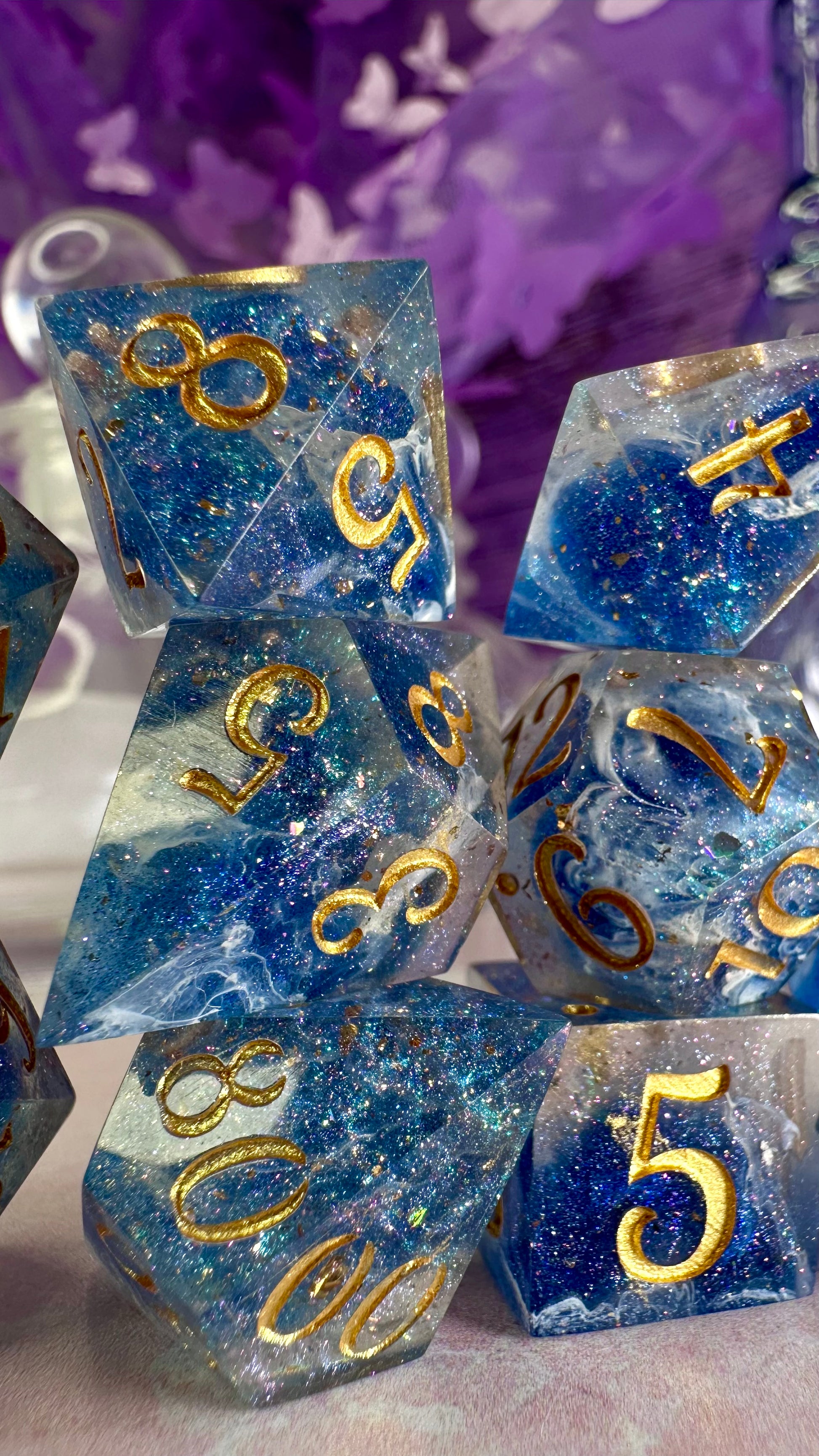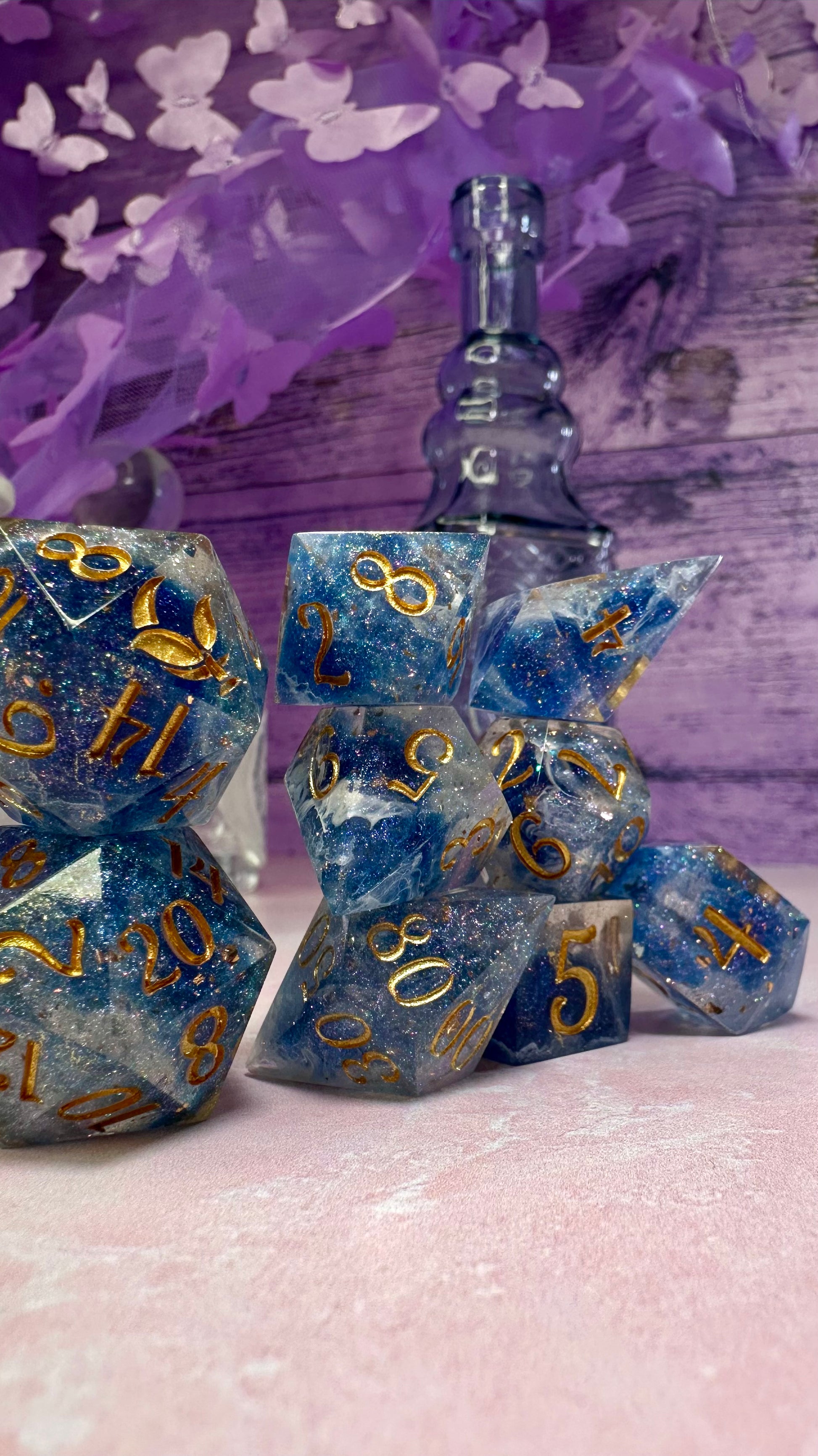 This set was inspired by King George in the Bridgerton miniseries Queen Charlotte. A base of barely tinted blue resin, with colorshifting purple pigment for sparkle, clouds of white alcohol ink, and injected plumes of royal blue colorshifting resin. Pigments for colorshift from Dreamland Watercolor.