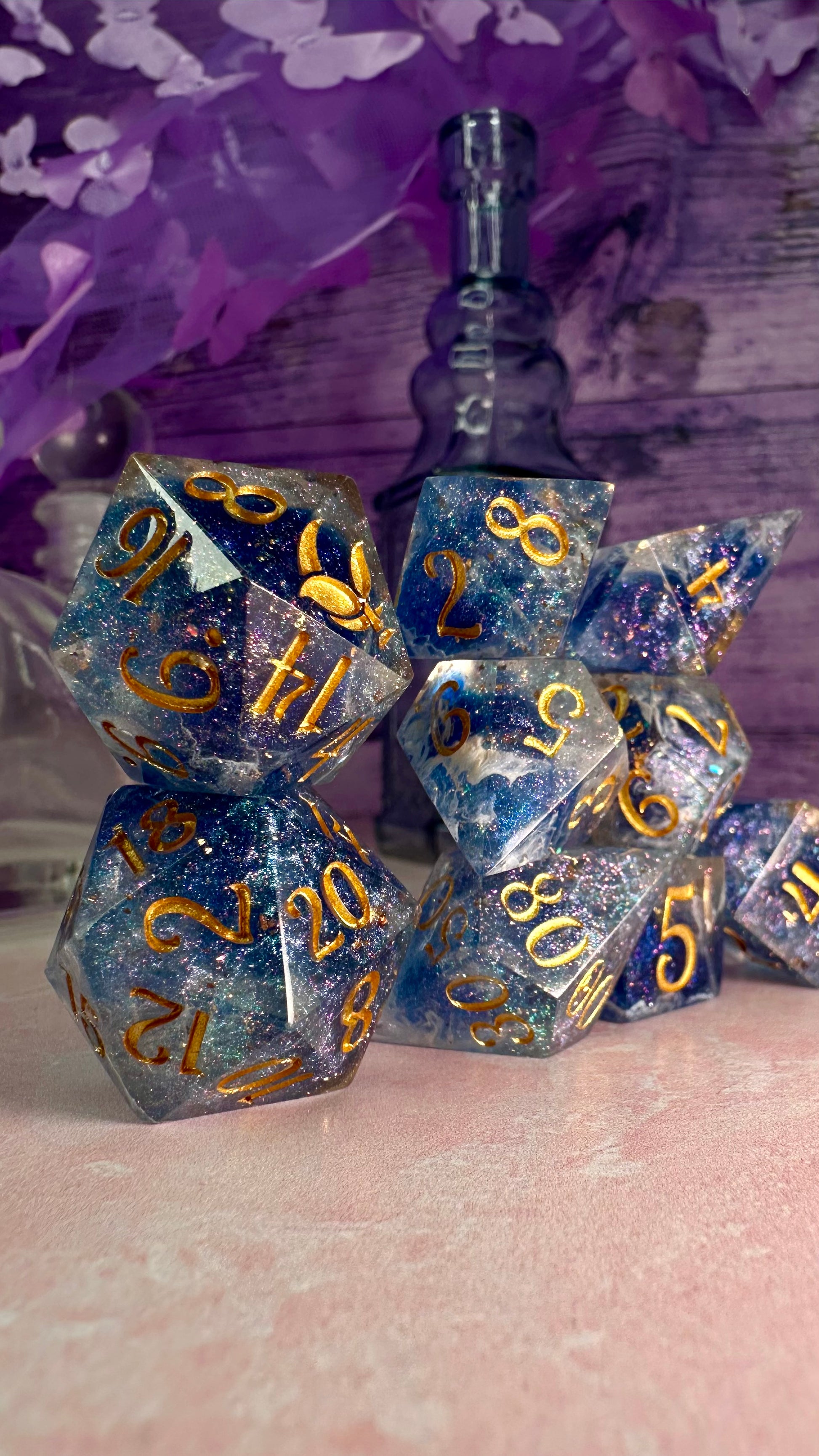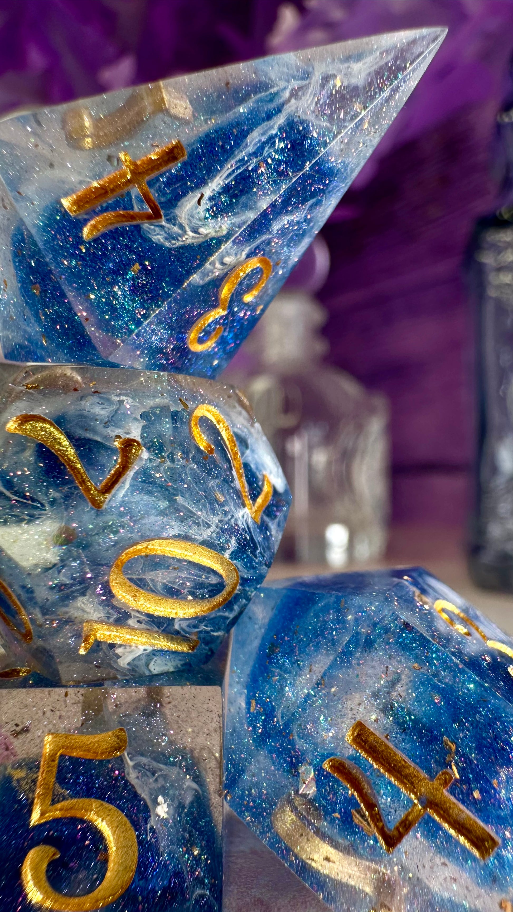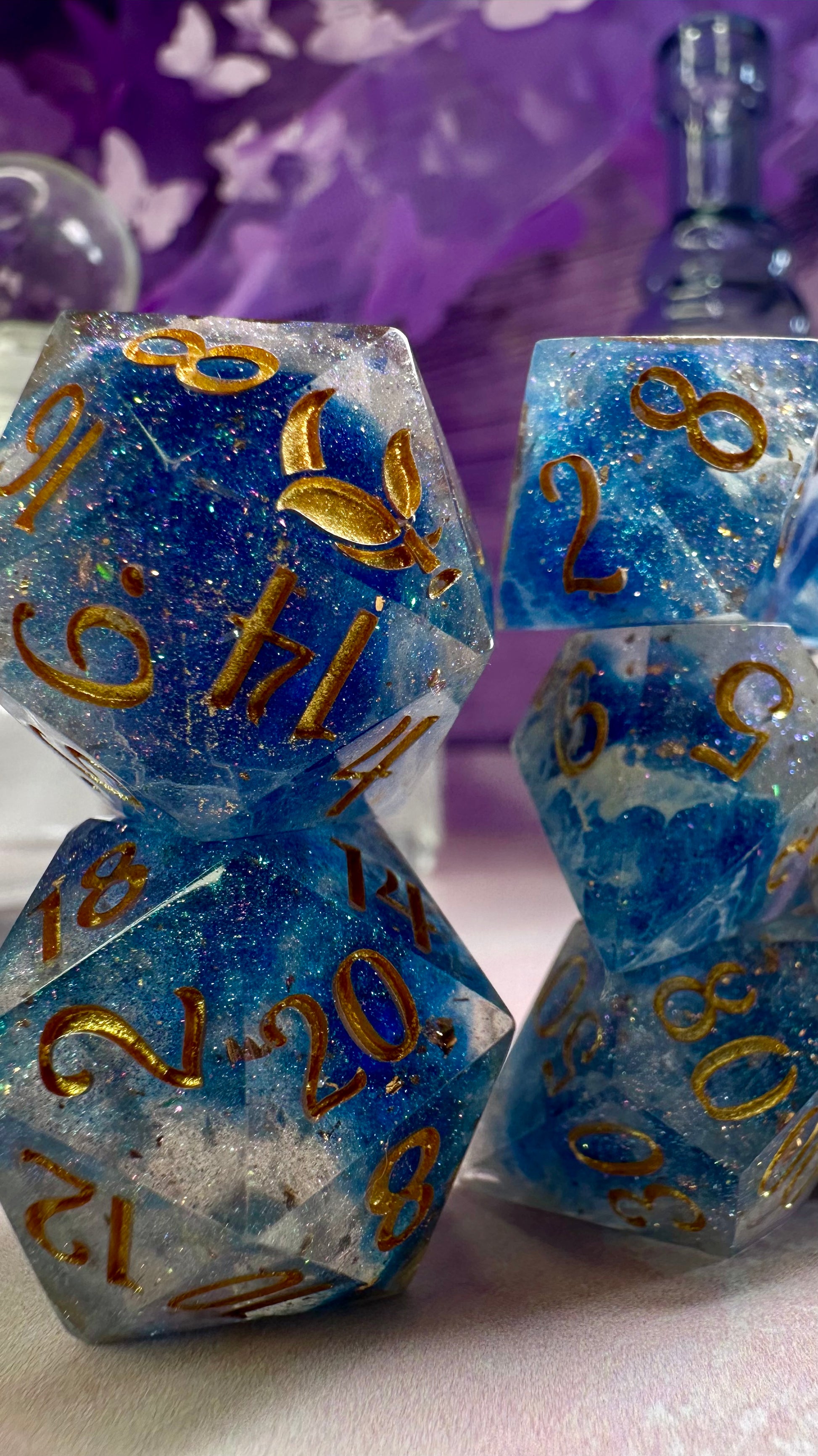This set was inspired by King George in the Bridgerton miniseries Queen Charlotte. A base of barely tinted blue resin, with colorshifting purple pigment for sparkle, clouds of white alcohol ink, and injected plumes of royal blue colorshifting resin. Pigments for colorshift from Dreamland Watercolor.