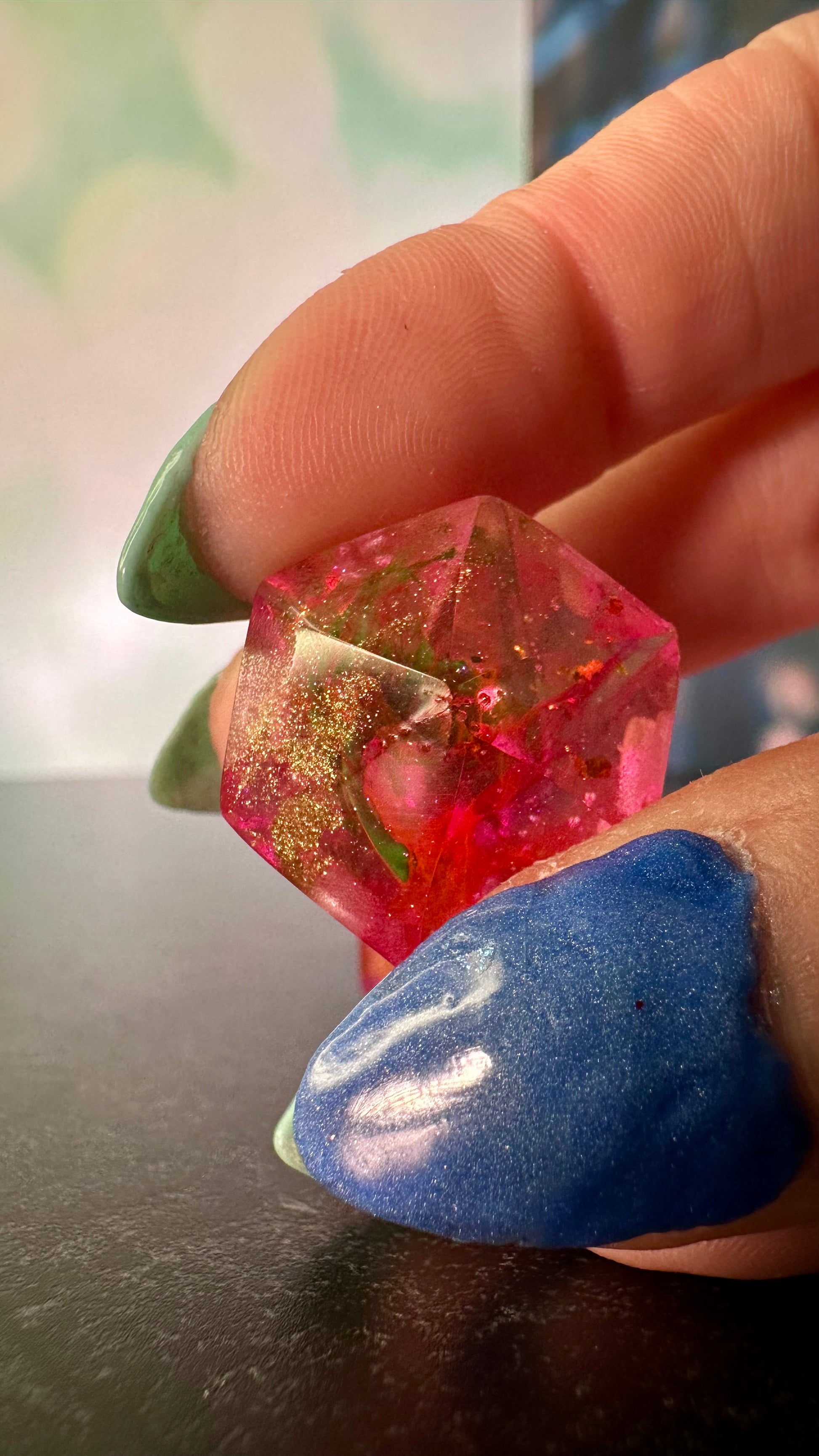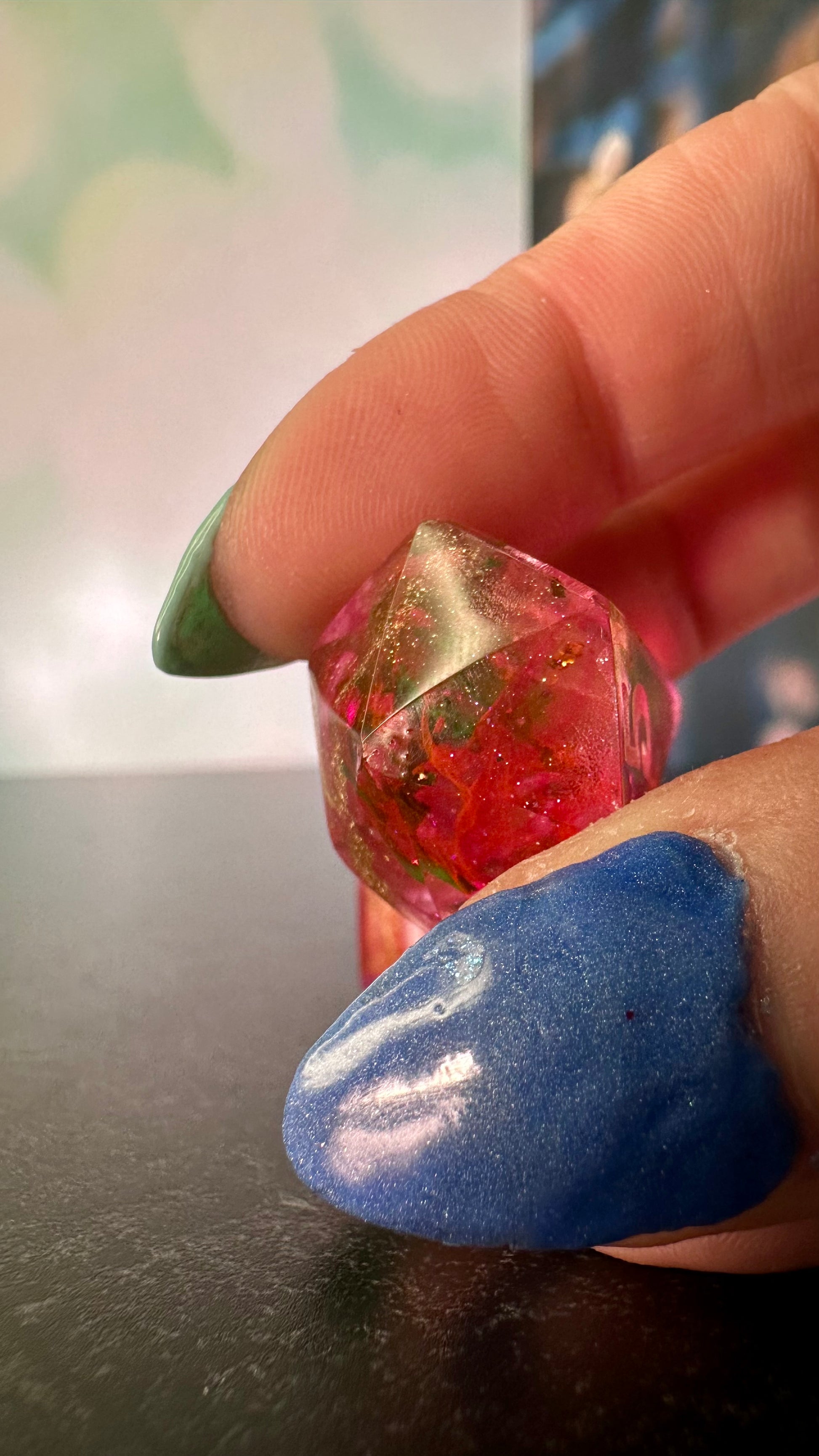 This set of dice is my large masters, a pale purple translucent resin, with swirls of deep violet resin dye, injections of sparkling green colorshift glitter and swirls of gold resin