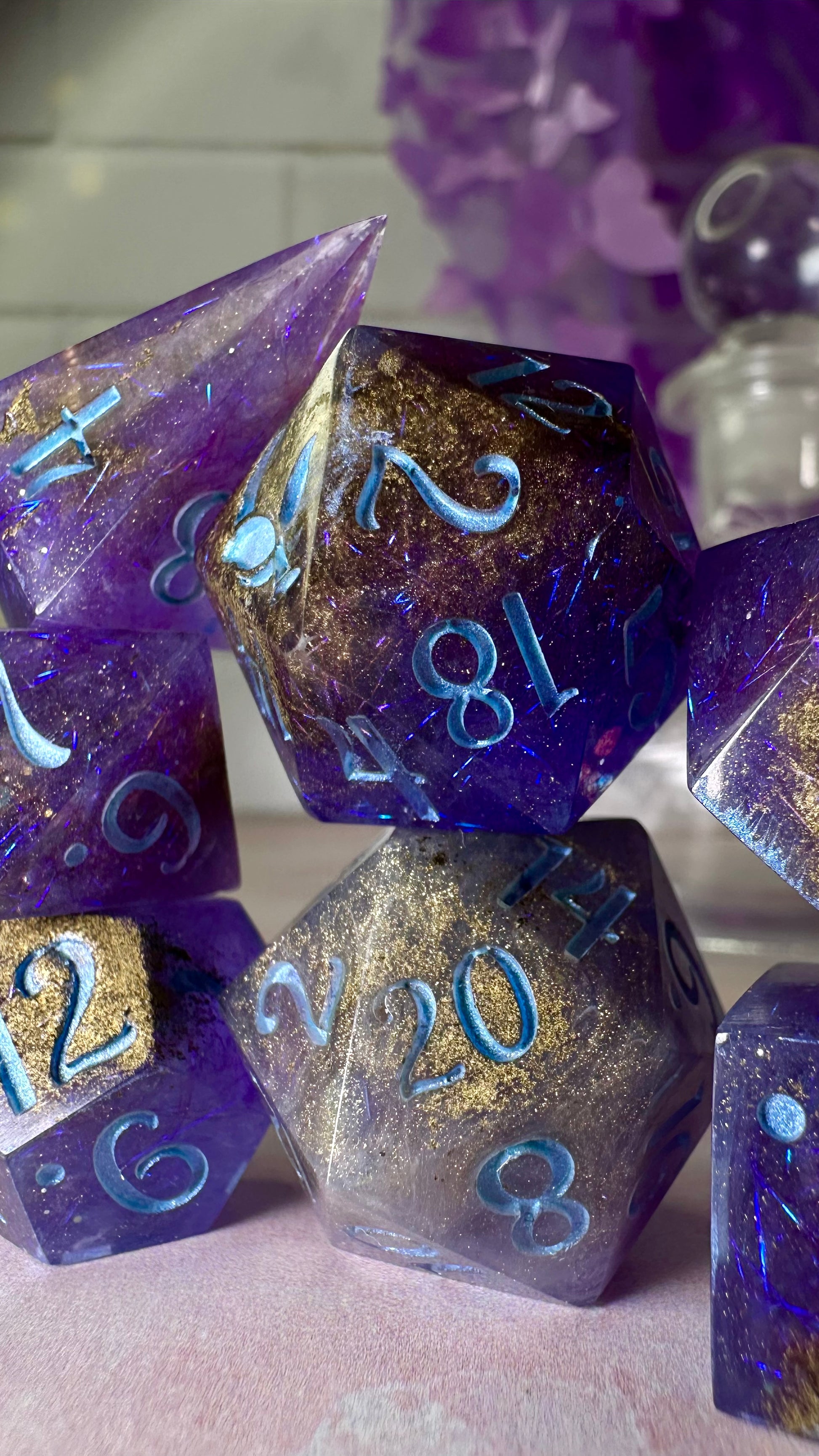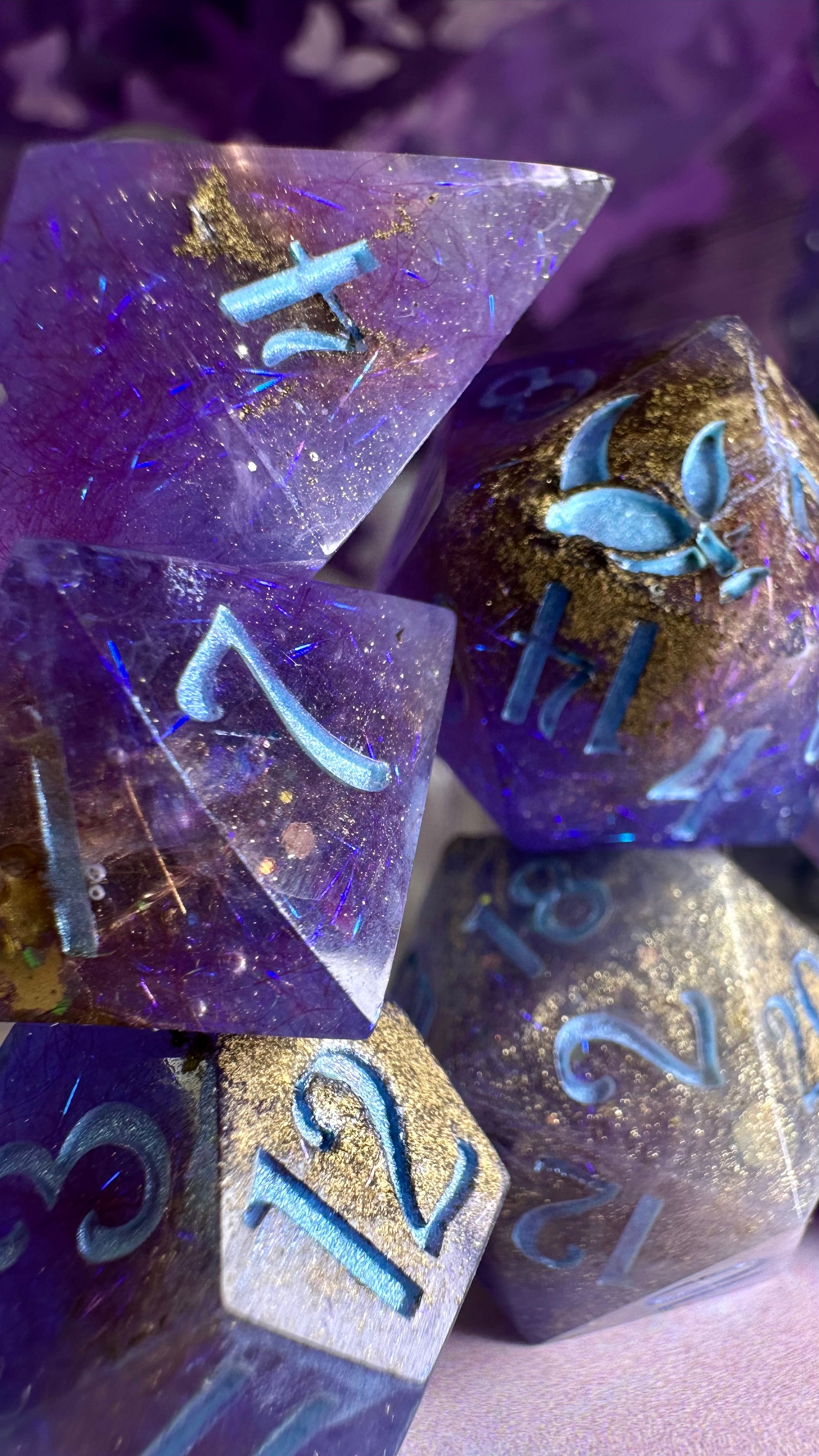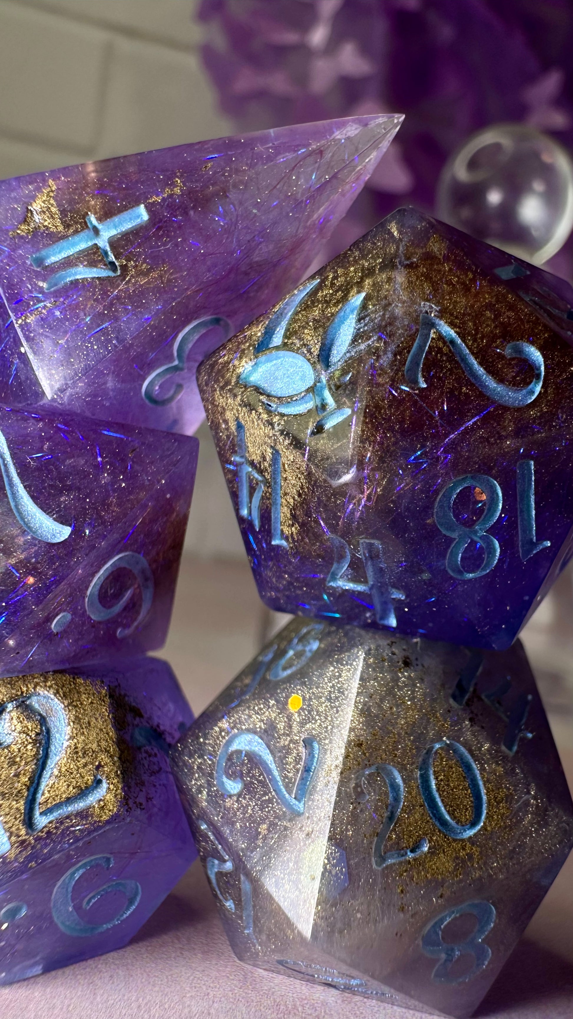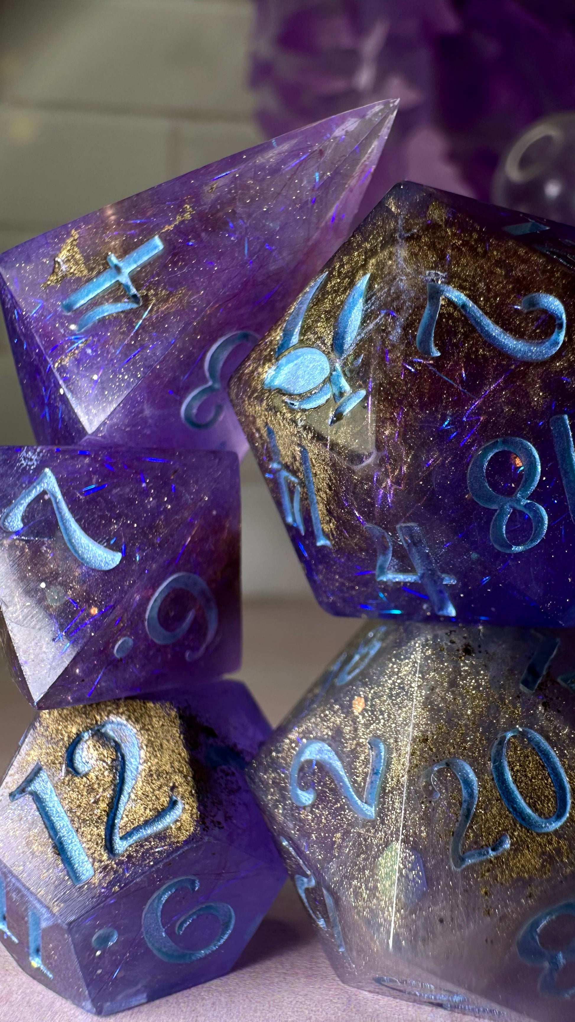 This set was inspired by the moment Francesca meets John for the first time in Season 3 of Bridgerton. A quiet moment, with fireworks in the background. These dice have a base of purple semi-translucent purple resin with threads of iridescent blue angelina fiber. These dice utilize a technique that includes using a floating gold powder, these parts of the dice will be more of a satin/matte texture. As a result these are "Pobody's Nerfect" and final sale. Inked in shimmering Bridgerton blue. Pigments from Dreamland Watercolor, acrylic paint made mixing moonstone and raindrop from Enlightened Watercolors