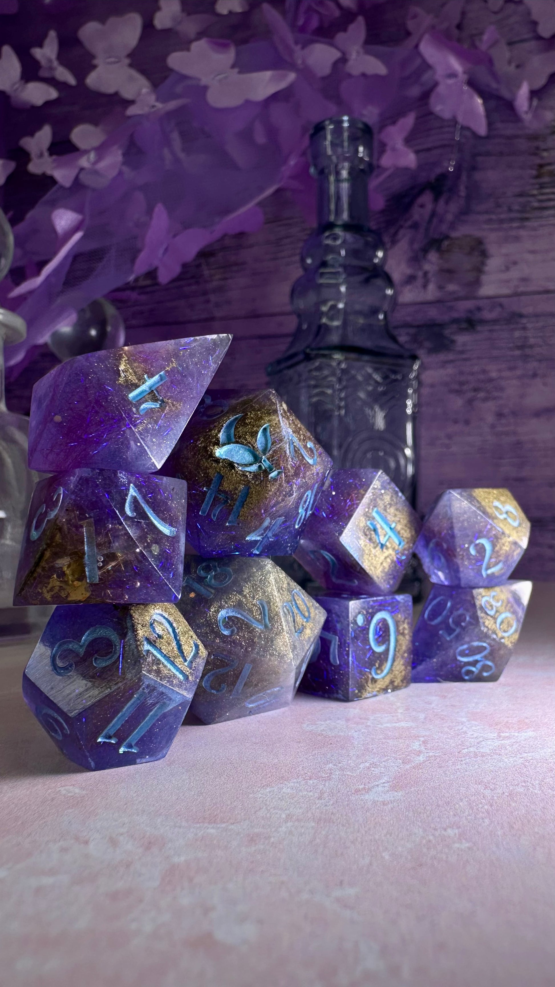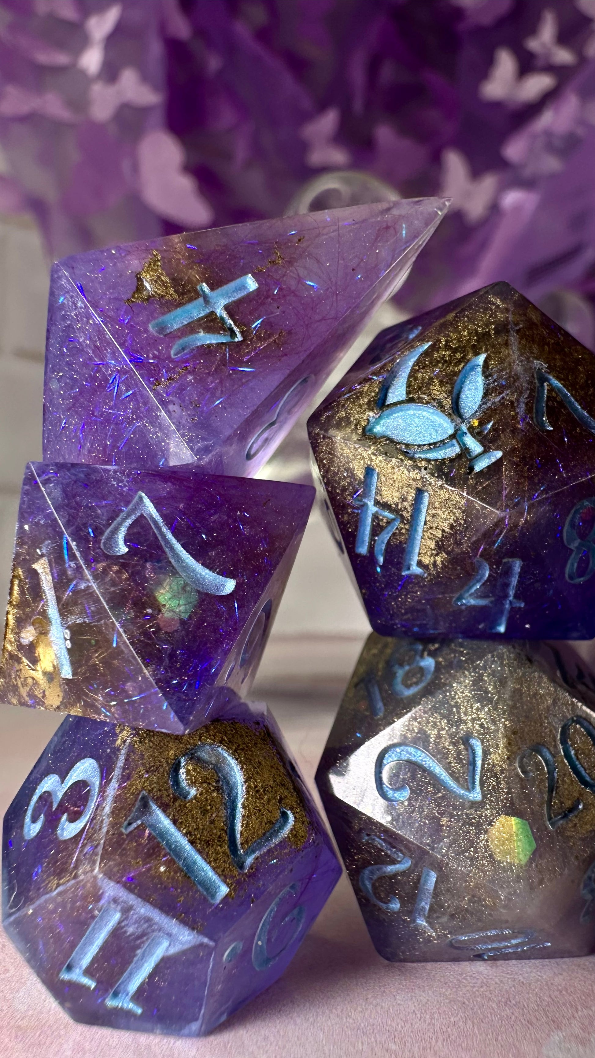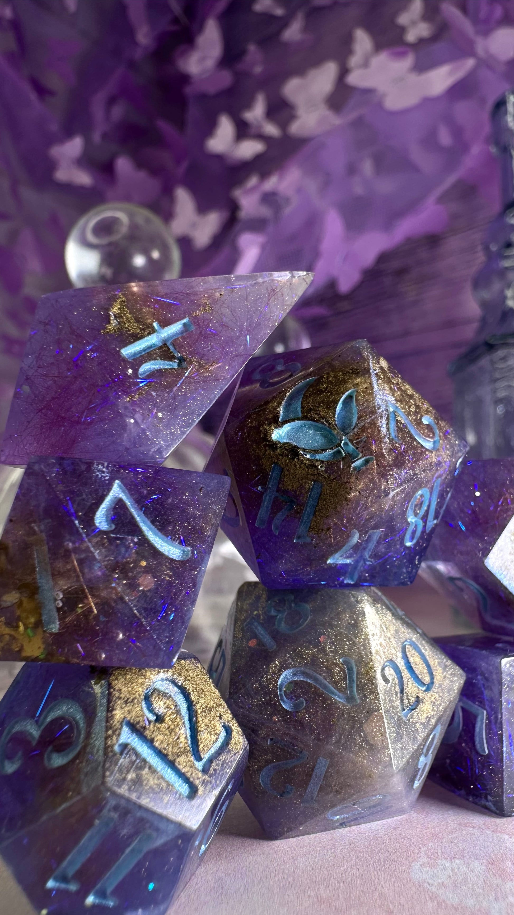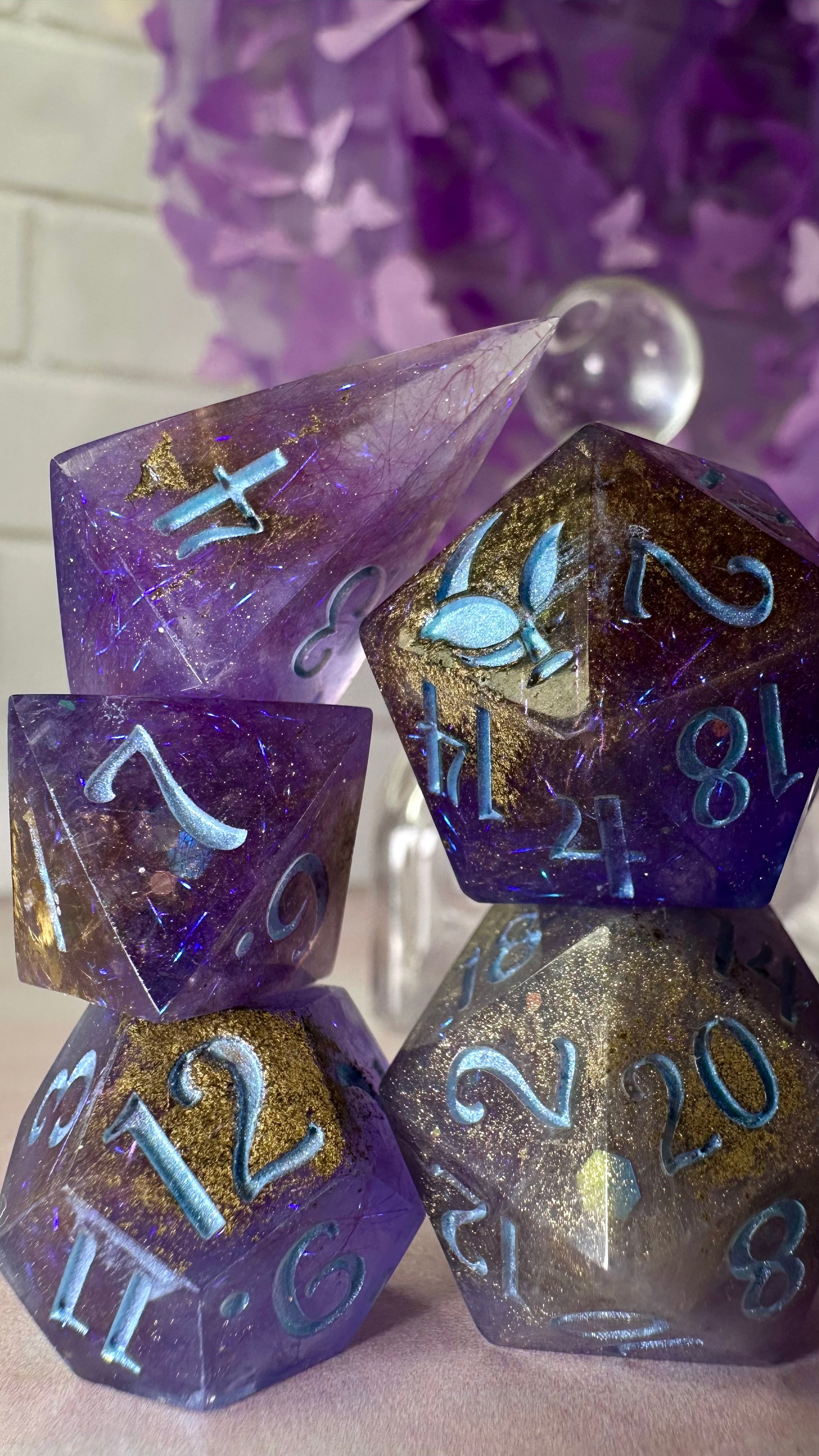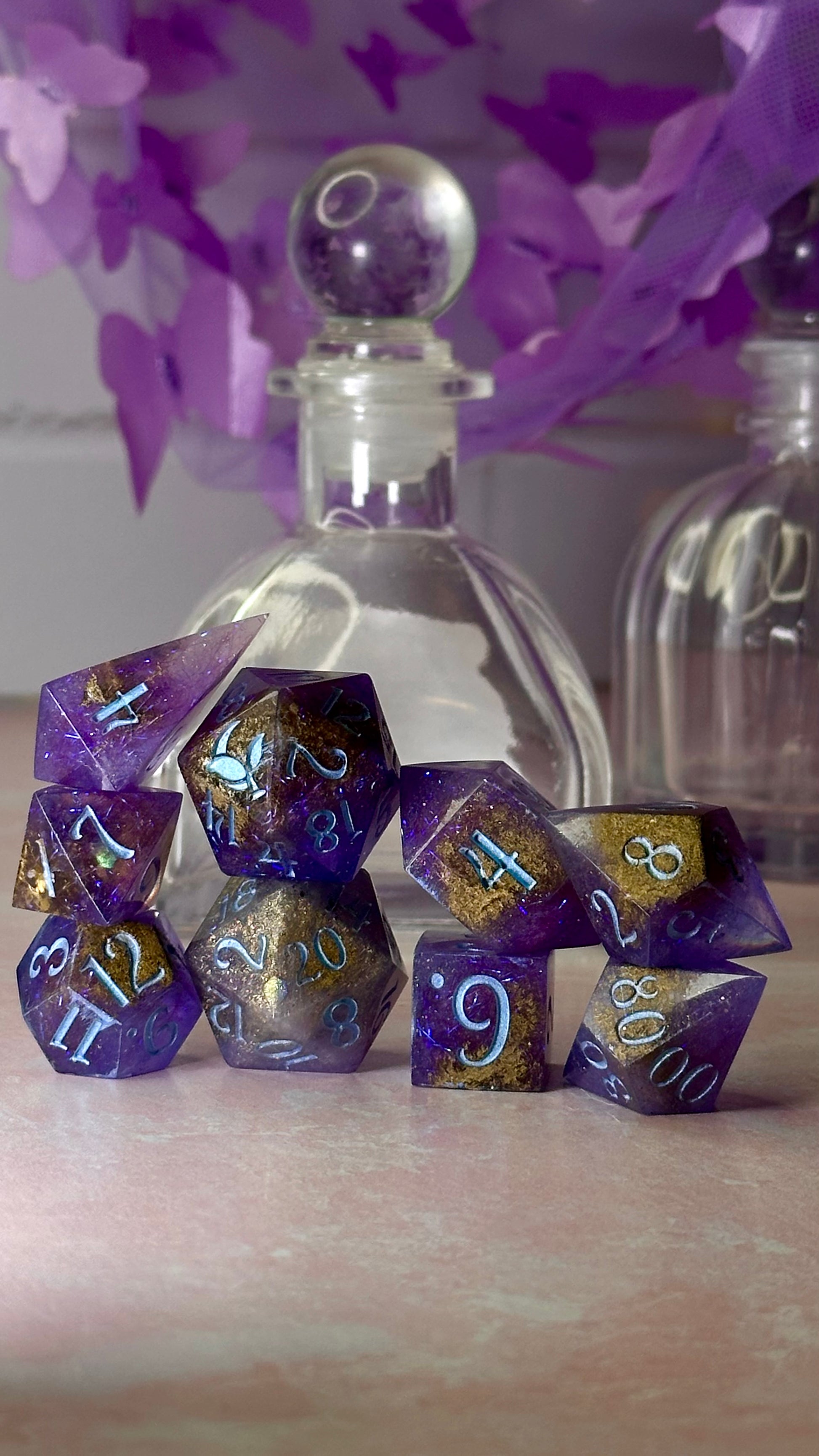 This set was inspired by the moment Francesca meets John for the first time in Season 3 of Bridgerton. A quiet moment, with fireworks in the background. These dice have a base of purple semi-translucent purple resin with threads of iridescent blue angelina fiber. These dice utilize a technique that includes using a floating gold powder, these parts of the dice will be more of a satin/matte texture. As a result these are "Pobody's Nerfect" and final sale. Inked in shimmering Bridgerton blue. Pigments from Dreamland Watercolor, acrylic paint made mixing moonstone and raindrop from Enlightened Watercolors