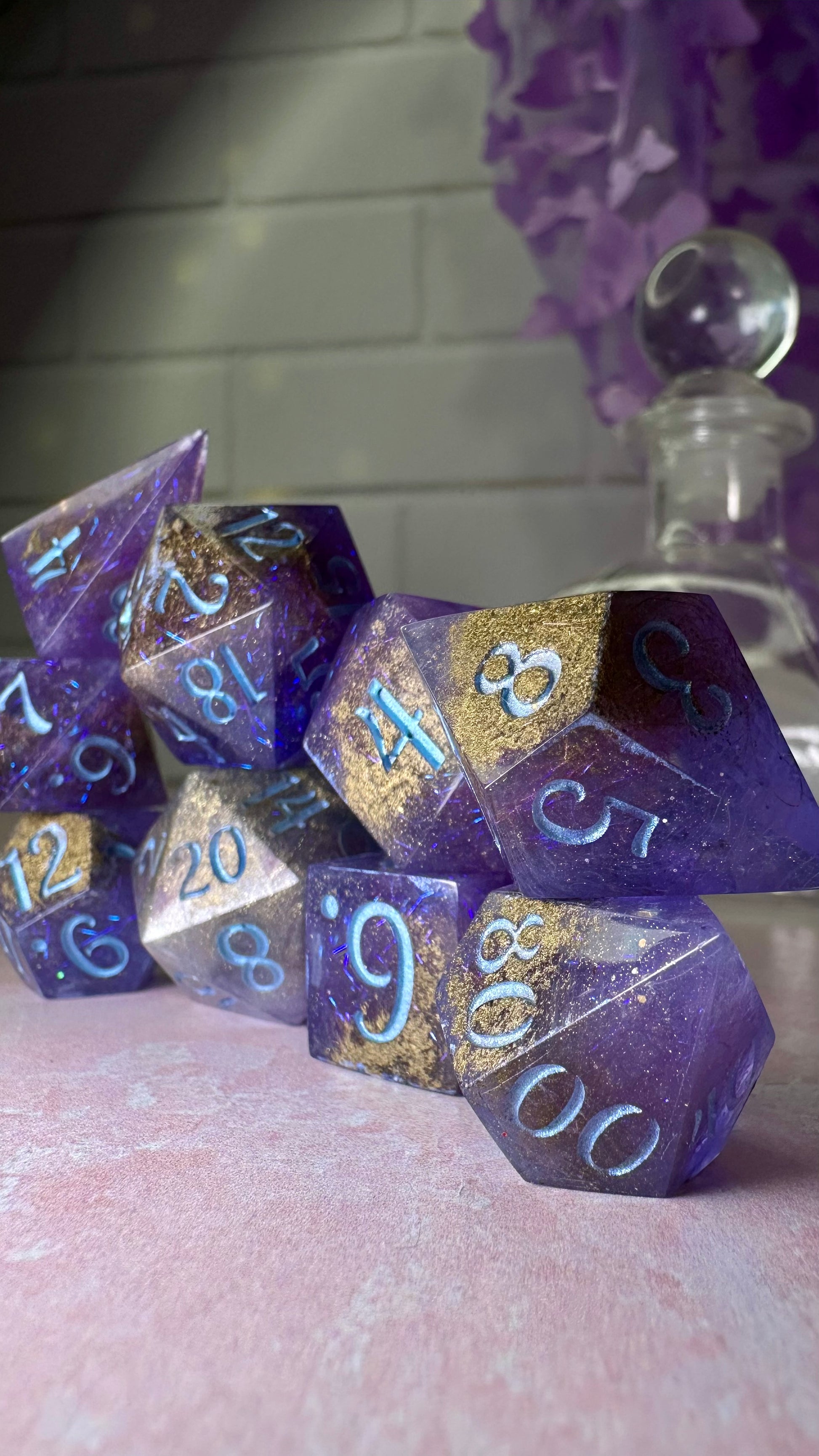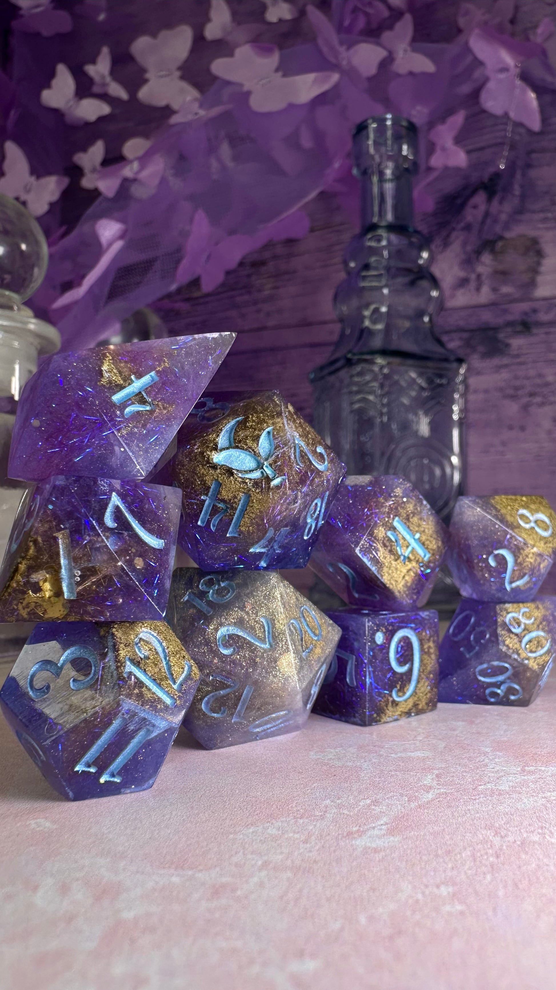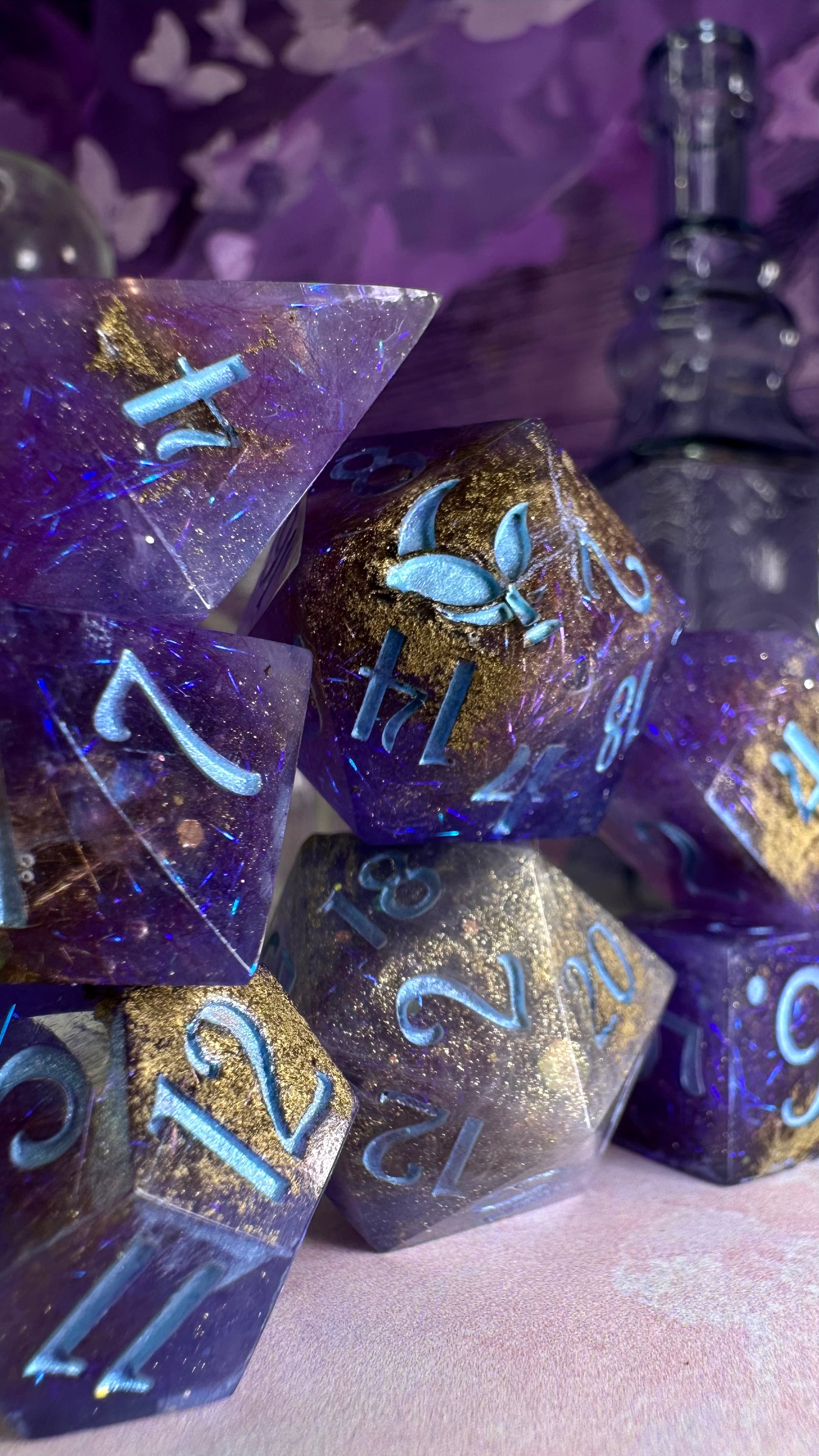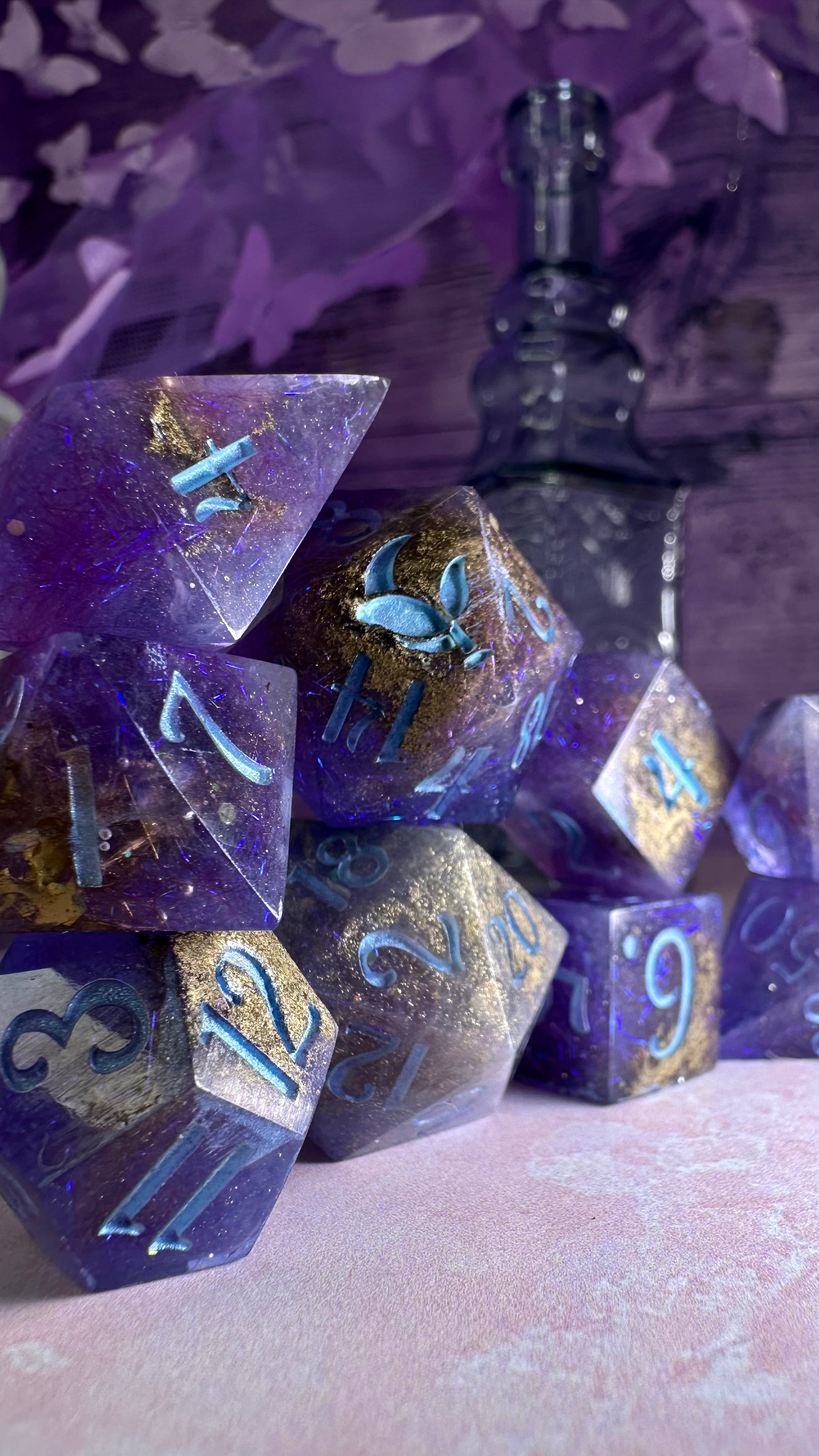 This set was inspired by the moment Francesca meets John for the first time in Season 3 of Bridgerton. A quiet moment, with fireworks in the background. These dice have a base of purple semi-translucent purple resin with threads of iridescent blue angelina fiber. These dice utilize a technique that includes using a floating gold powder, these parts of the dice will be more of a satin/matte texture. As a result these are "Pobody's Nerfect" and final sale. Inked in shimmering Bridgerton blue. Pigments from Dreamland Watercolor, acrylic paint made mixing moonstone and raindrop from Enlightened Watercolors
