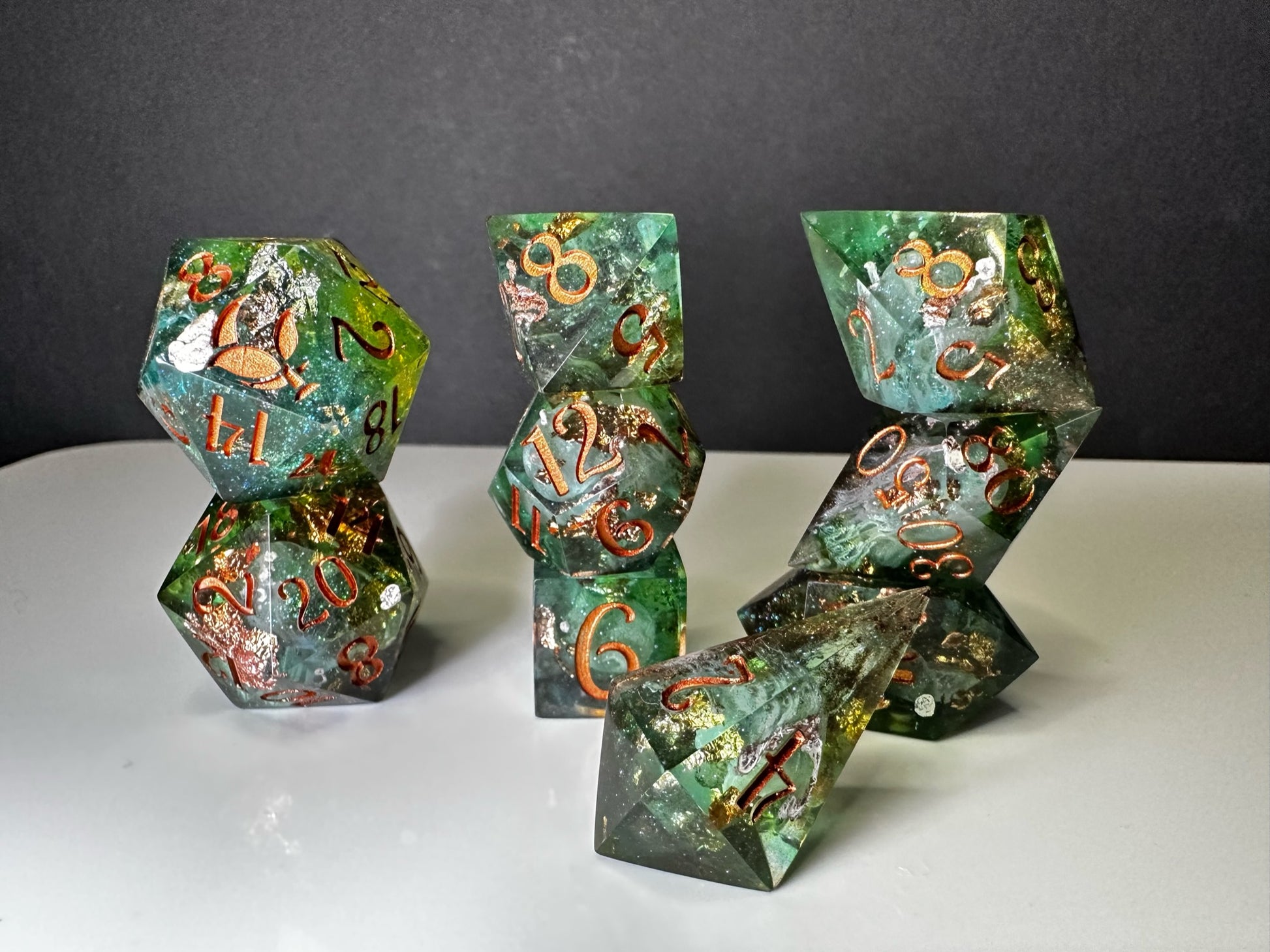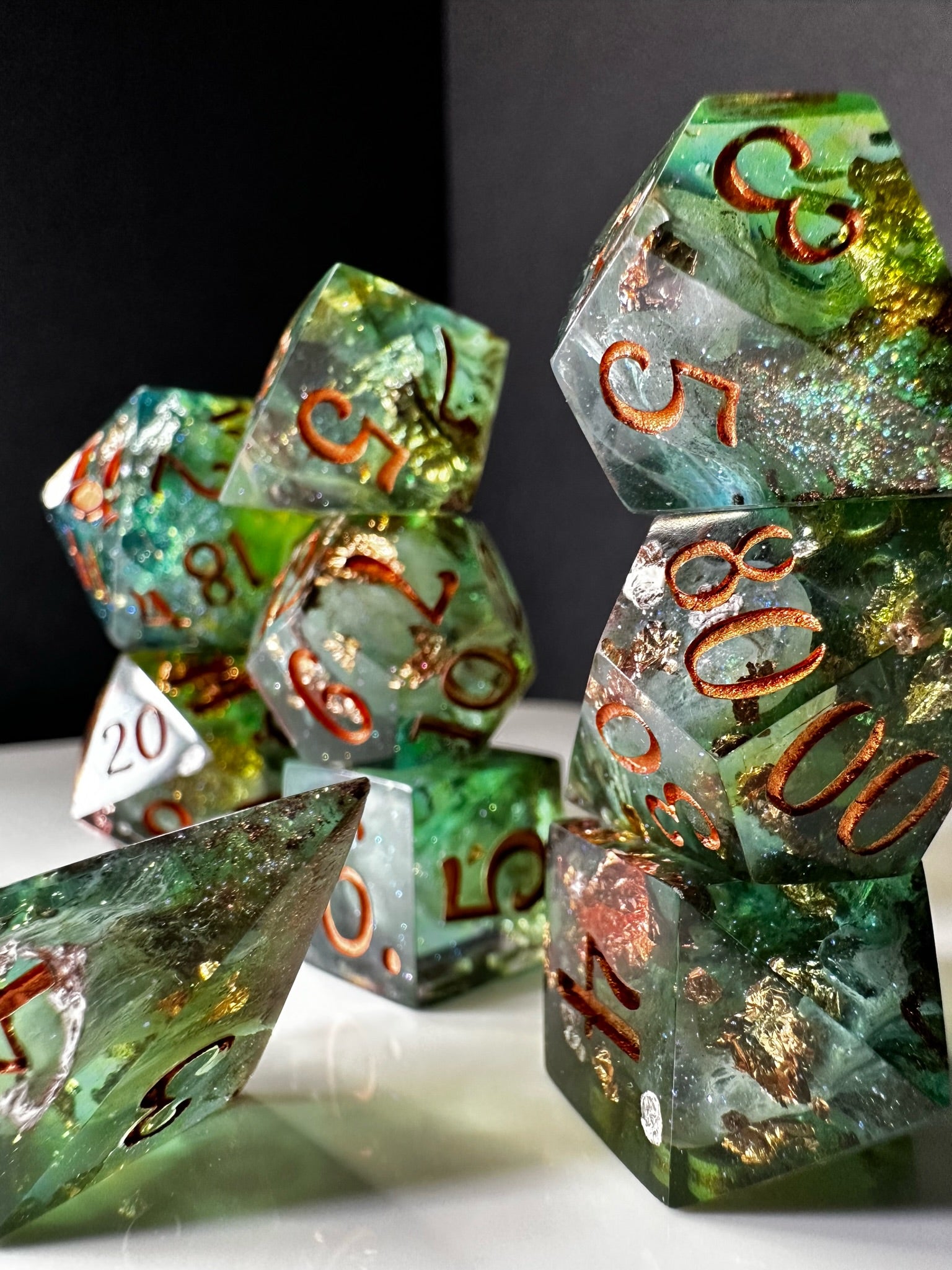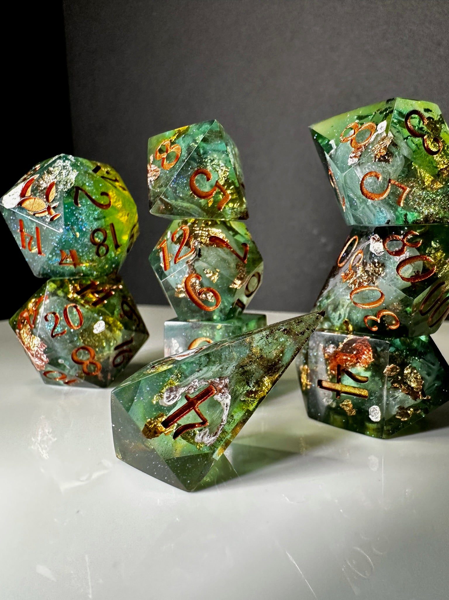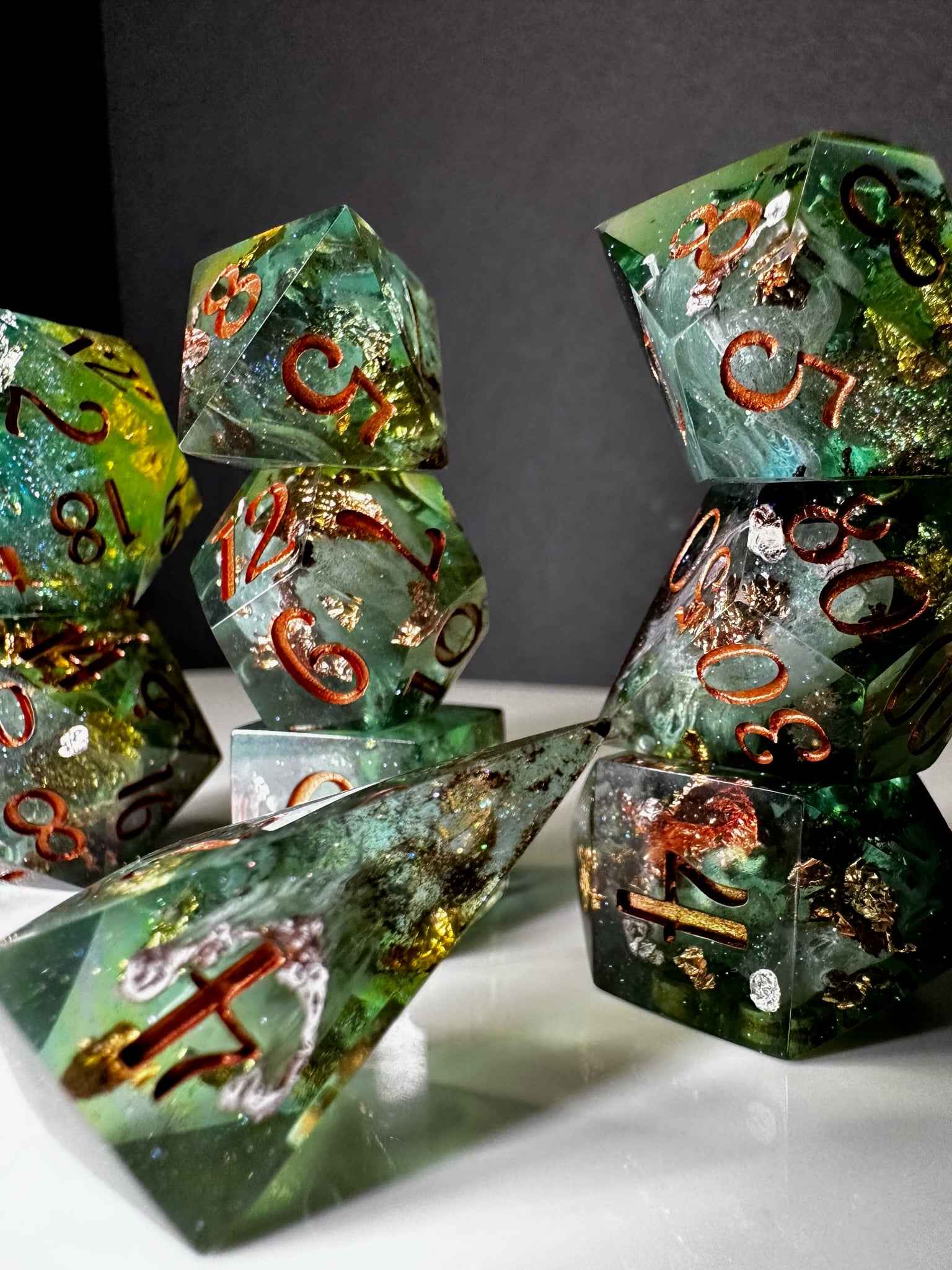 -These dice are bespoke handmade functional art pieces. This means they are not flawless ; they will have some small cosmetic flaws (small bubbles on the surface or in the dice themselves, micro-scratches on the surface, mold or inclusion marks, and carved in numbers. Some dice will have been patched with additional resin. This can cause small variations in color/visual lines) Anything worse than these flaws will be discounted and marked as such