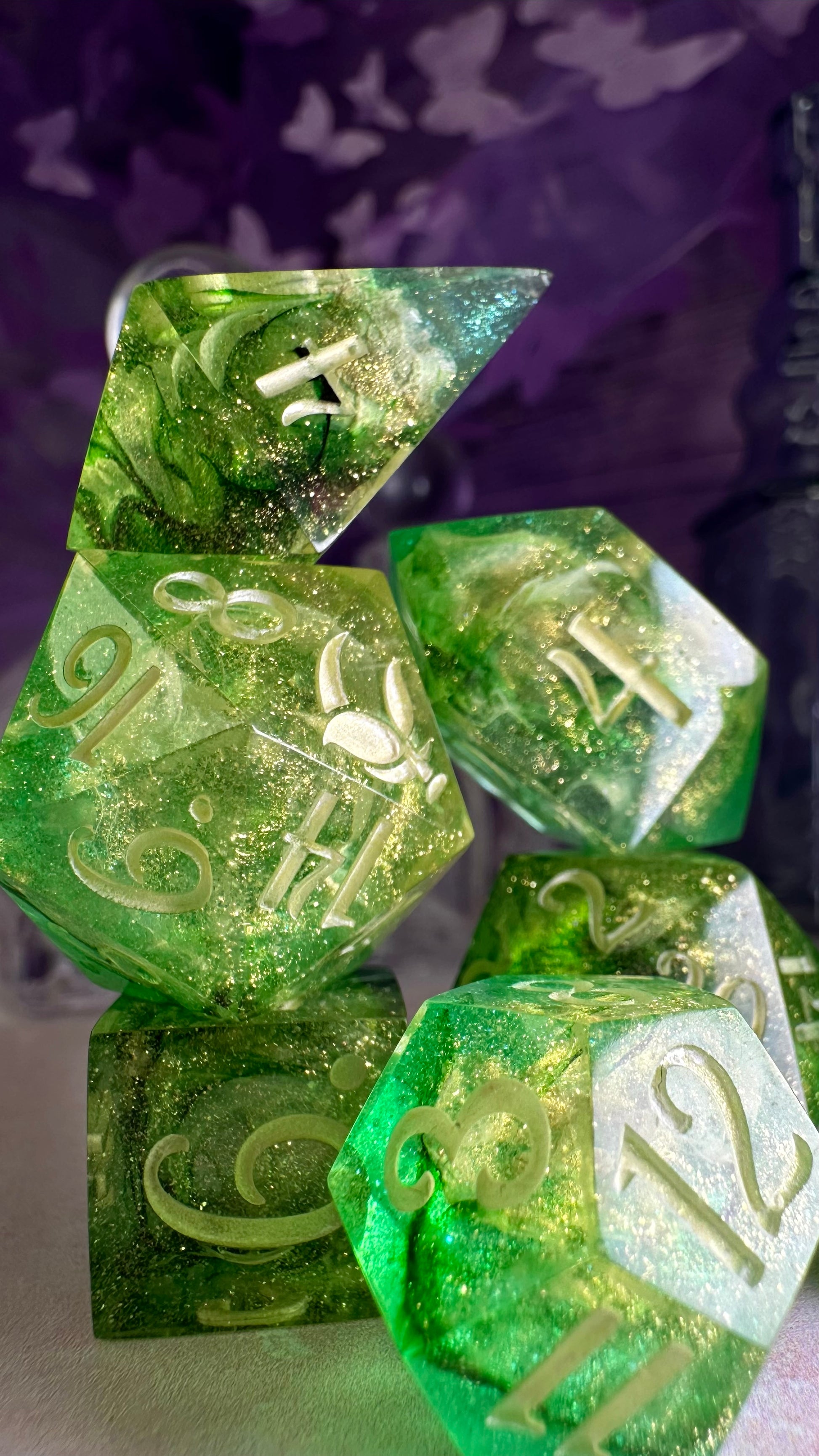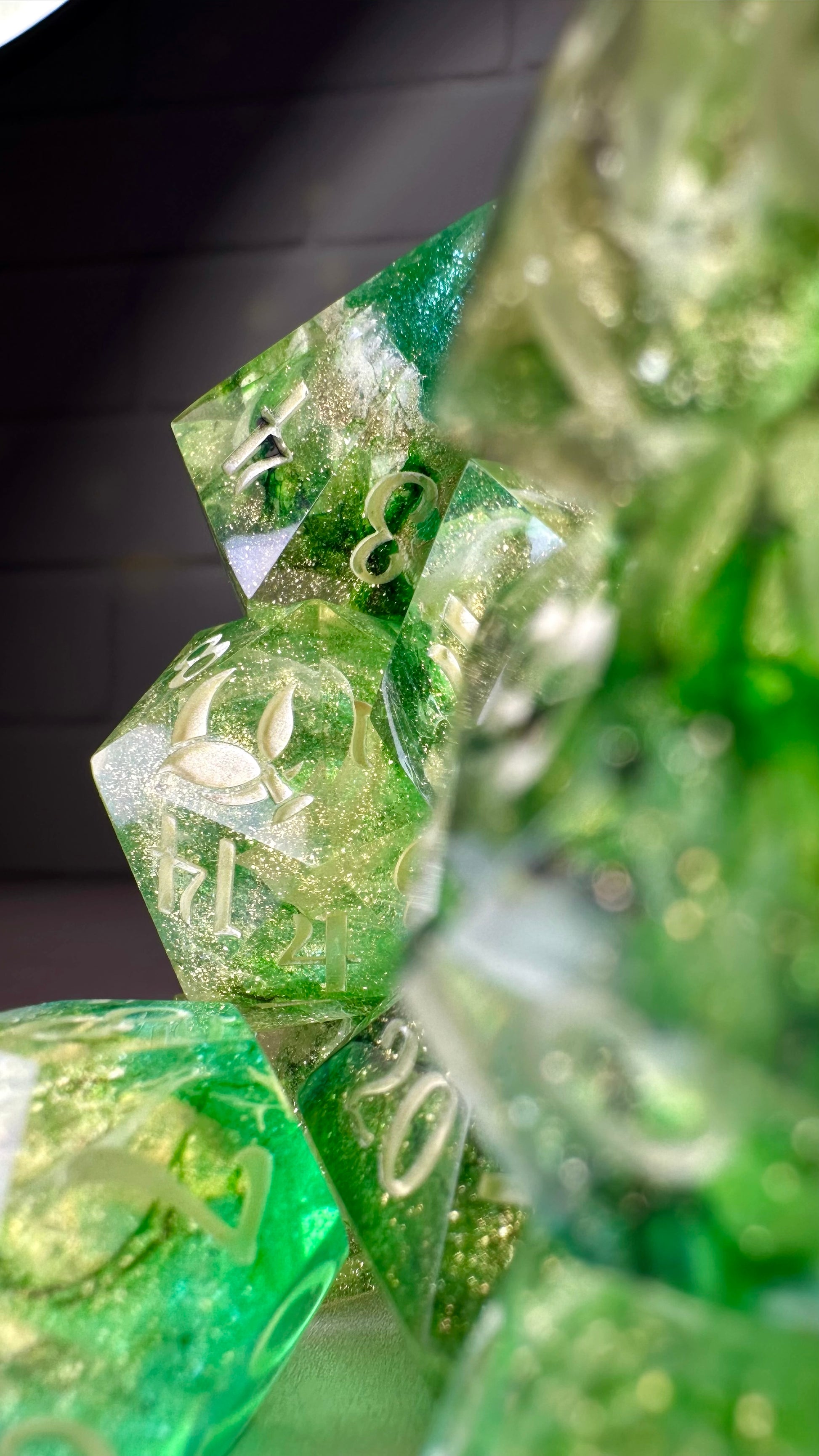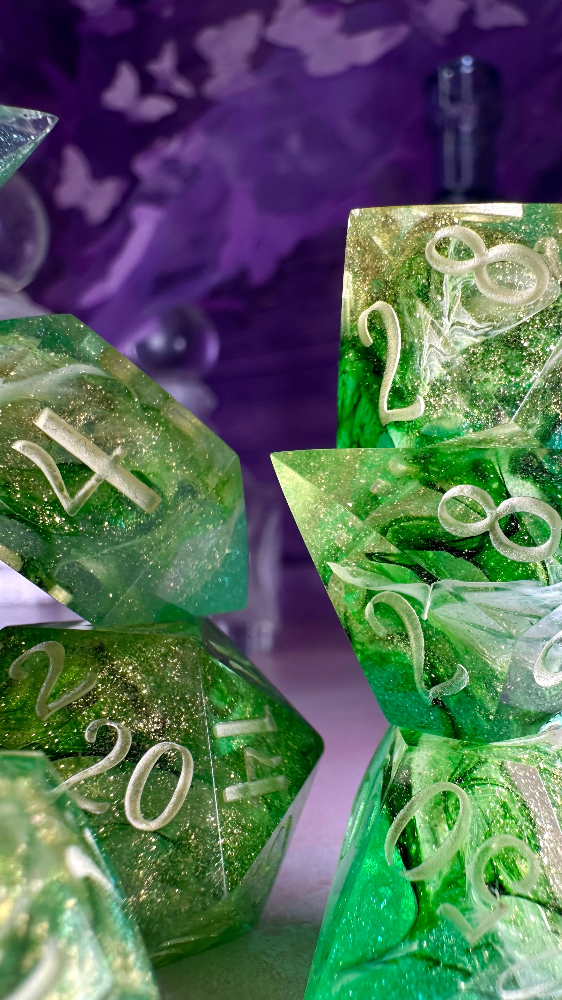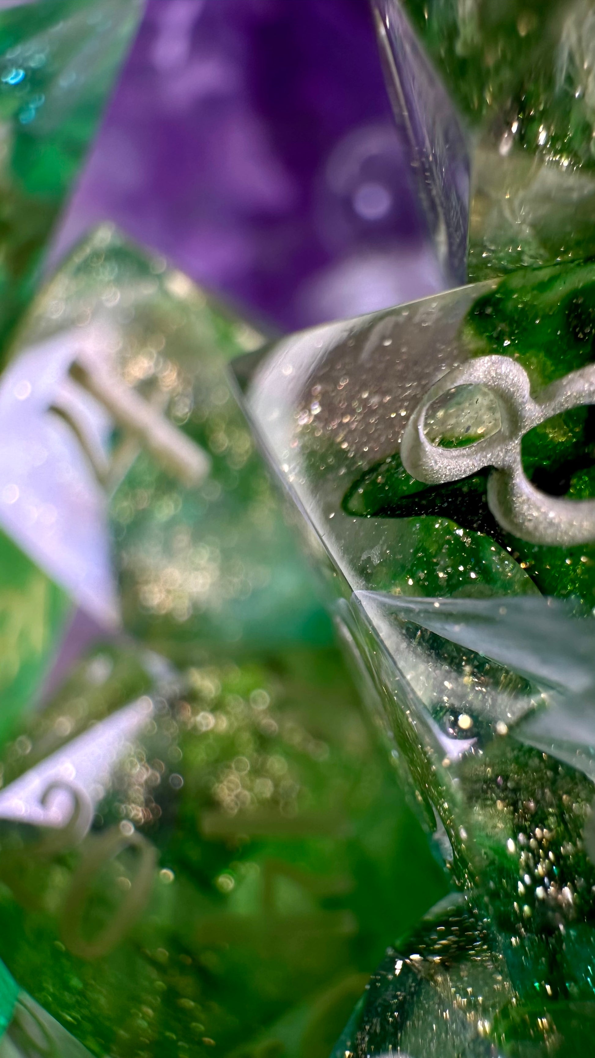 This set was inspired by Colin's Dream about Penelope funding her new wardrobe from her pin money in Season 3 of Bridgerton. A base of crystal clear yellow resin, with dark green swirls of alcohol ink and dense yellow sparkles. Backed with a layer of spring green resin packed with bright green shimmer. Pigments from Dreamland Watercolor.