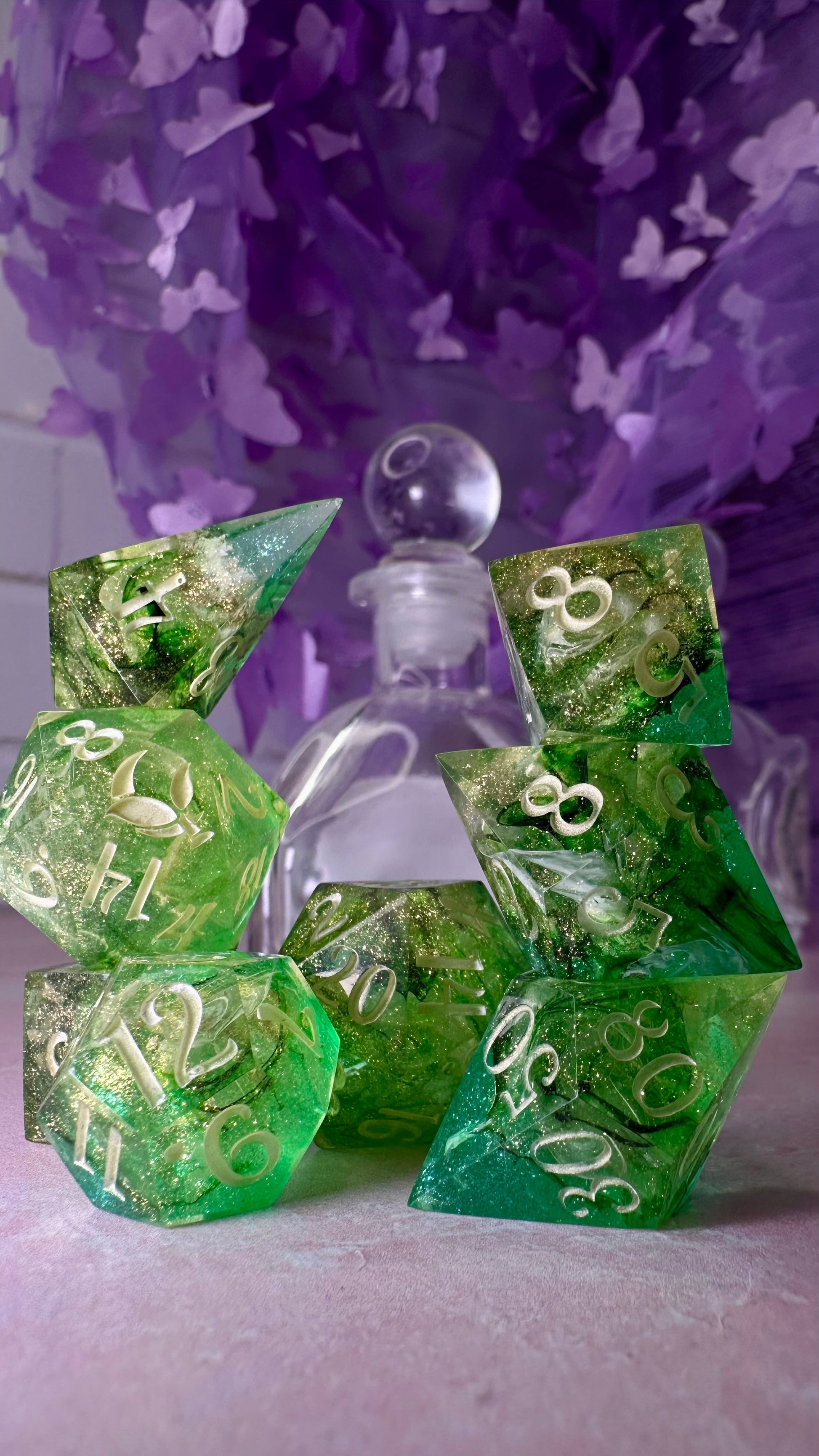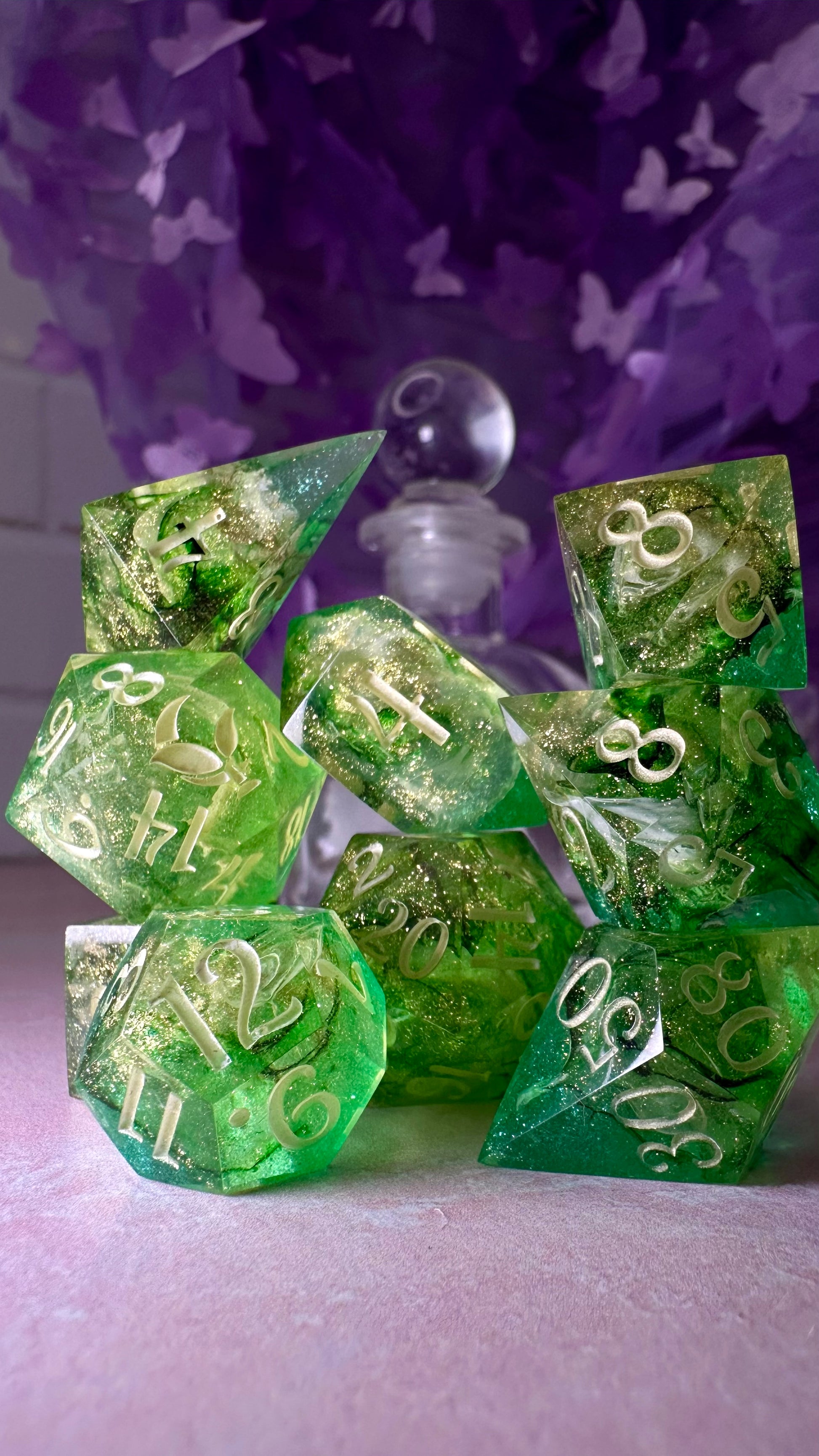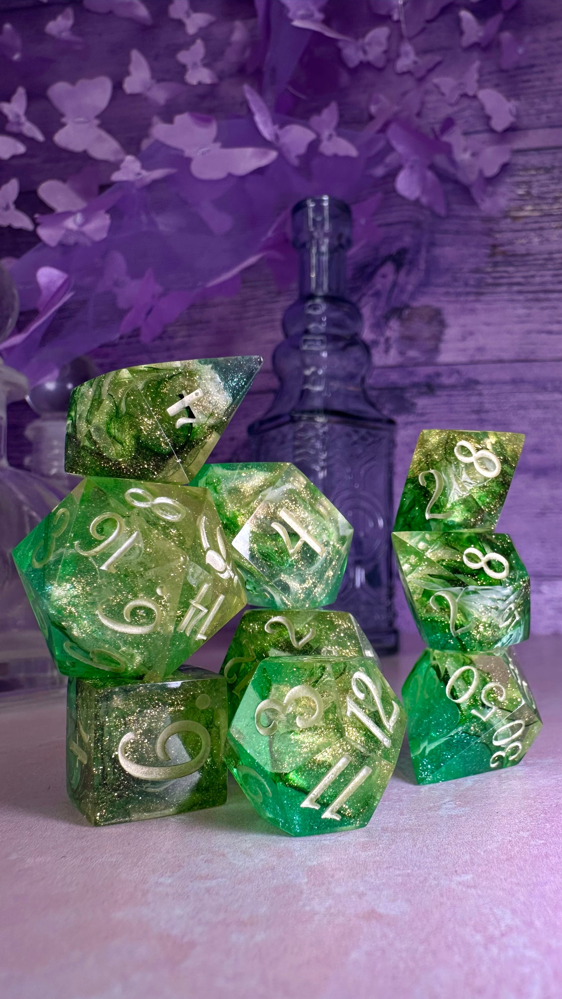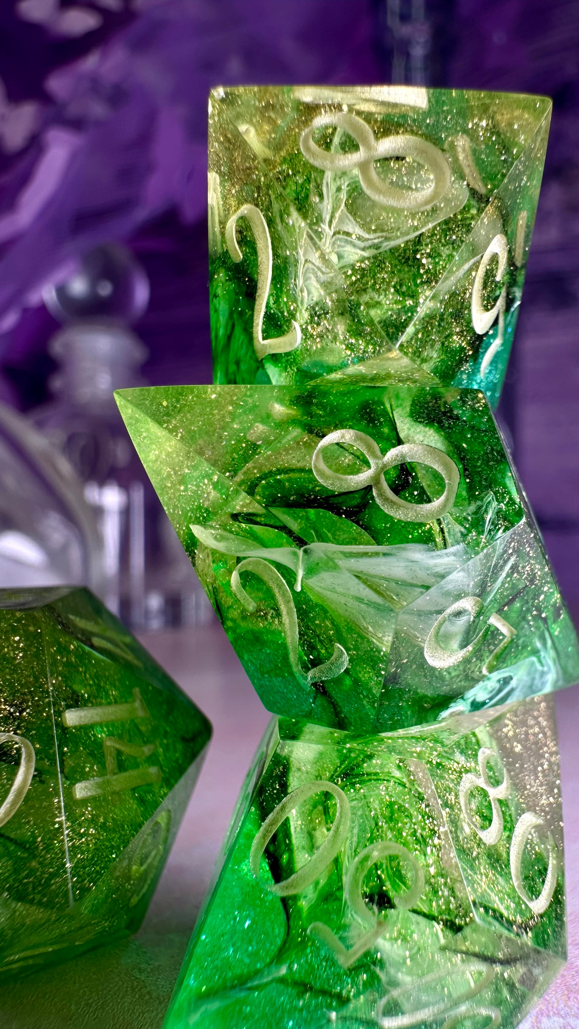 This set was inspired by Colin's Dream about Penelope funding her new wardrobe from her pin money in Season 3 of Bridgerton. A base of crystal clear yellow resin, with dark green swirls of alcohol ink and dense yellow sparkles. Backed with a layer of spring green resin packed with bright green shimmer. Pigments from Dreamland Watercolor.