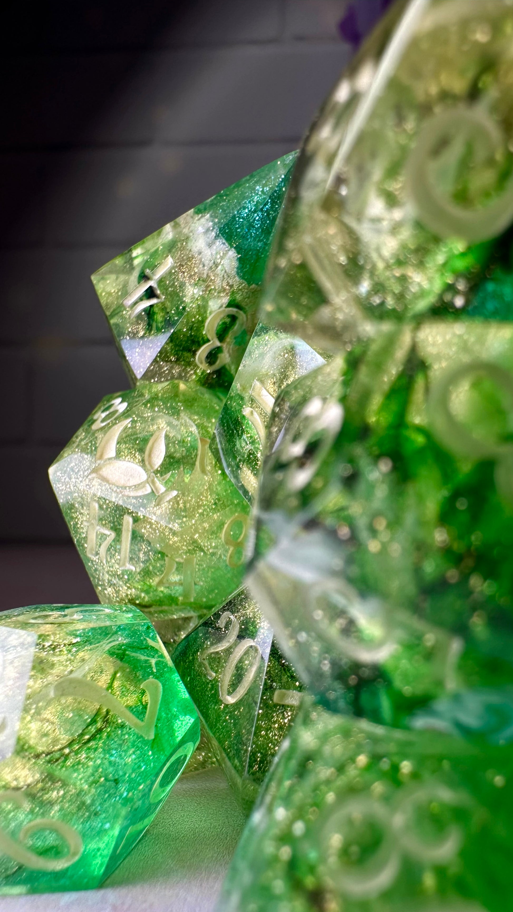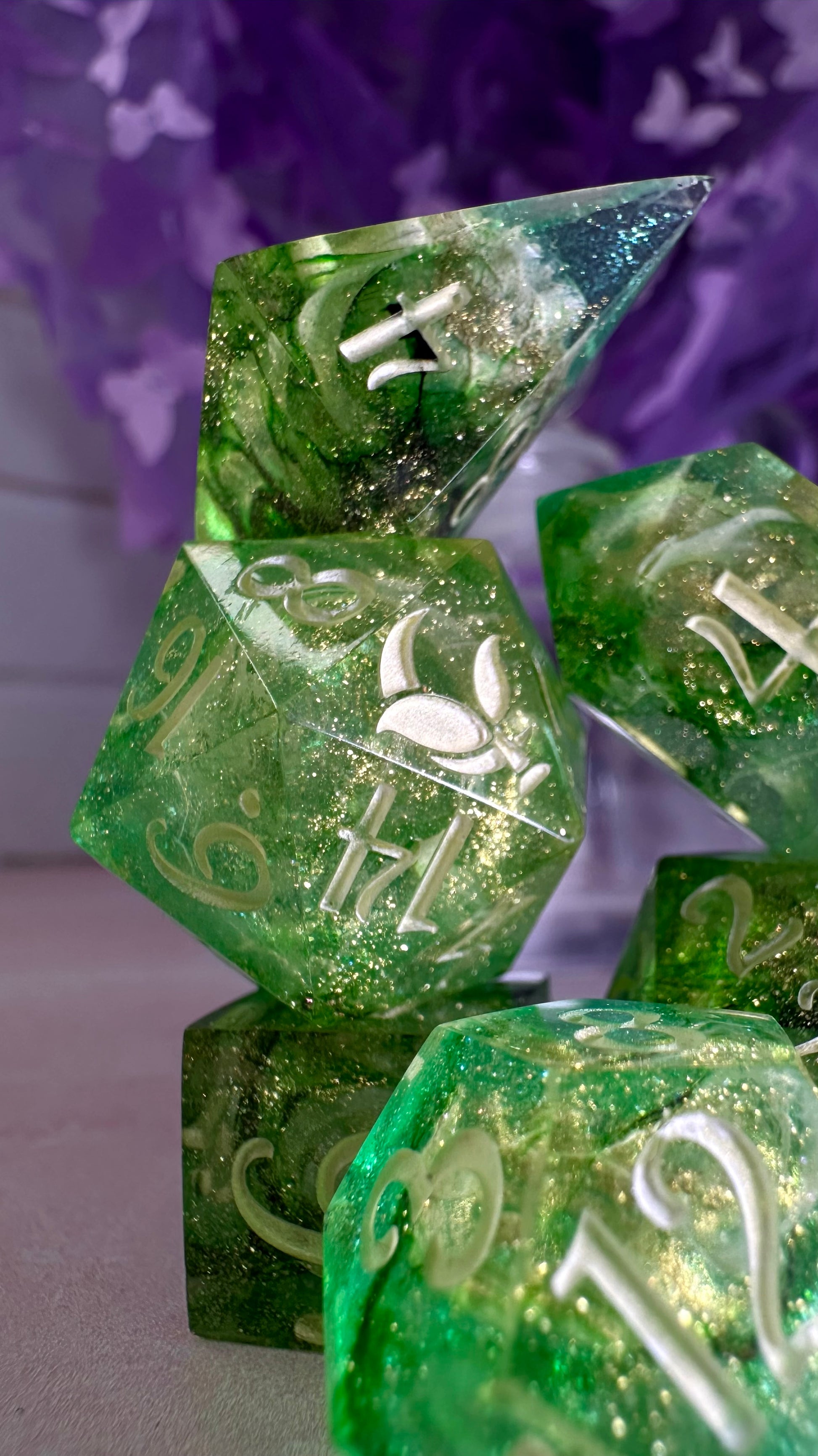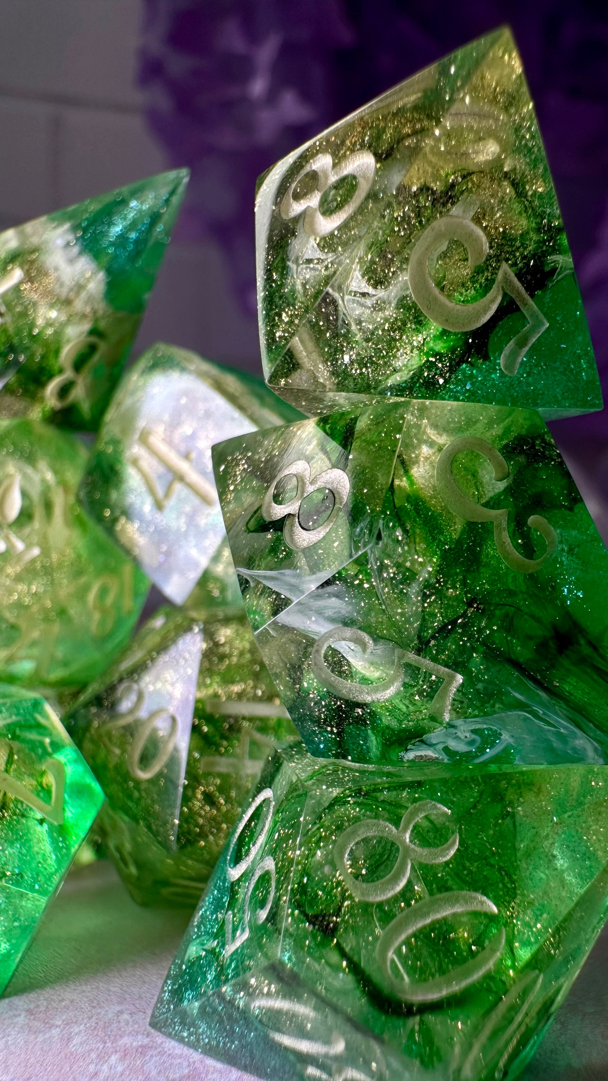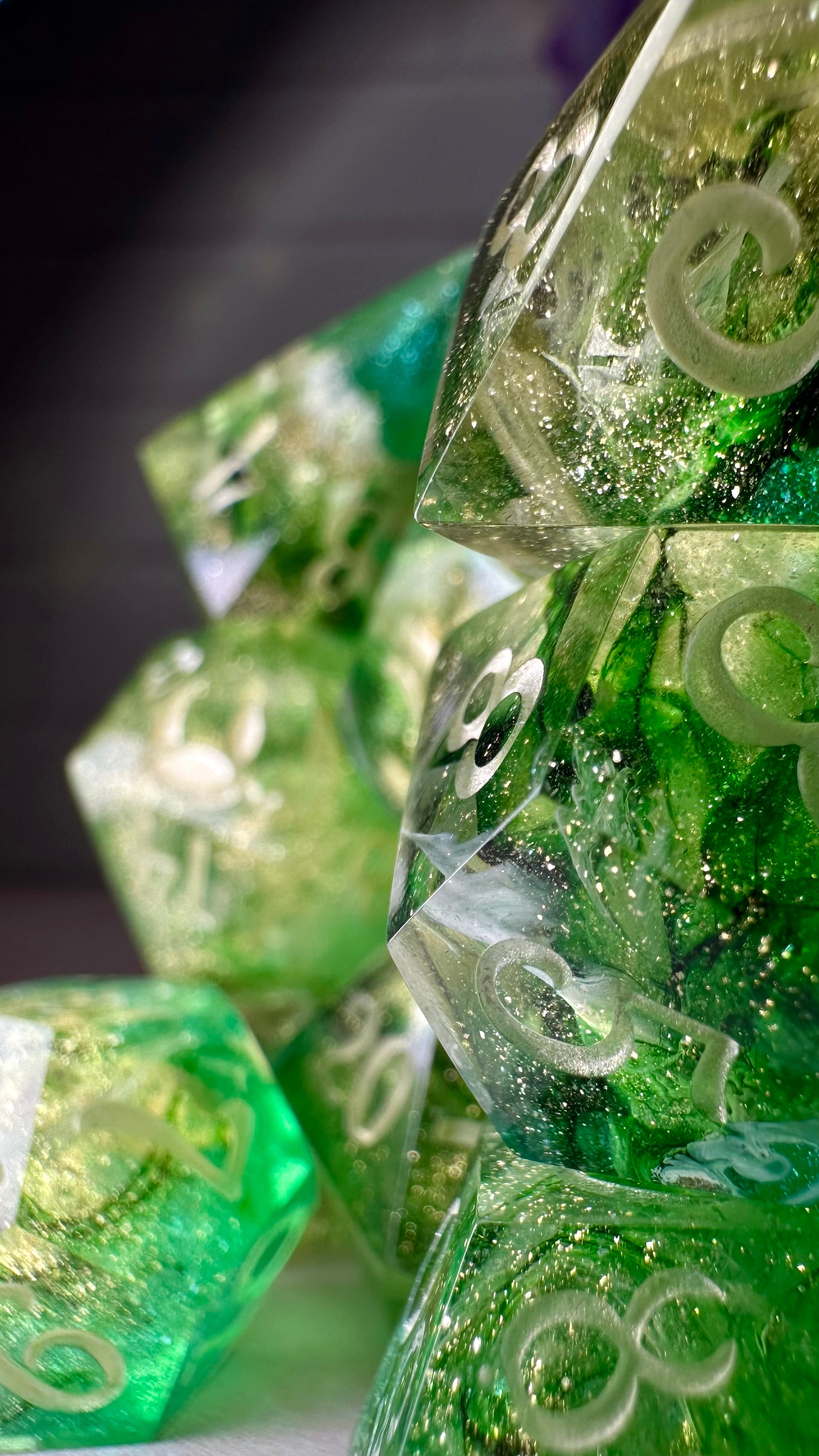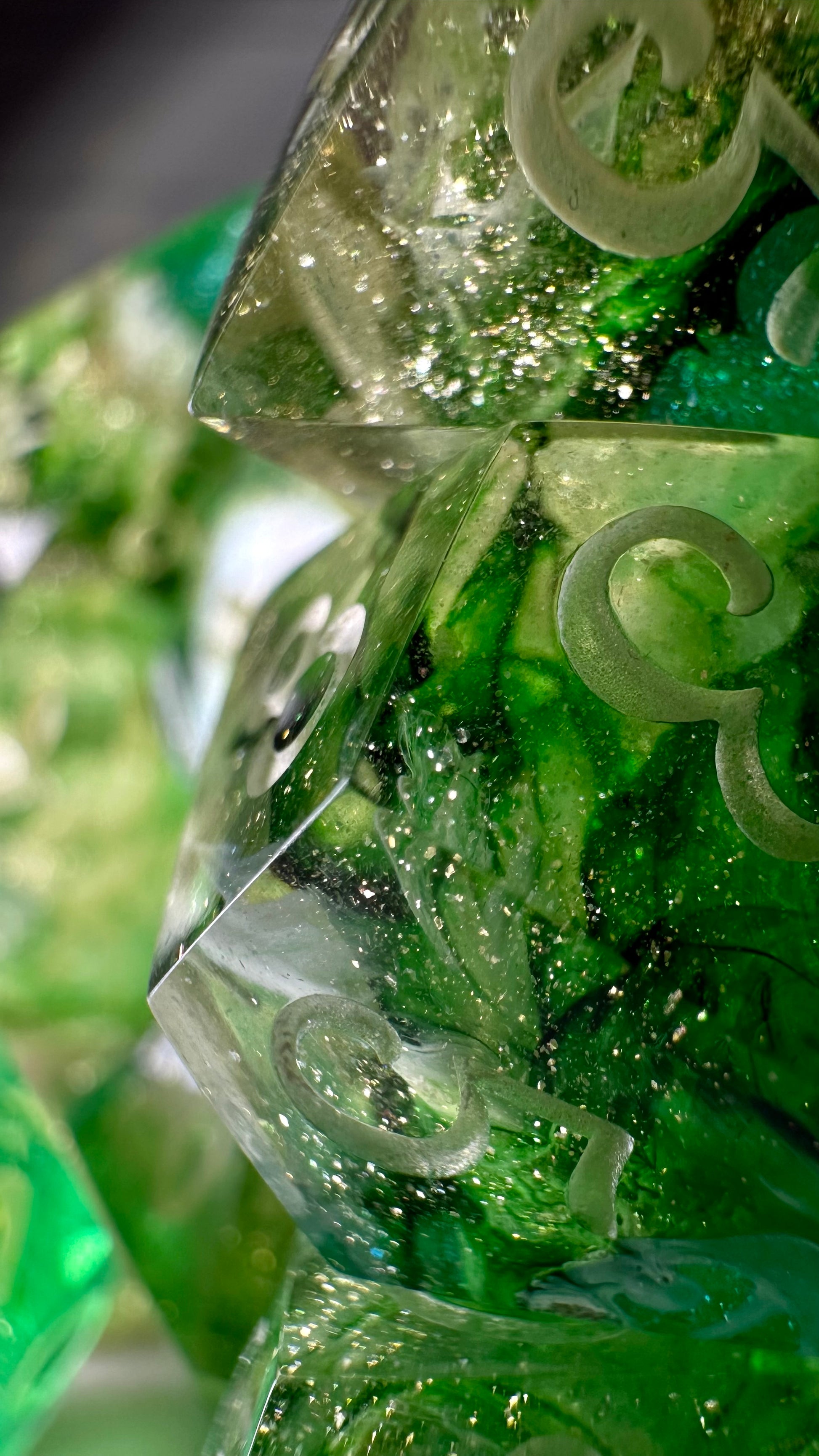 -These dice are bespoke handmade functional art pieces. This means they are not flawless ; they will have some small cosmetic flaws (small bubbles on the surface or in the dice themselves, micro-scratches on the surface, mold or inclusion marks, and carved in numbers. Some dice will have been patched with additional resin. This can cause small variations in color/visual lines) Anything worse than these flaws will be discounted and marked as such