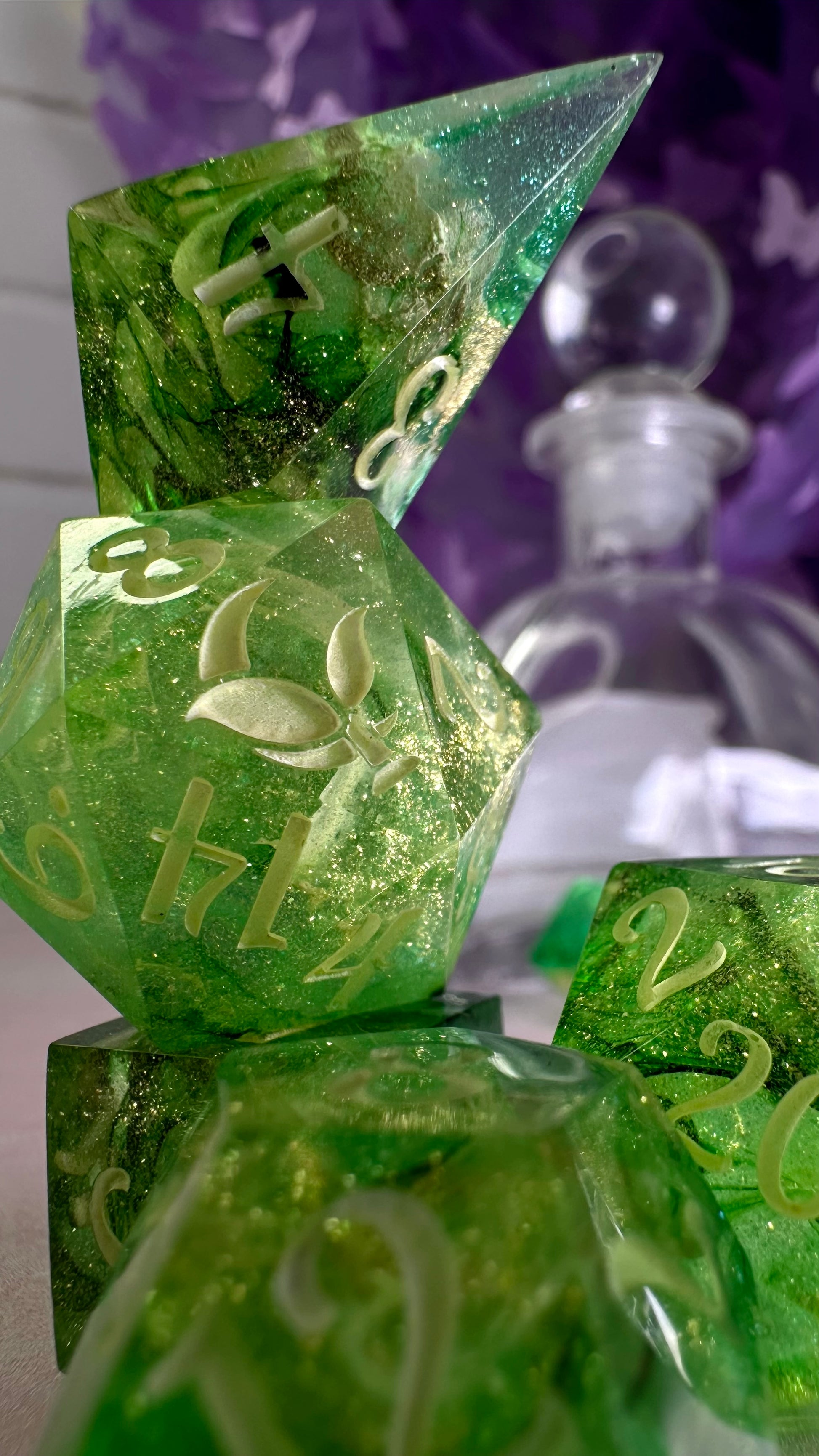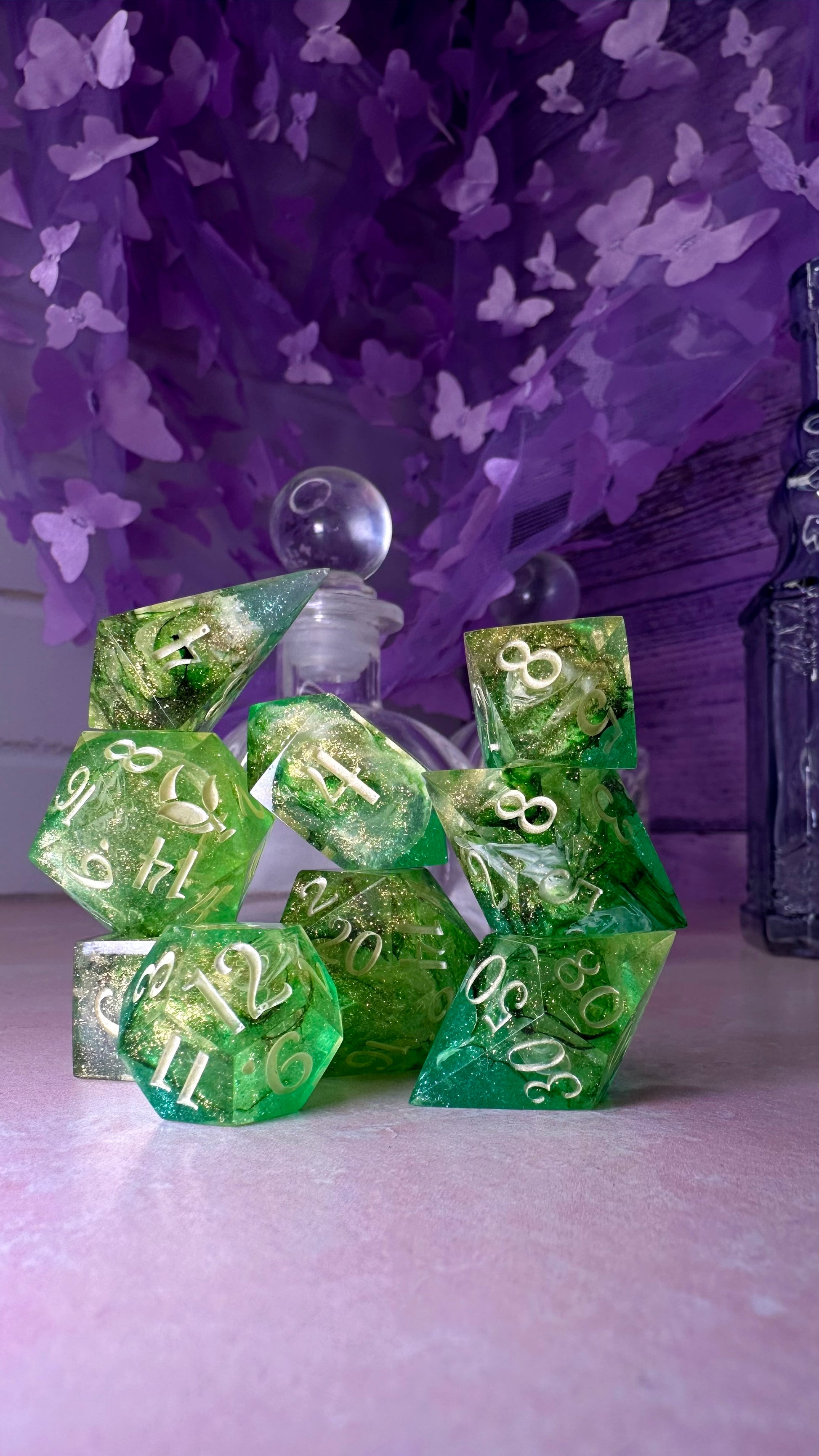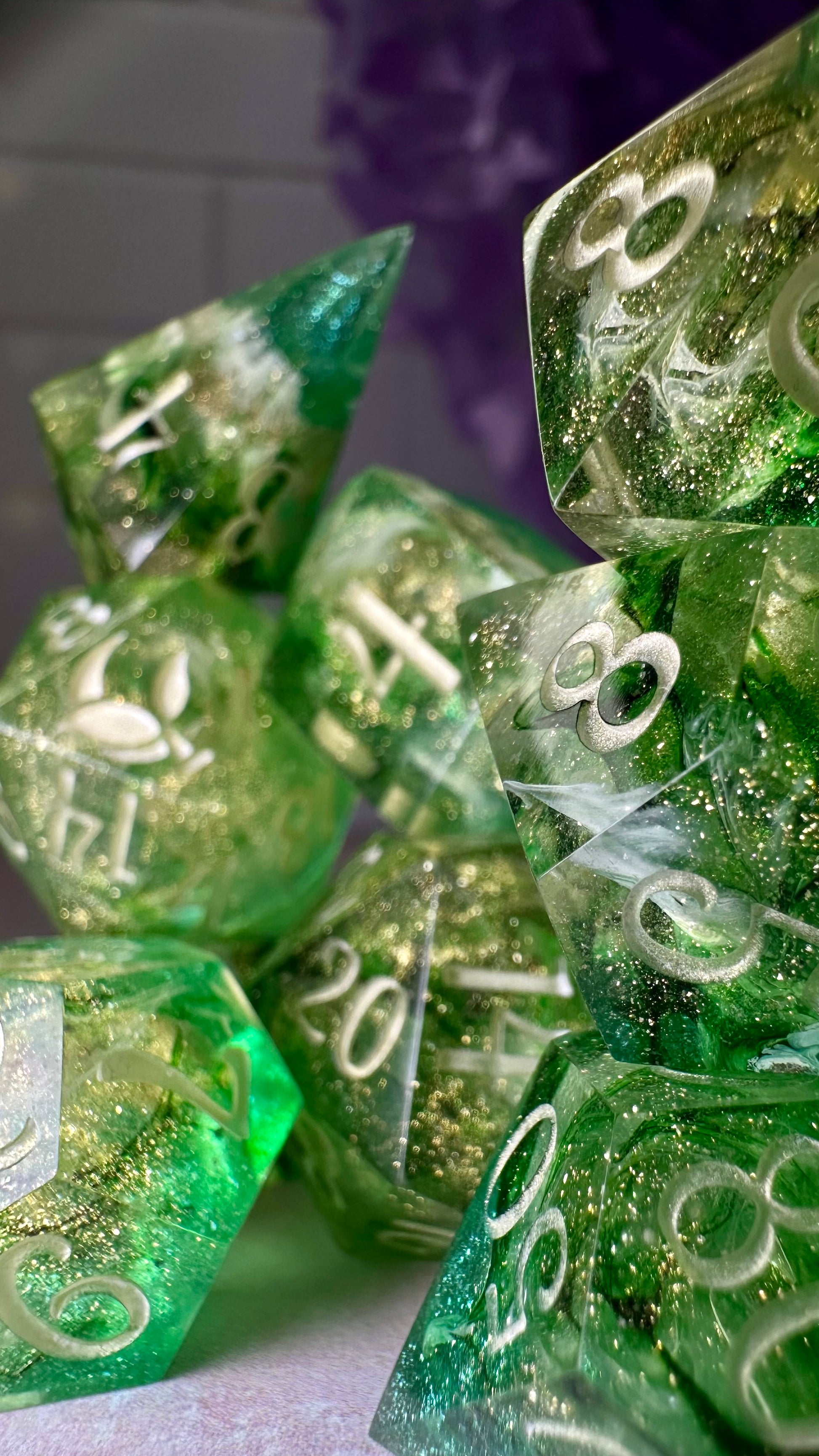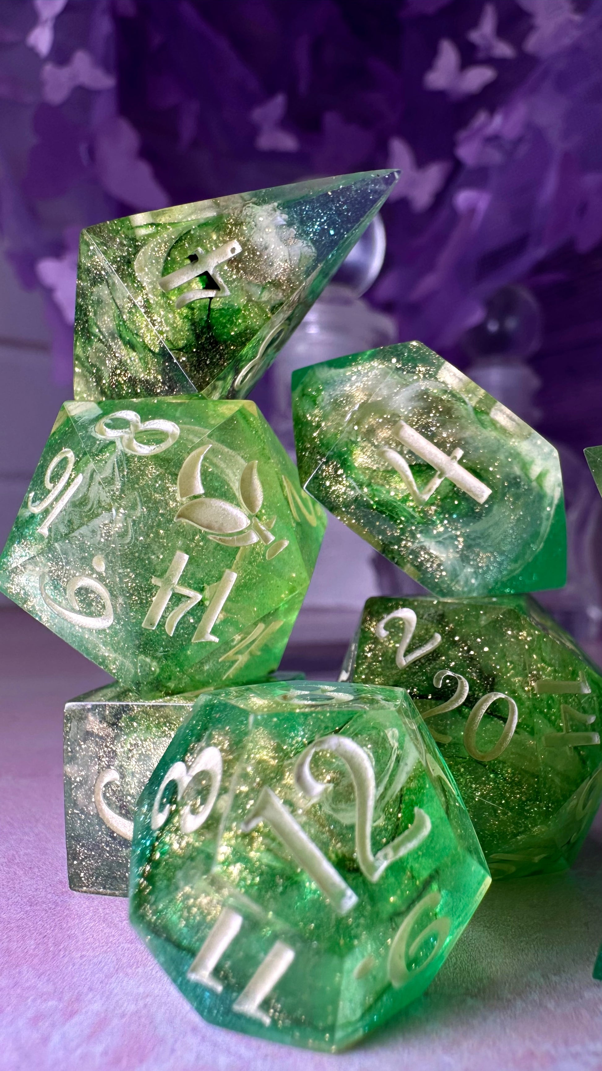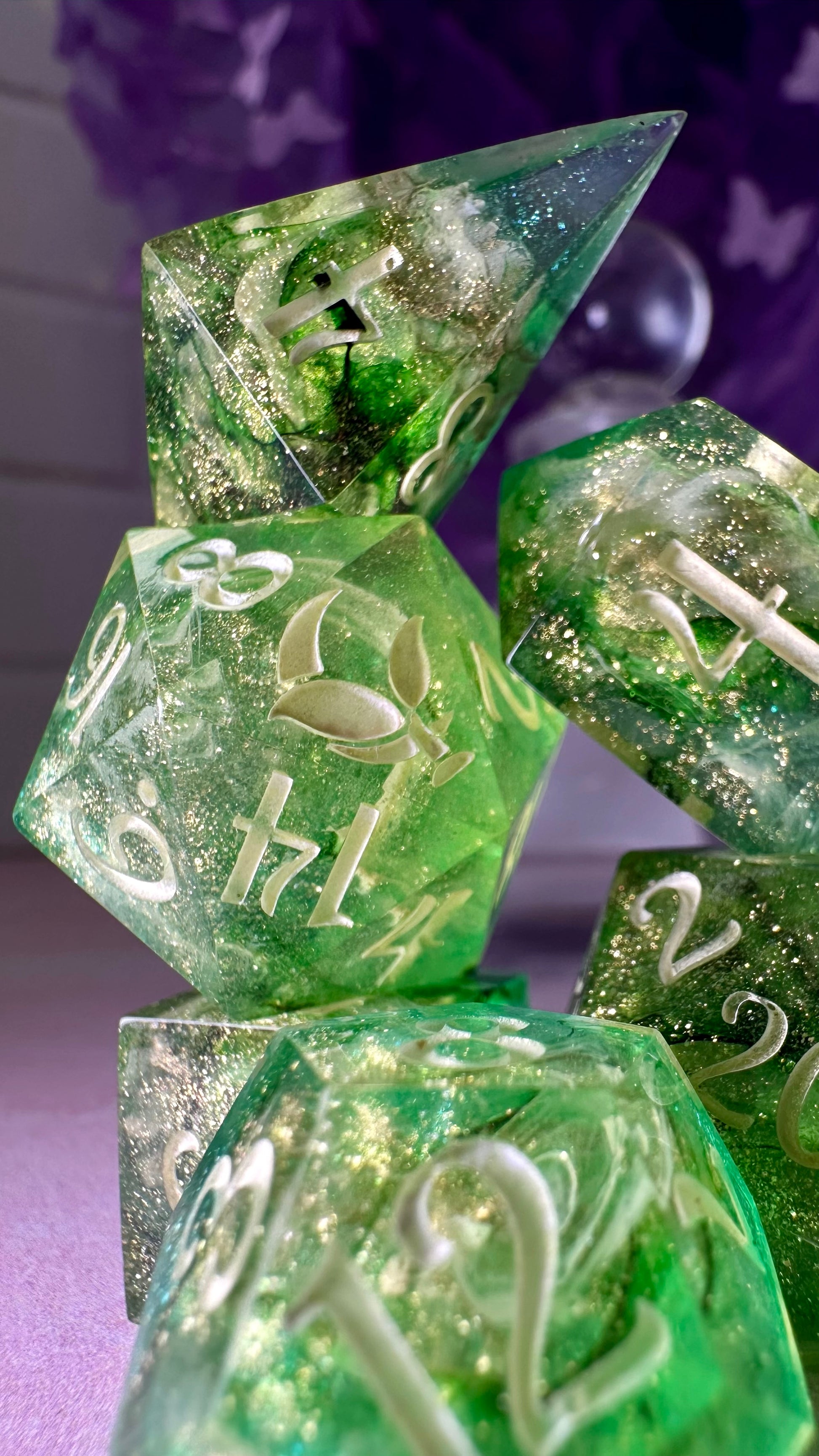 -These dice are bespoke handmade functional art pieces. This means they are not flawless ; they will have some small cosmetic flaws (small bubbles on the surface or in the dice themselves, micro-scratches on the surface, mold or inclusion marks, and carved in numbers. Some dice will have been patched with additional resin. This can cause small variations in color/visual lines) Anything worse than these flaws will be discounted and marked as such