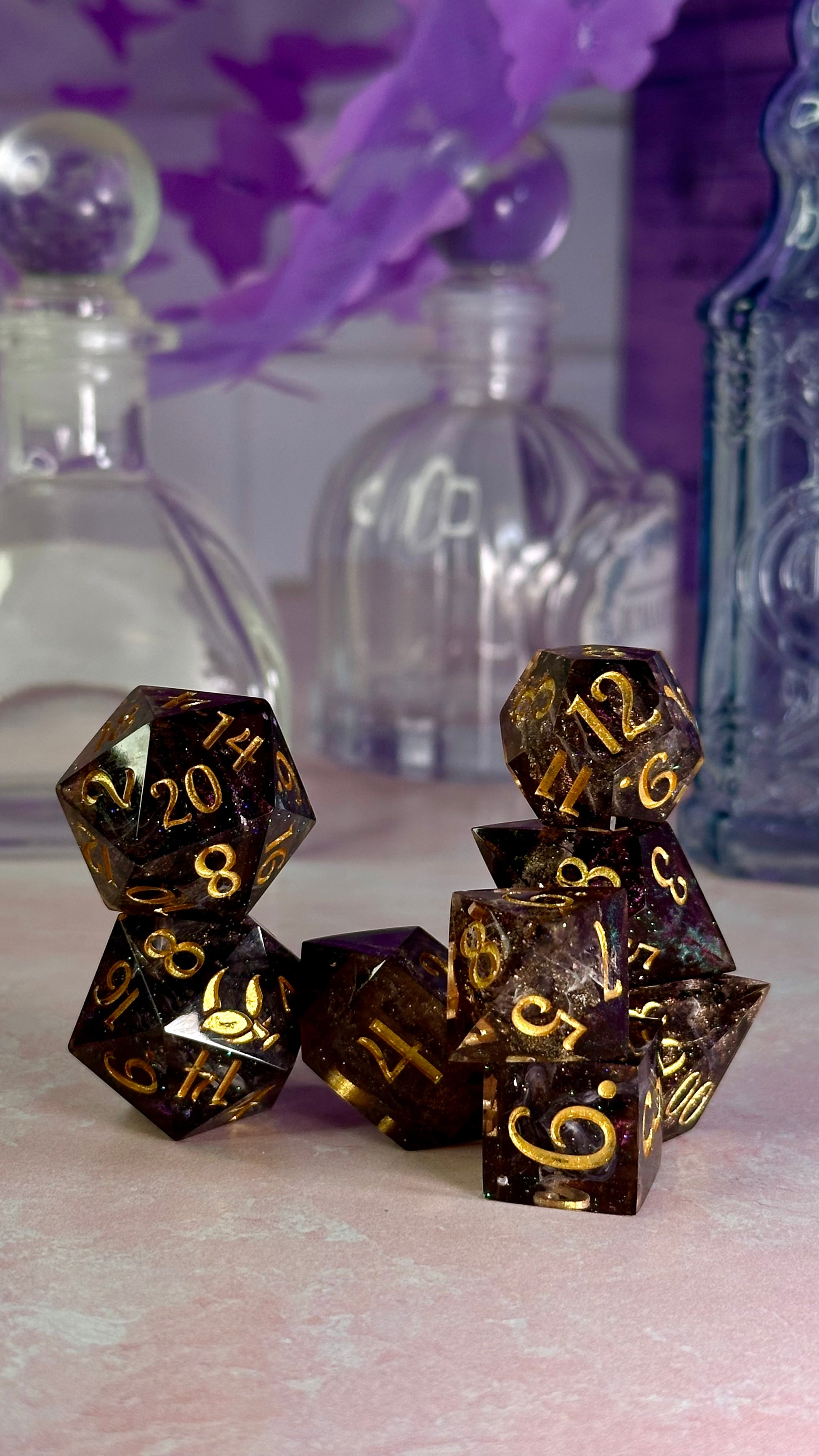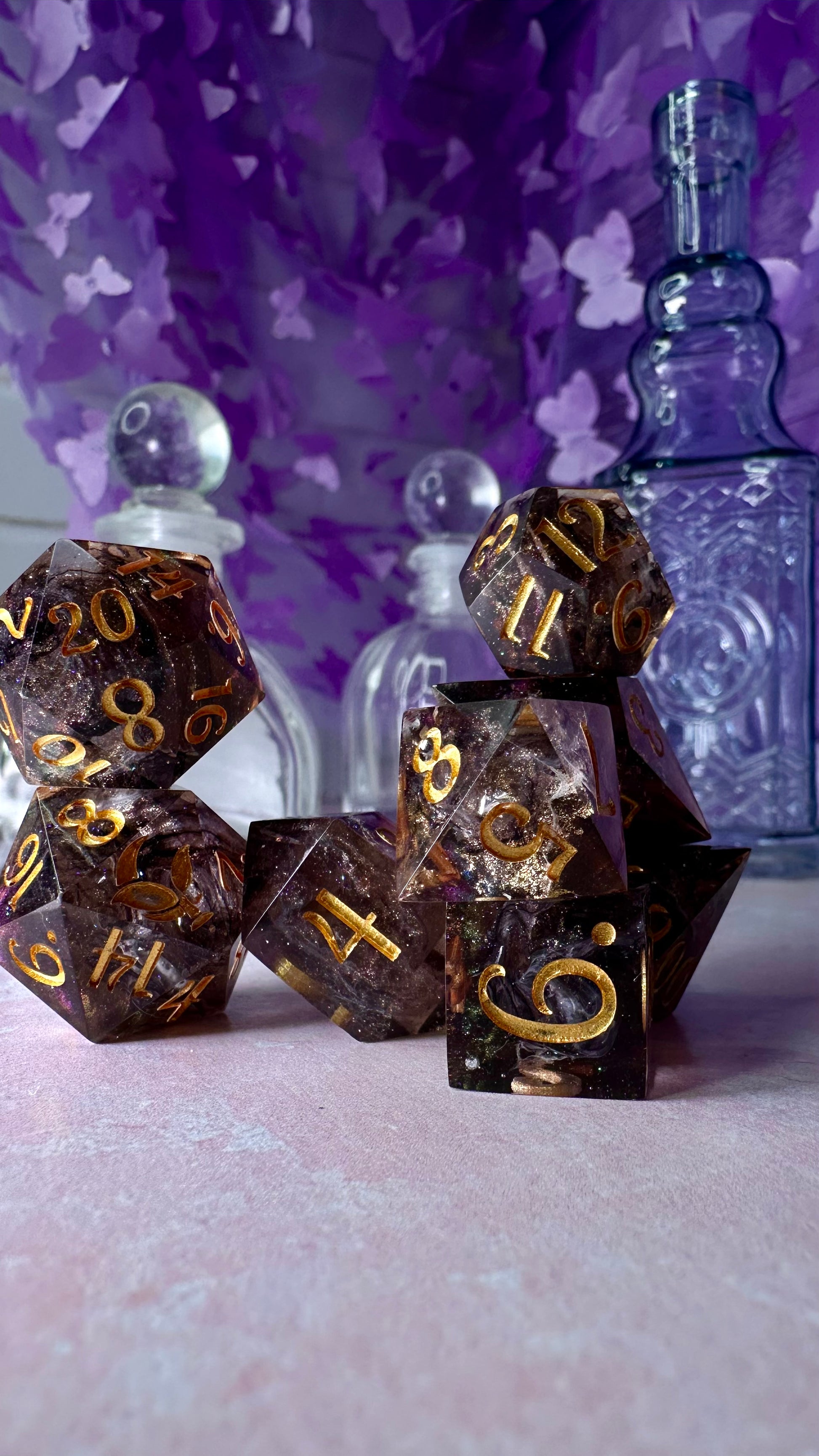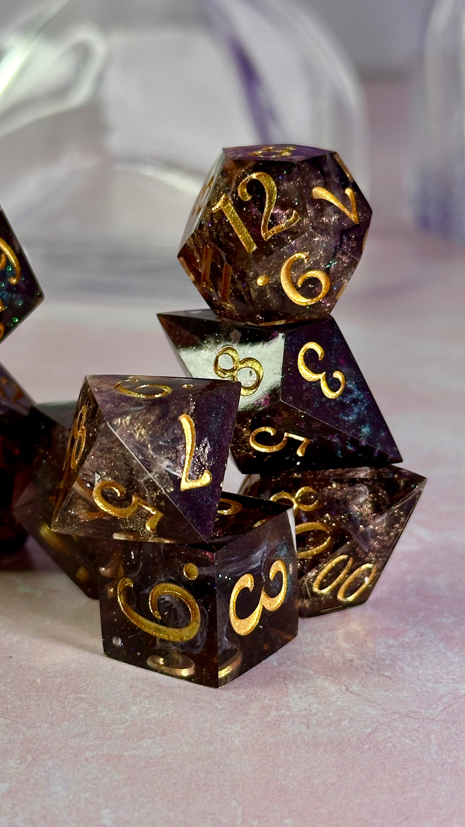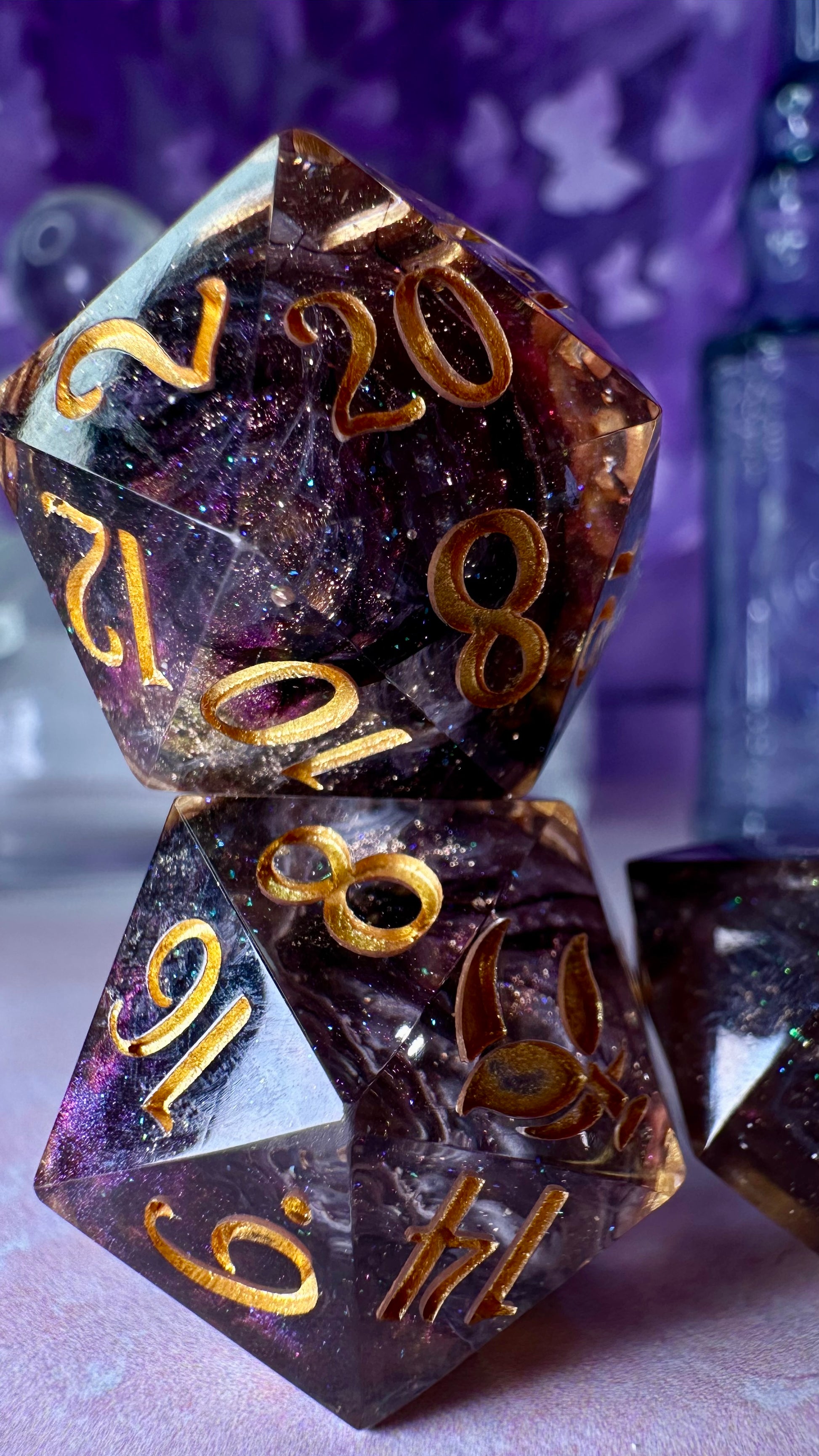 -These dice are bespoke handmade functional art pieces. This means they are not flawless ; they will have some small cosmetic flaws (small bubbles on the surface or in the dice themselves, micro-scratches on the surface, mold or inclusion marks, and carved in numbers. Some dice will have been patched with additional resin. This can cause small variations in color/visual lines) Anything worse than these flaws will be discounted and marked as such