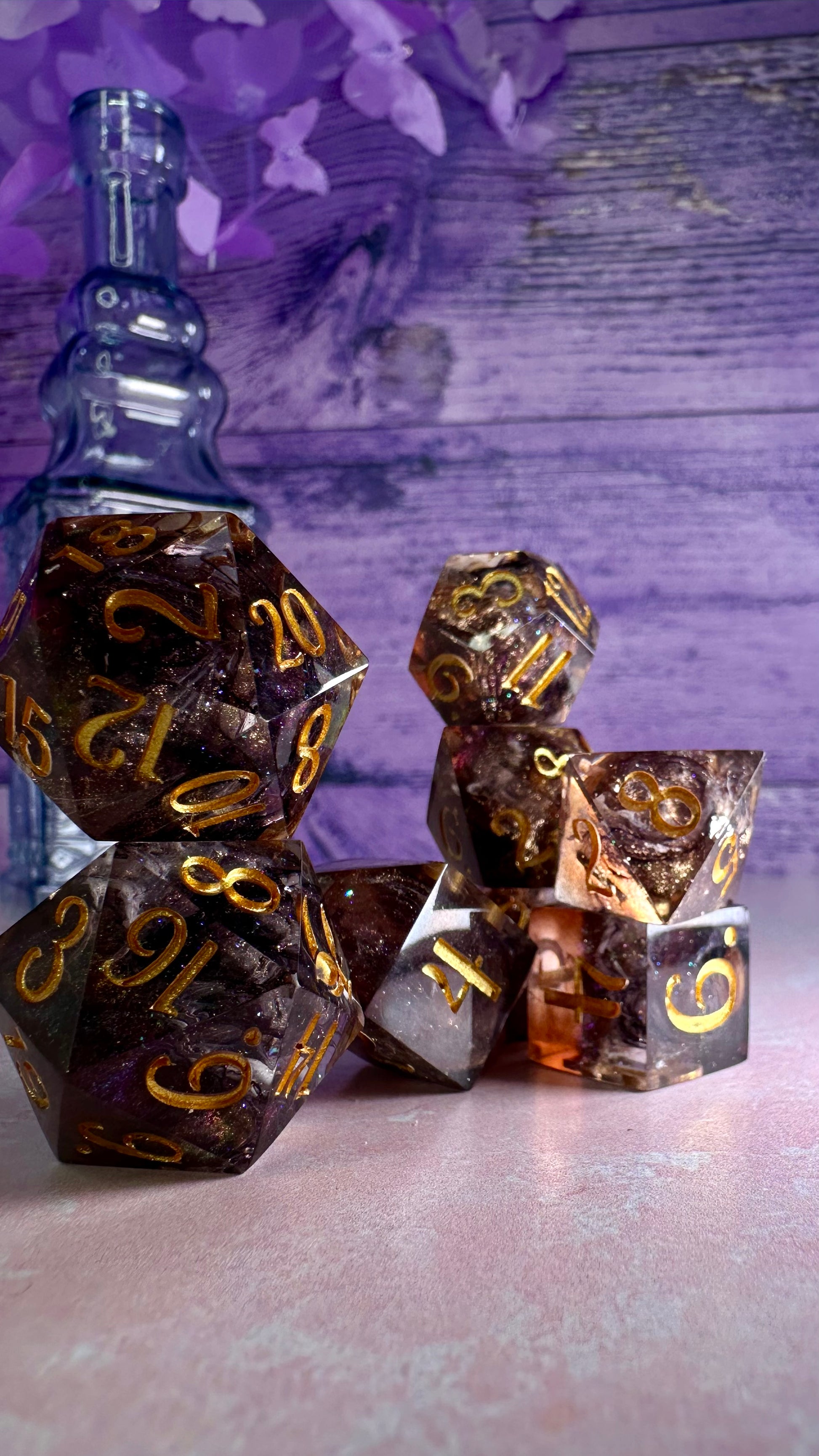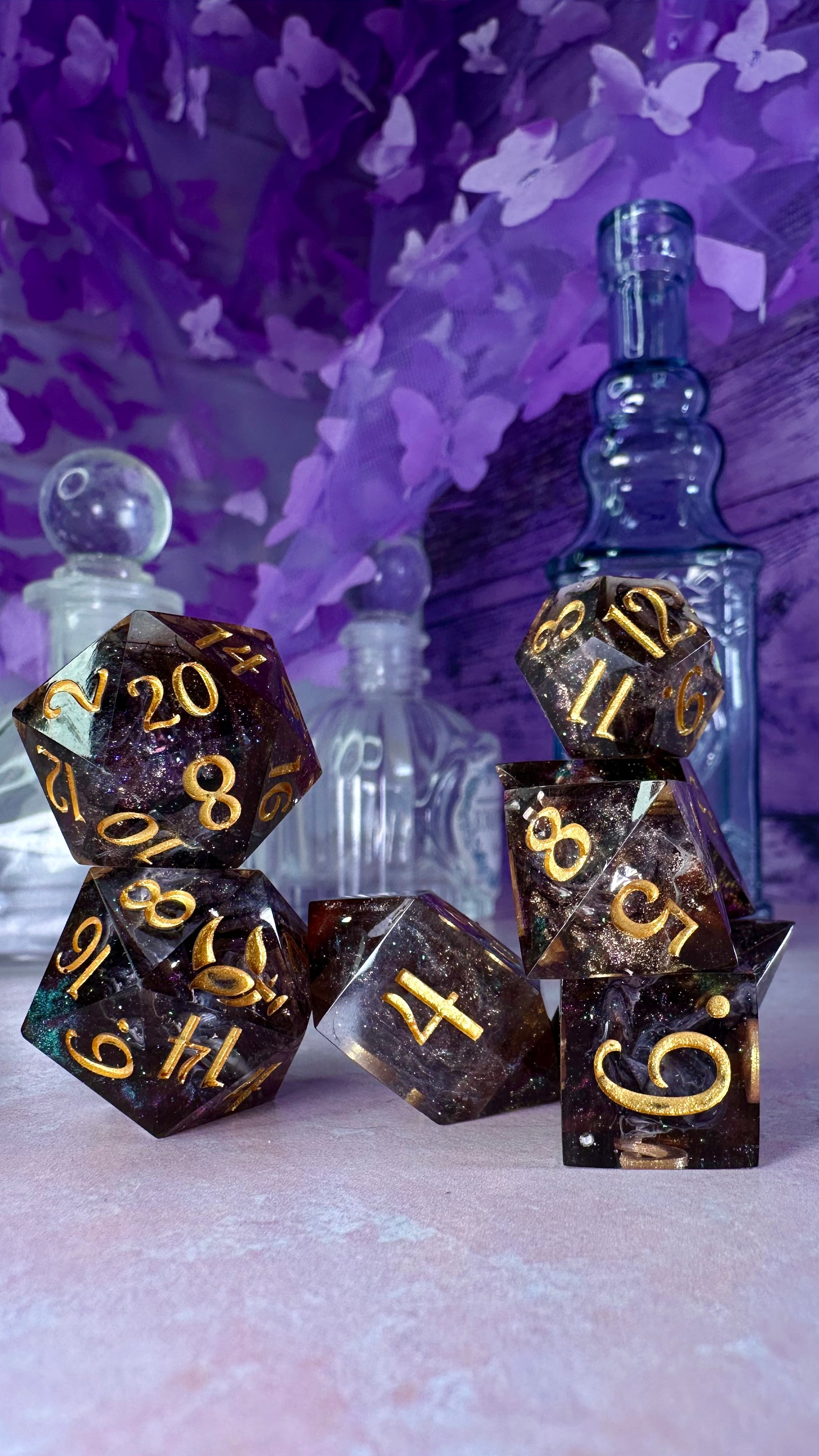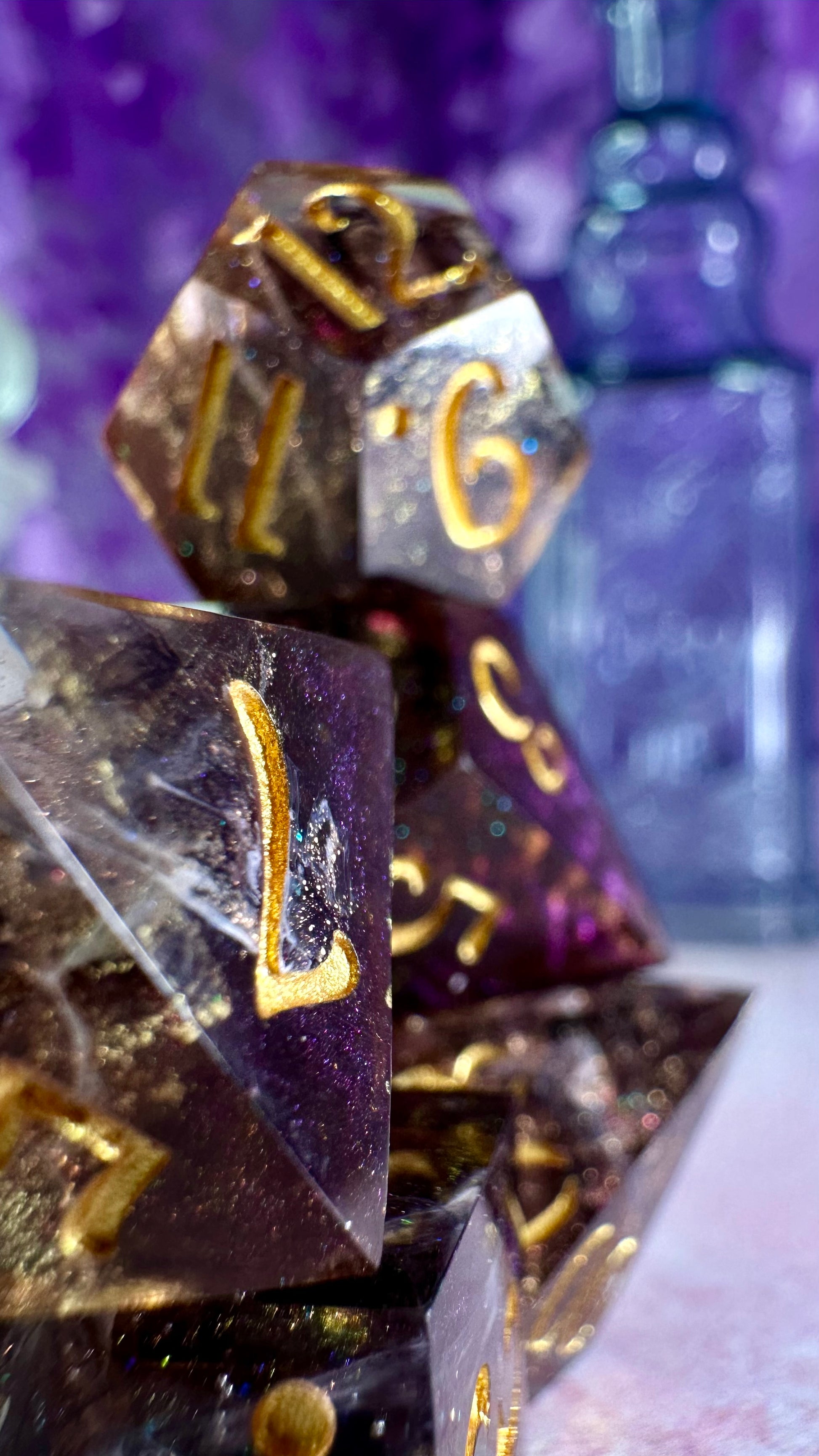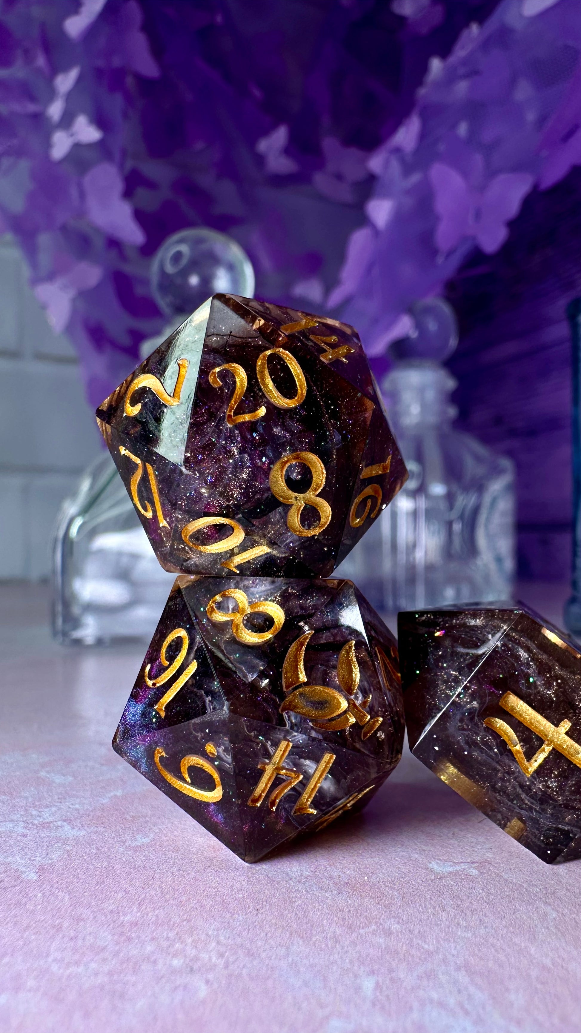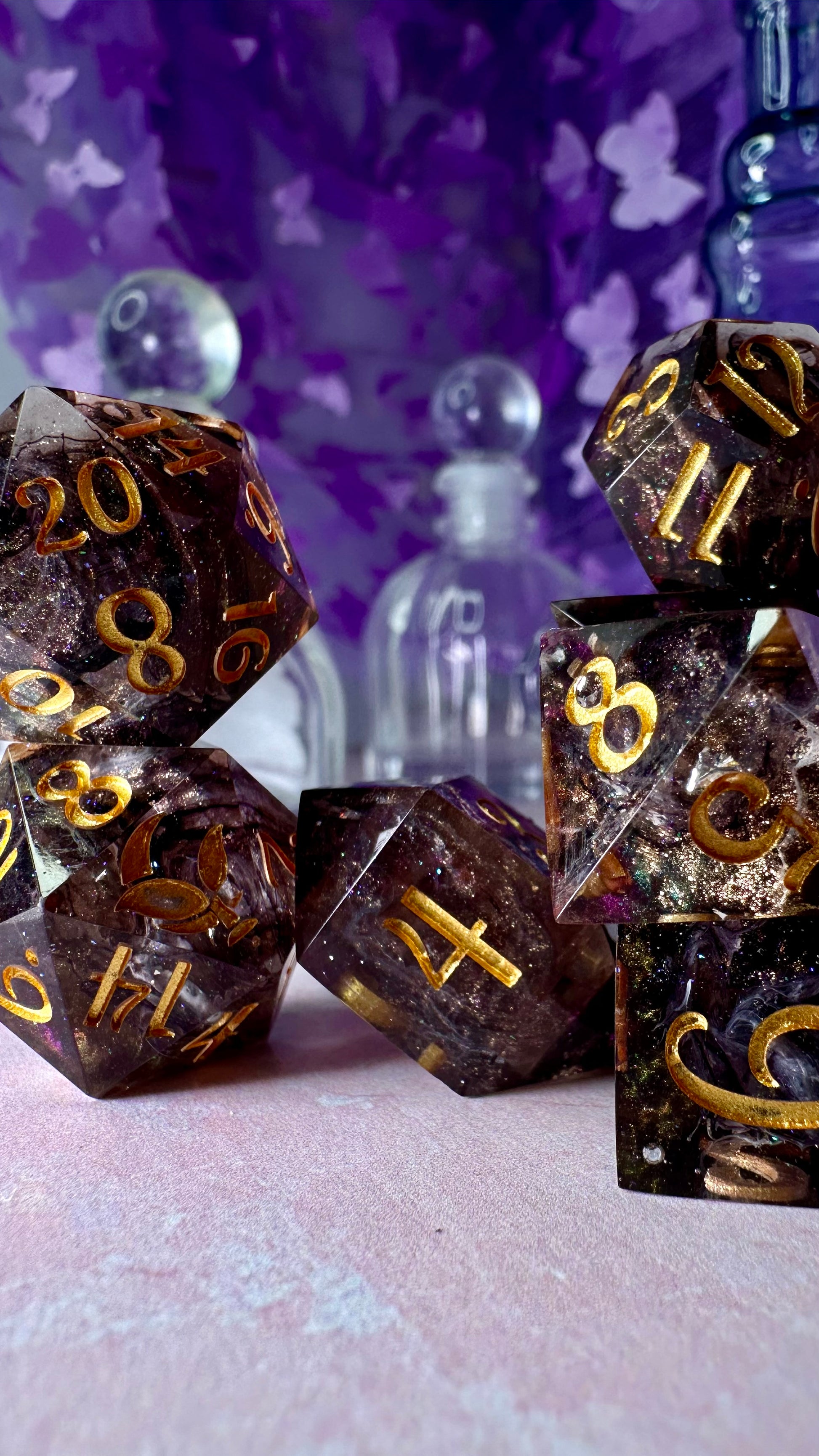 -These dice are bespoke handmade functional art pieces. This means they are not flawless ; they will have some small cosmetic flaws (small bubbles on the surface or in the dice themselves, micro-scratches on the surface, mold or inclusion marks, and carved in numbers. Some dice will have been patched with additional resin. This can cause small variations in color/visual lines) Anything worse than these flaws will be discounted and marked as such