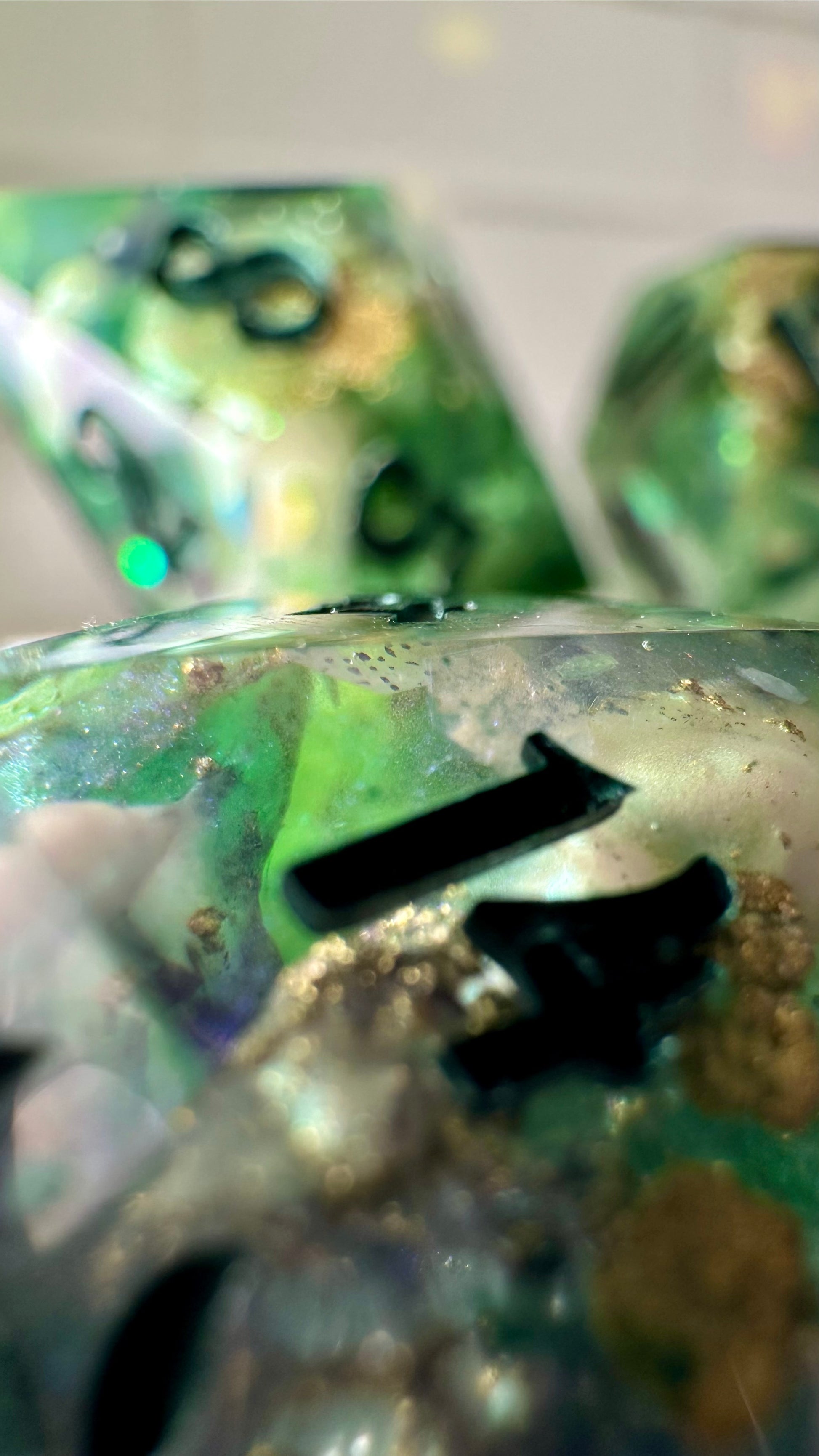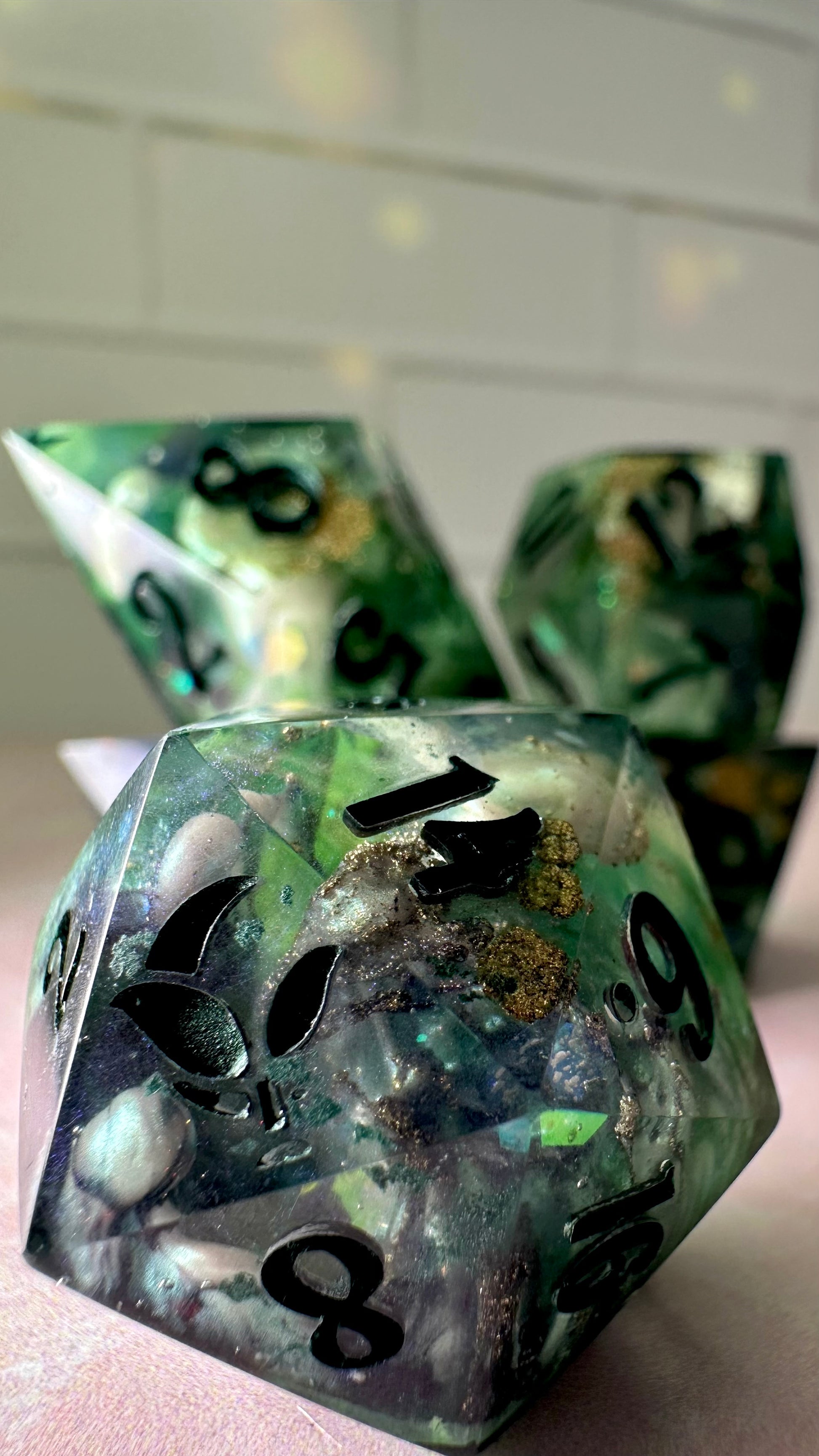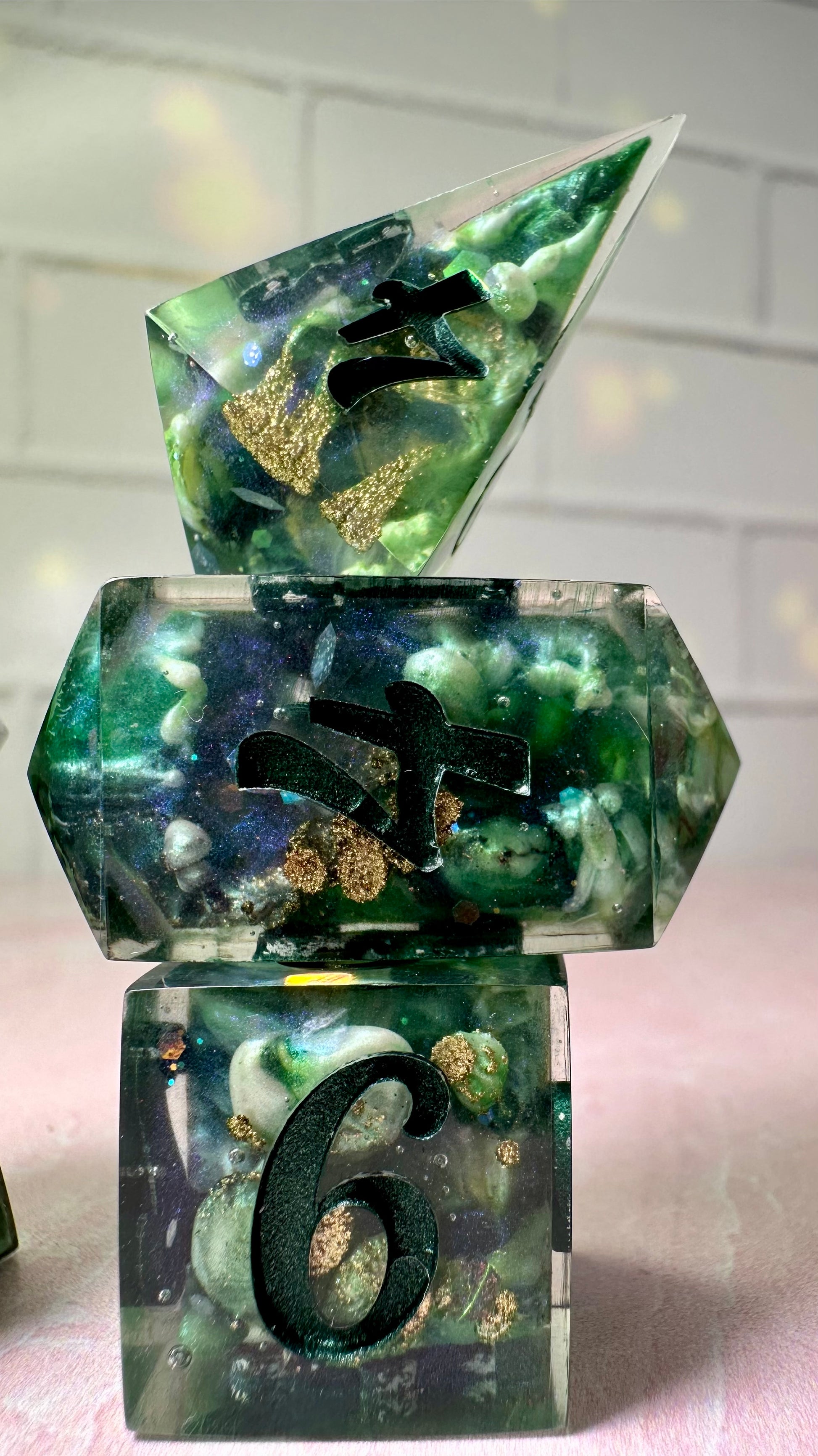 Rio’s dice feature a clear base (for her clear eyed vision) green alcohol ink, black alcohol ink , and pearl green-white tendrils of resin. They are dark and bright all at once, capturing both death and renewal. There is plenty that can grow in darkness. Inked in a deep almost black matte green.