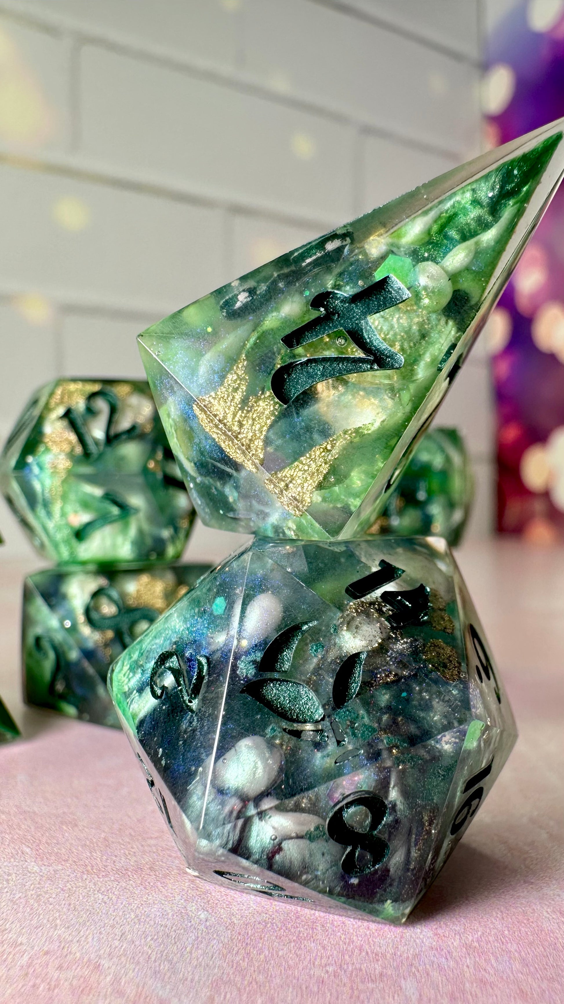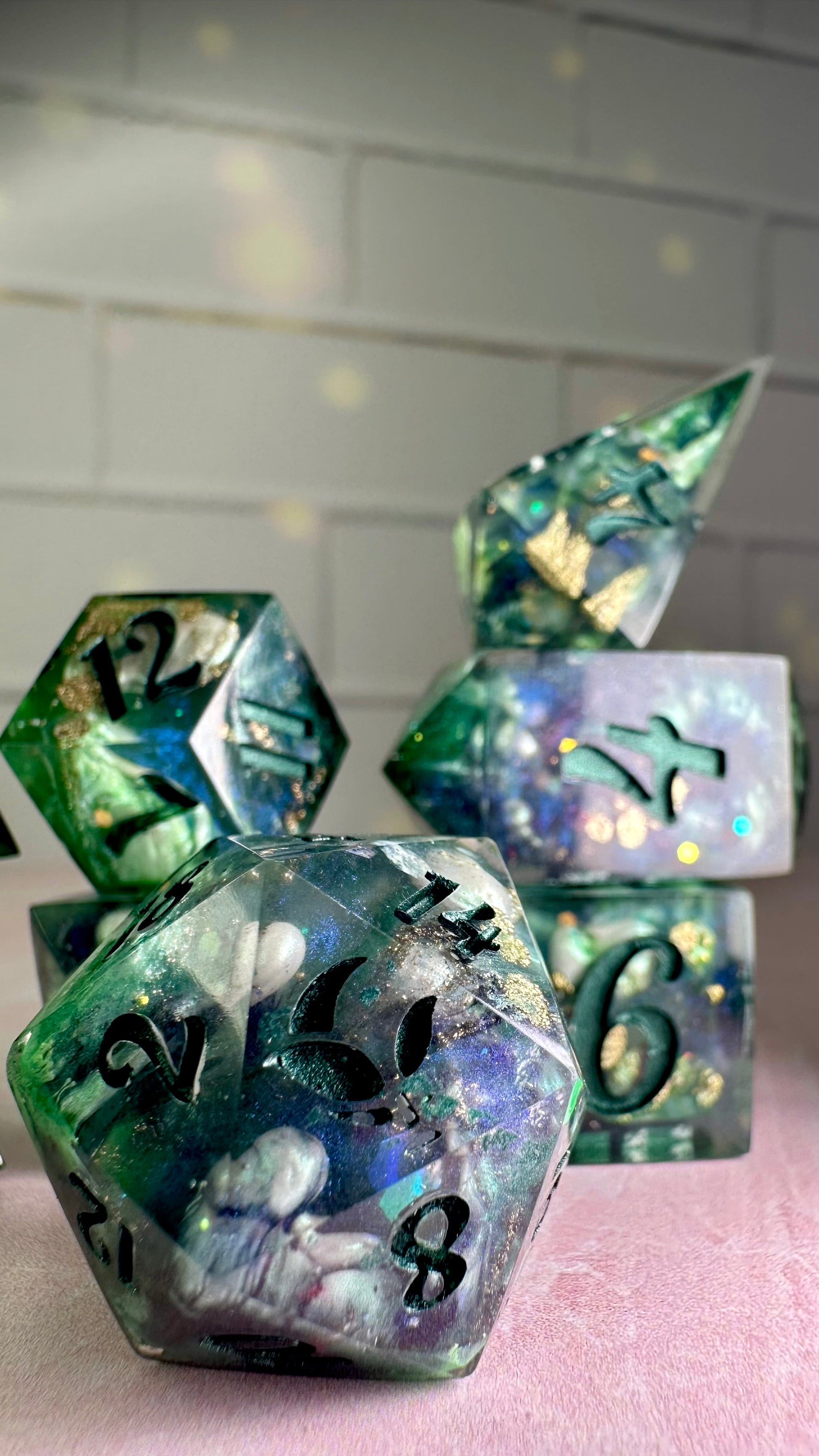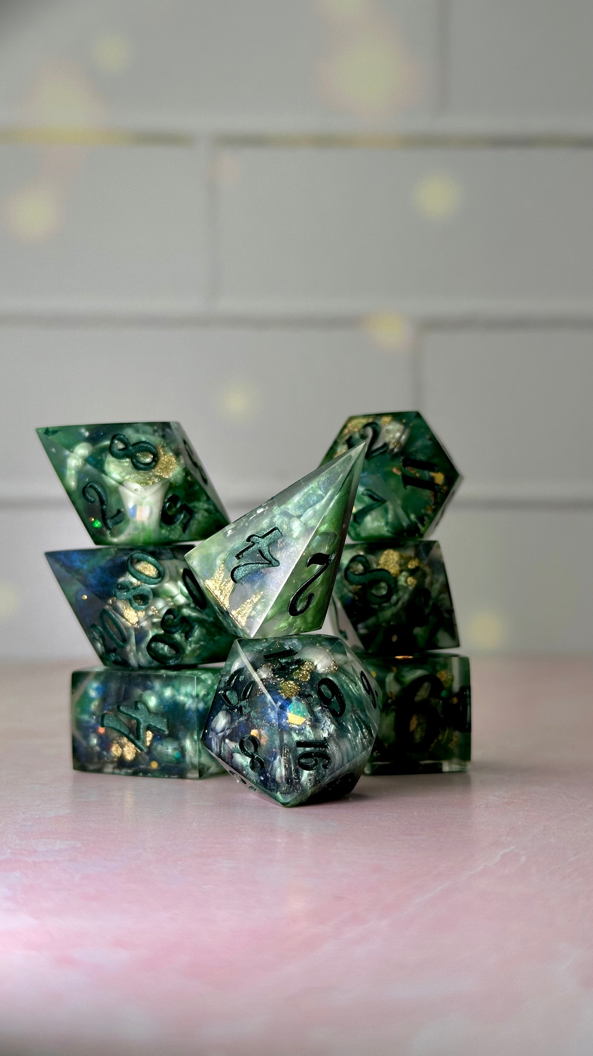 Rio’s dice feature a clear base (for her clear eyed vision) green alcohol ink, black alcohol ink , and pearl green-white tendrils of resin. They are dark and bright all at once, capturing both death and renewal. There is plenty that can grow in darkness. Inked in a deep almost black matte green.