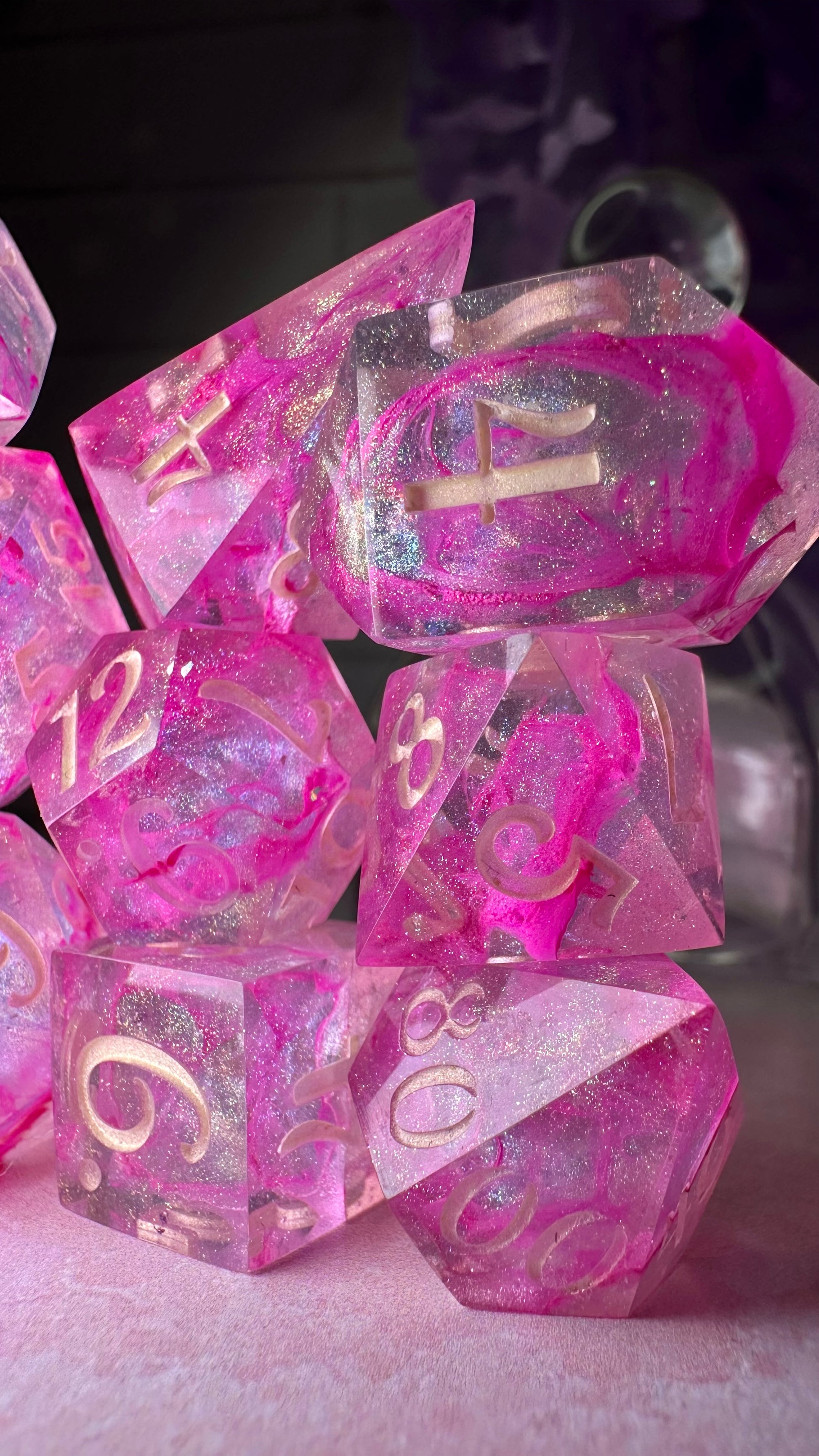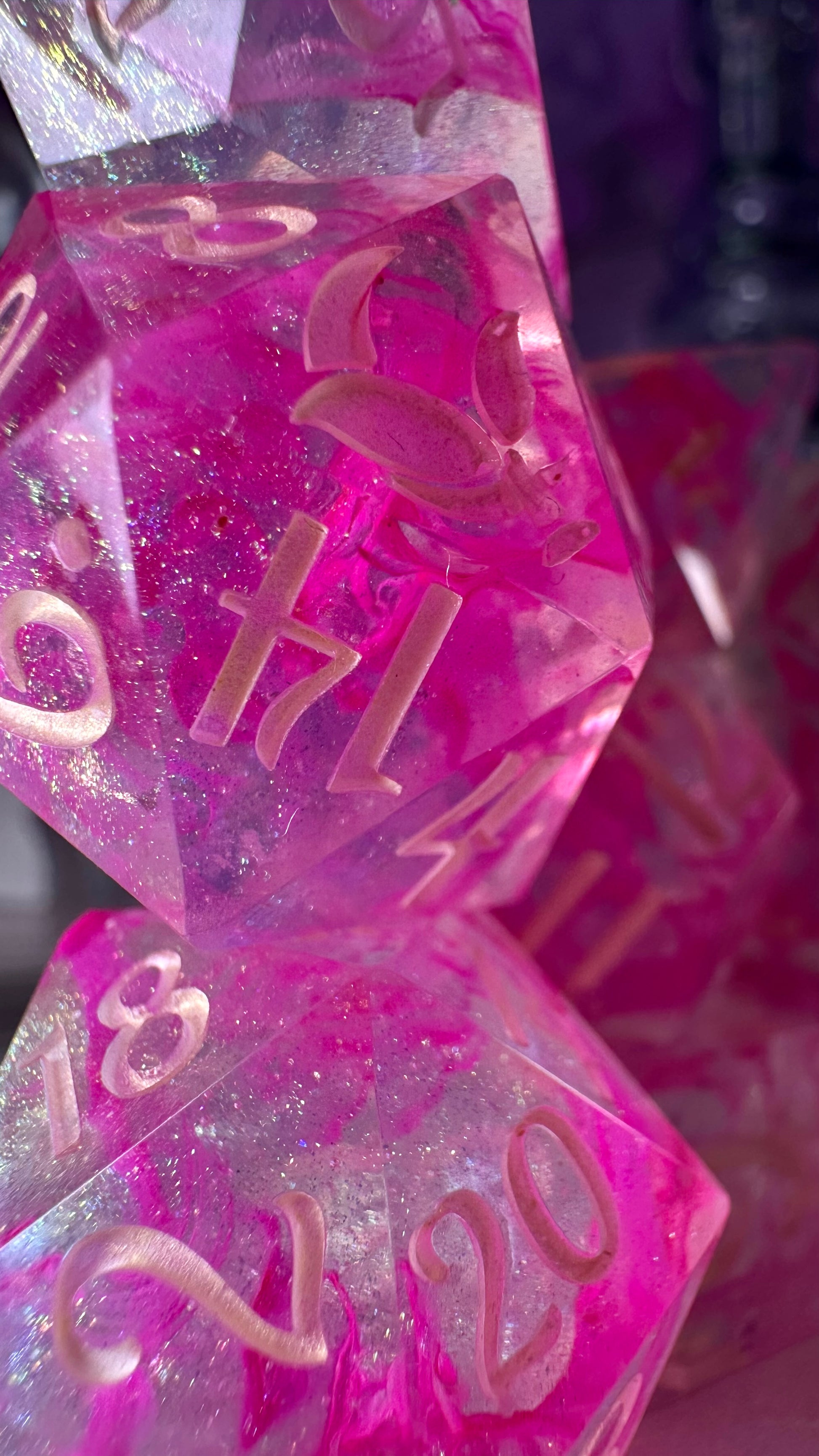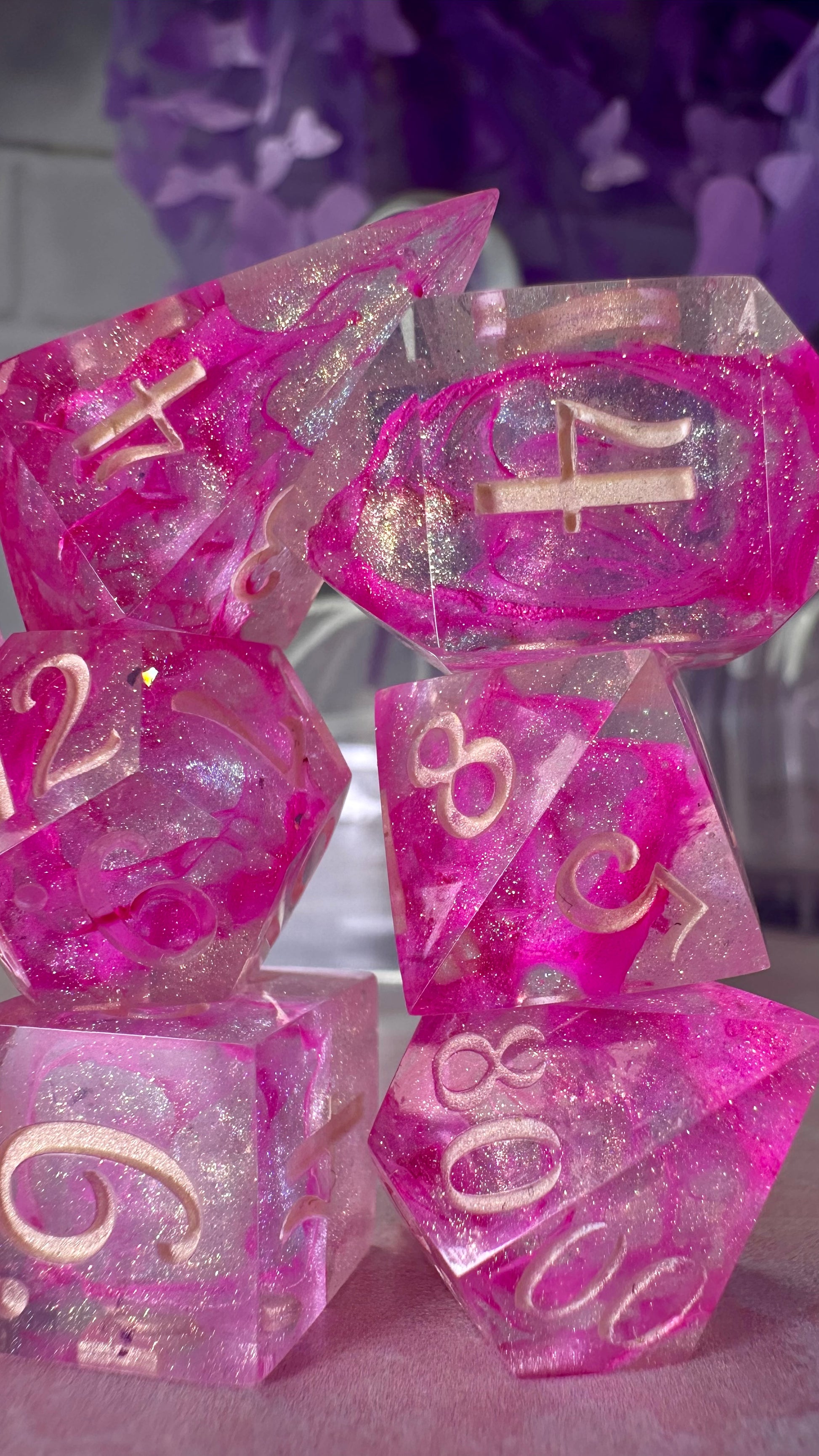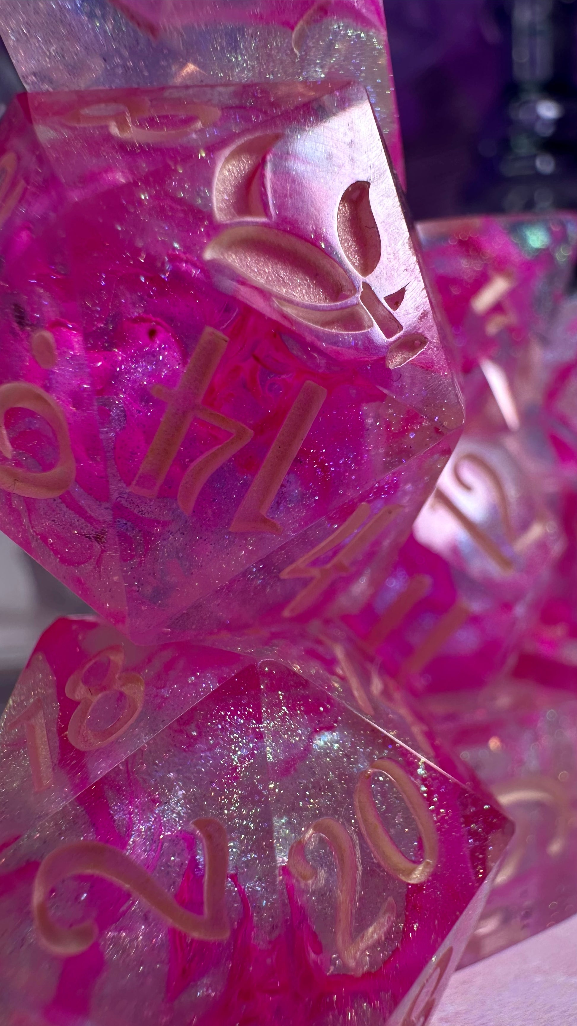 This set was inspired by Penelope's wardrobe in the early seasons of Bridgerton. A base of clear resin with rainbow flash shimmering pigments,and swirls of bright pink alcohol ink. Inked in pale yellow from Englightened Acrylics and Pigments from Dreamland Watercolor.