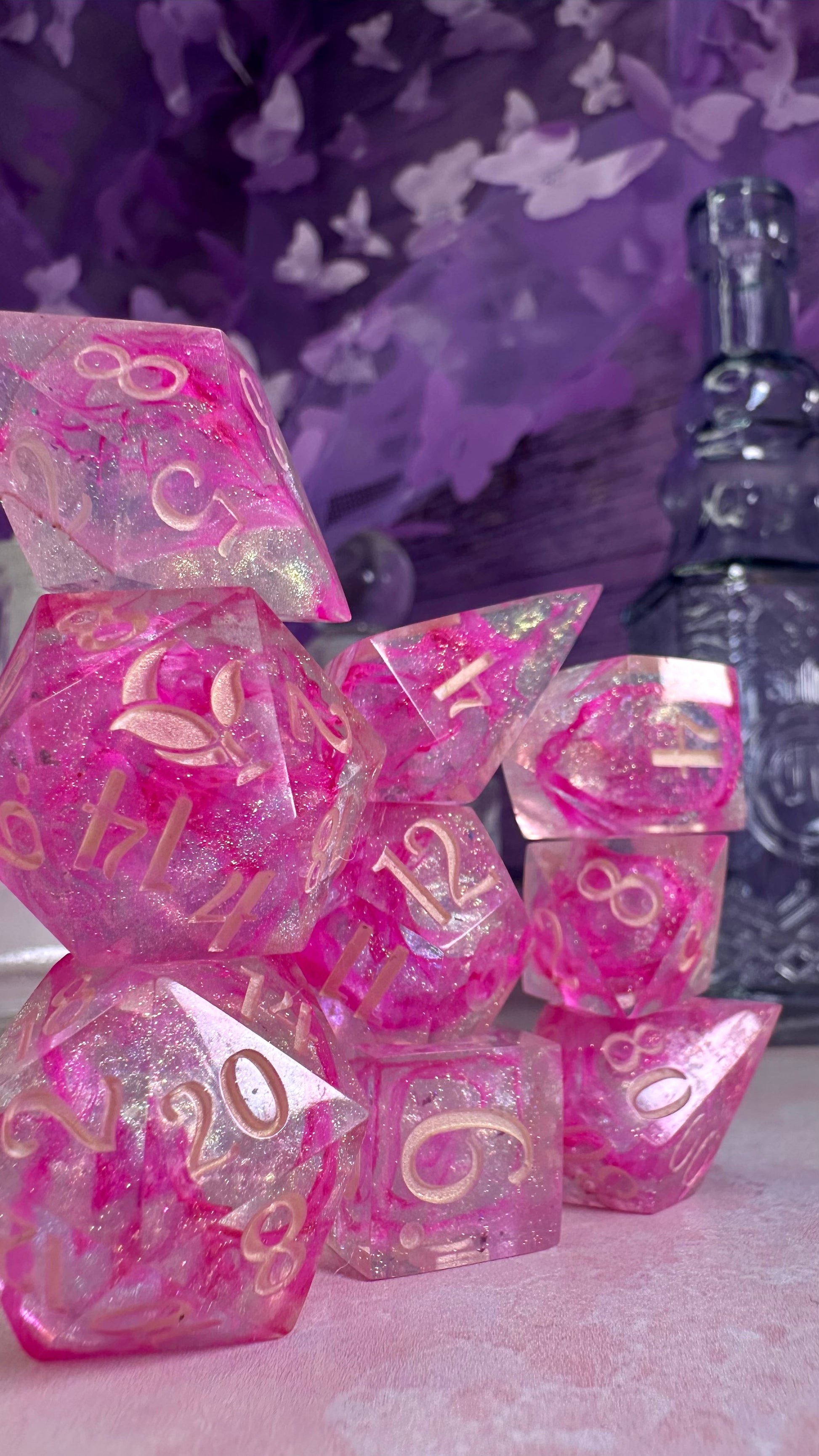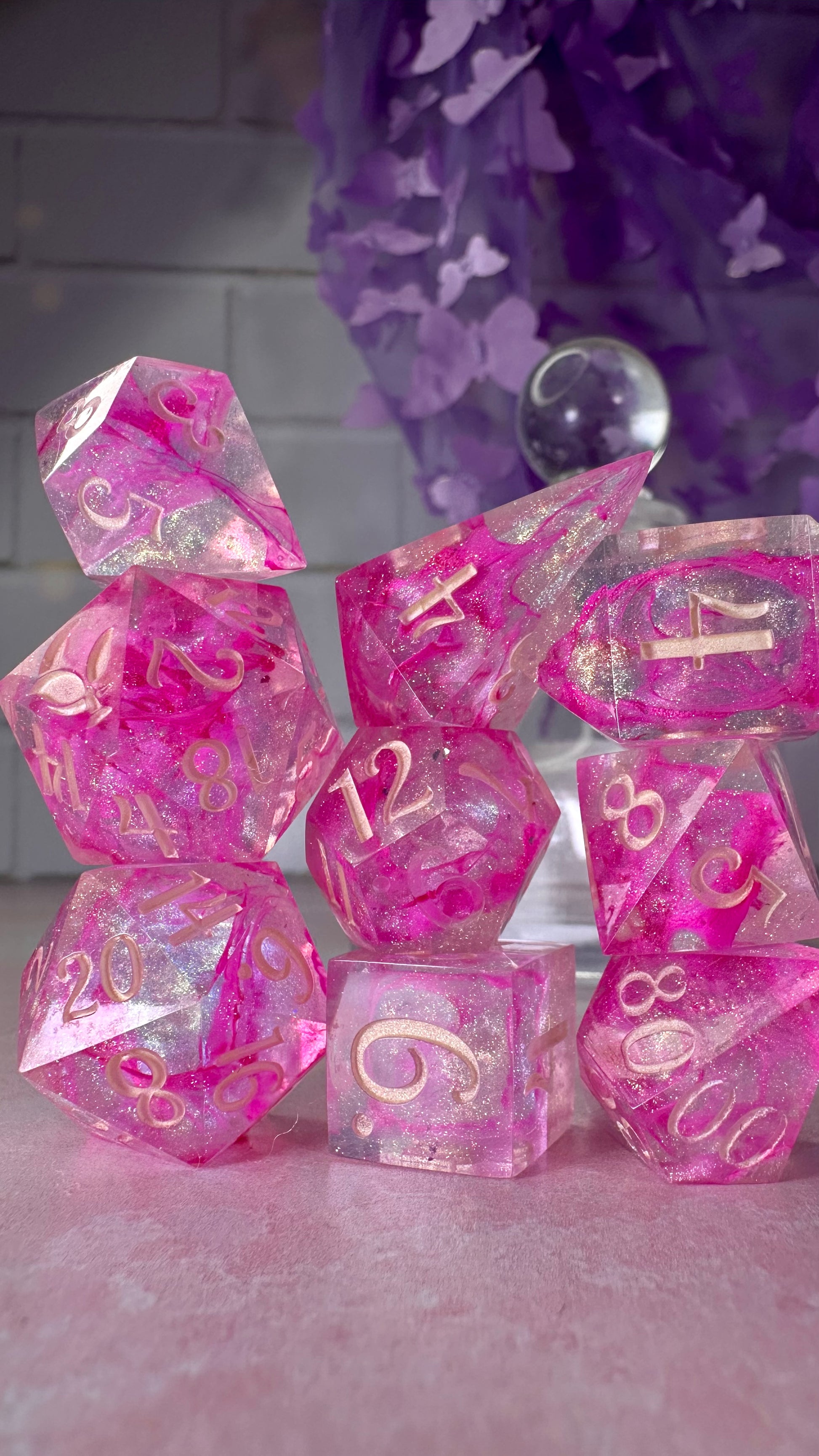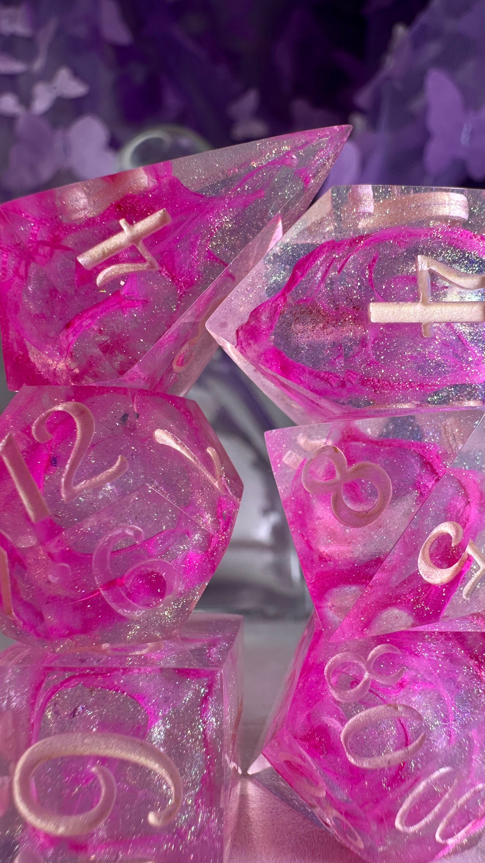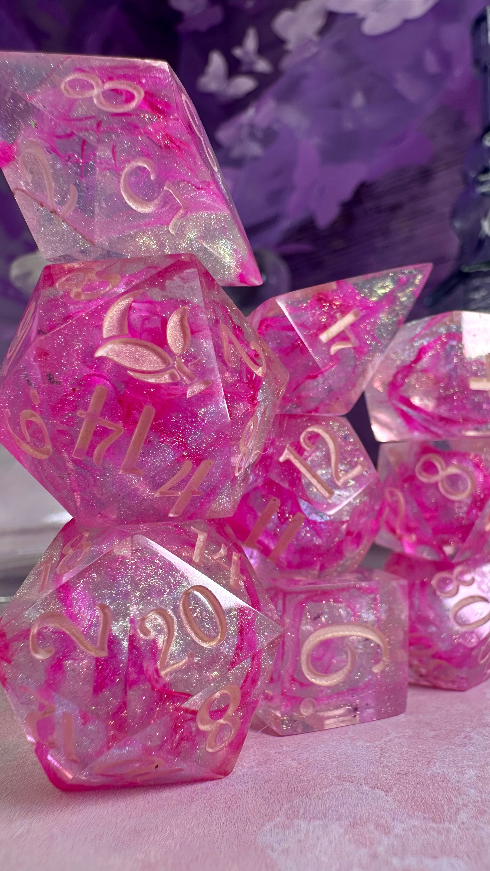 This set was inspired by Penelope's wardrobe in the early seasons of Bridgerton. A base of clear resin with rainbow flash shimmering pigments,and swirls of bright pink alcohol ink. Inked in pale yellow from Englightened Acrylics and Pigments from Dreamland Watercolor.