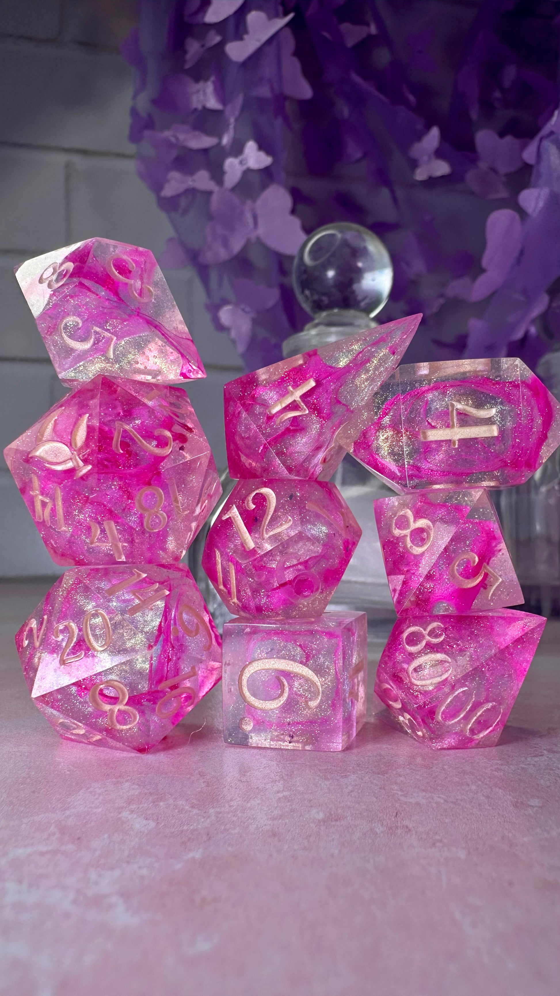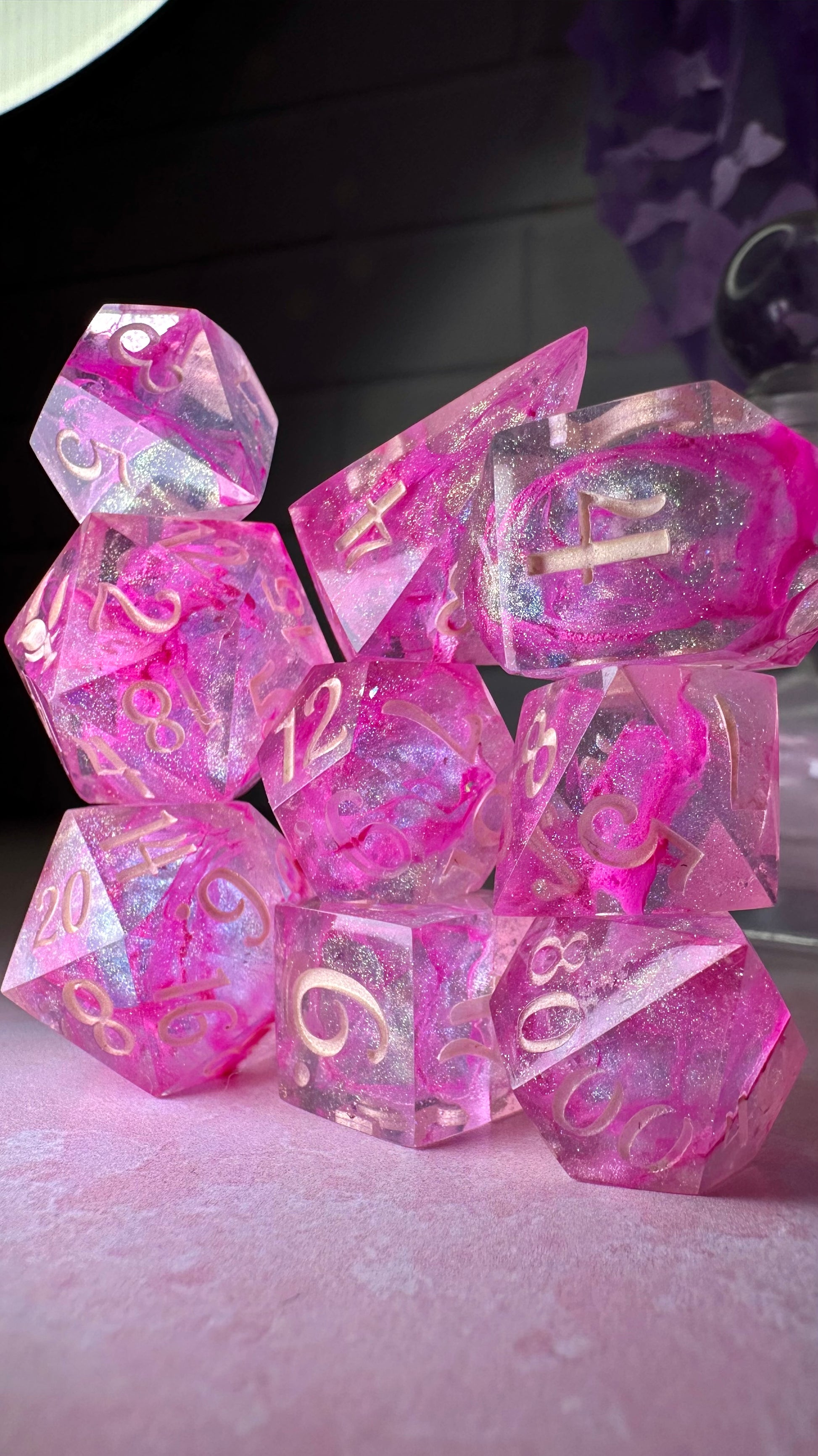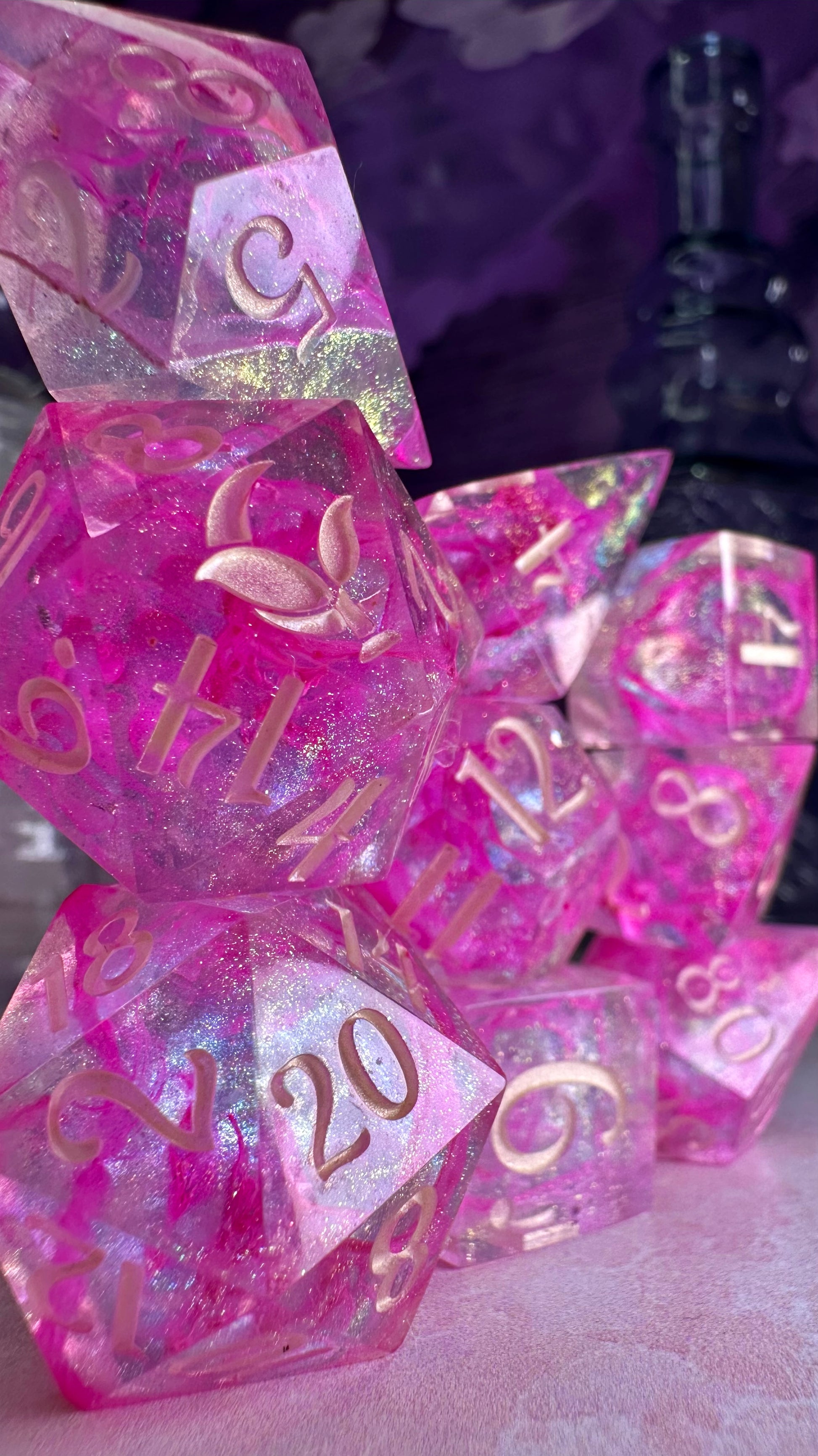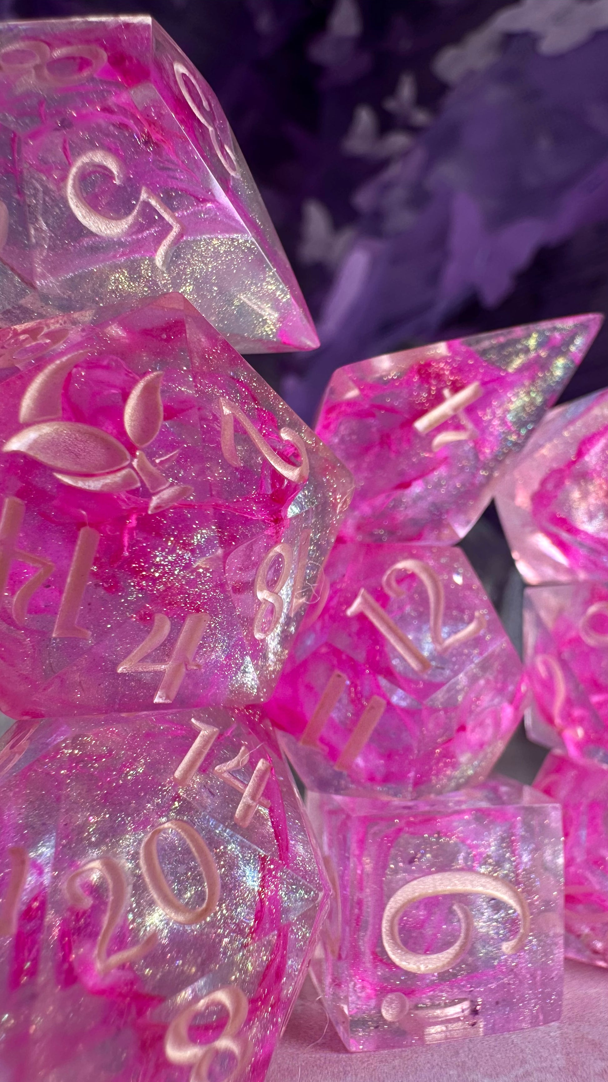 This set was inspired by Penelope's wardrobe in the early seasons of Bridgerton. A base of clear resin with rainbow flash shimmering pigments,and swirls of bright pink alcohol ink. Inked in pale yellow from Englightened Acrylics and Pigments from Dreamland Watercolor.