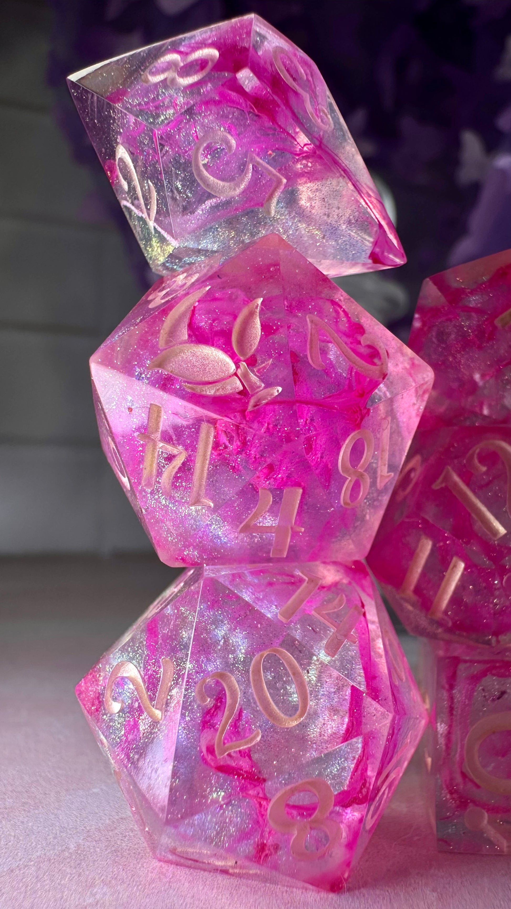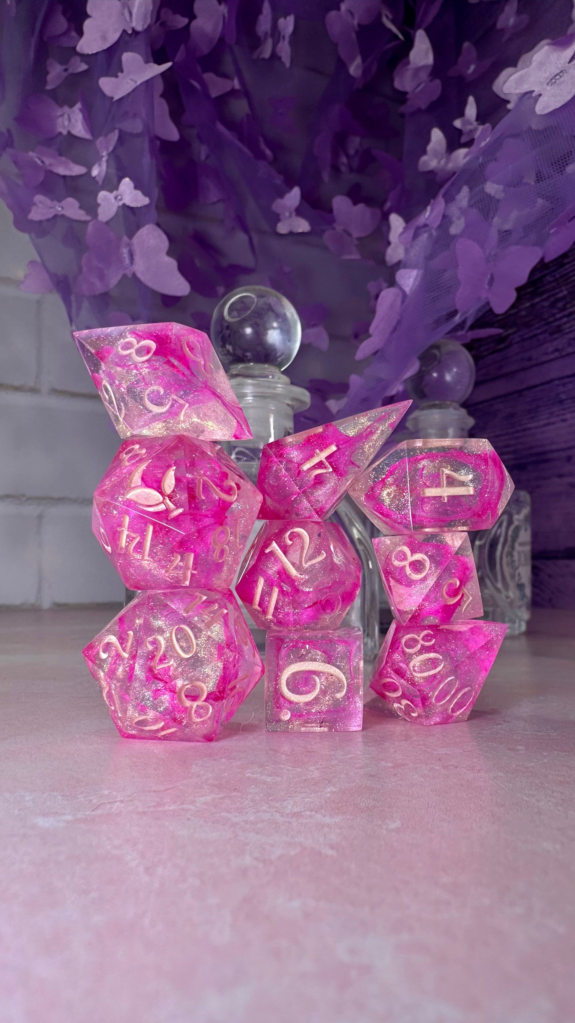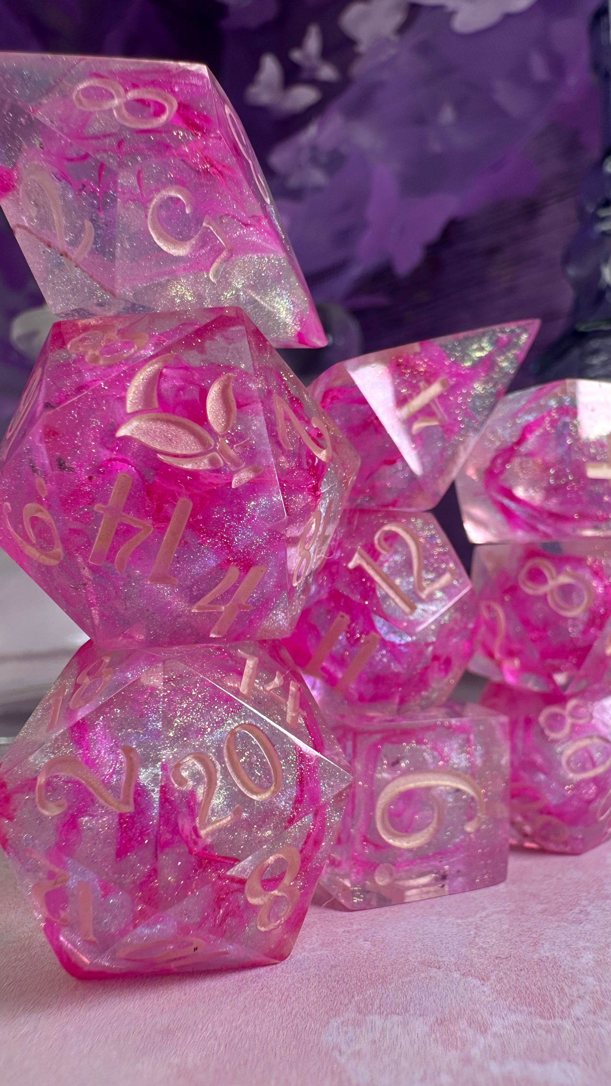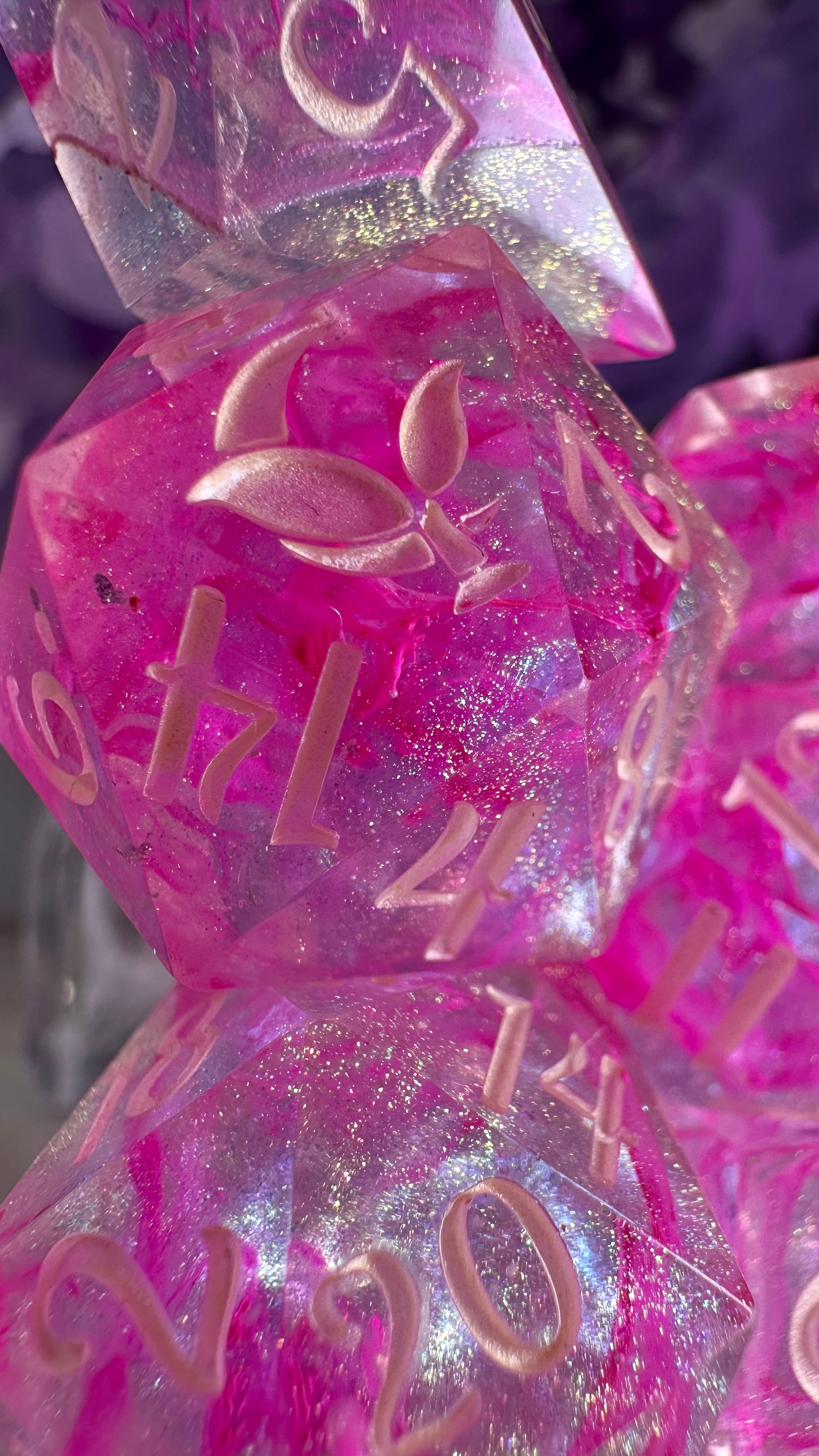 This set was inspired by Penelope's wardrobe in the early seasons of Bridgerton. A base of clear resin with rainbow flash shimmering pigments,and swirls of bright pink alcohol ink. Inked in pale yellow from Englightened Acrylics and Pigments from Dreamland Watercolor.