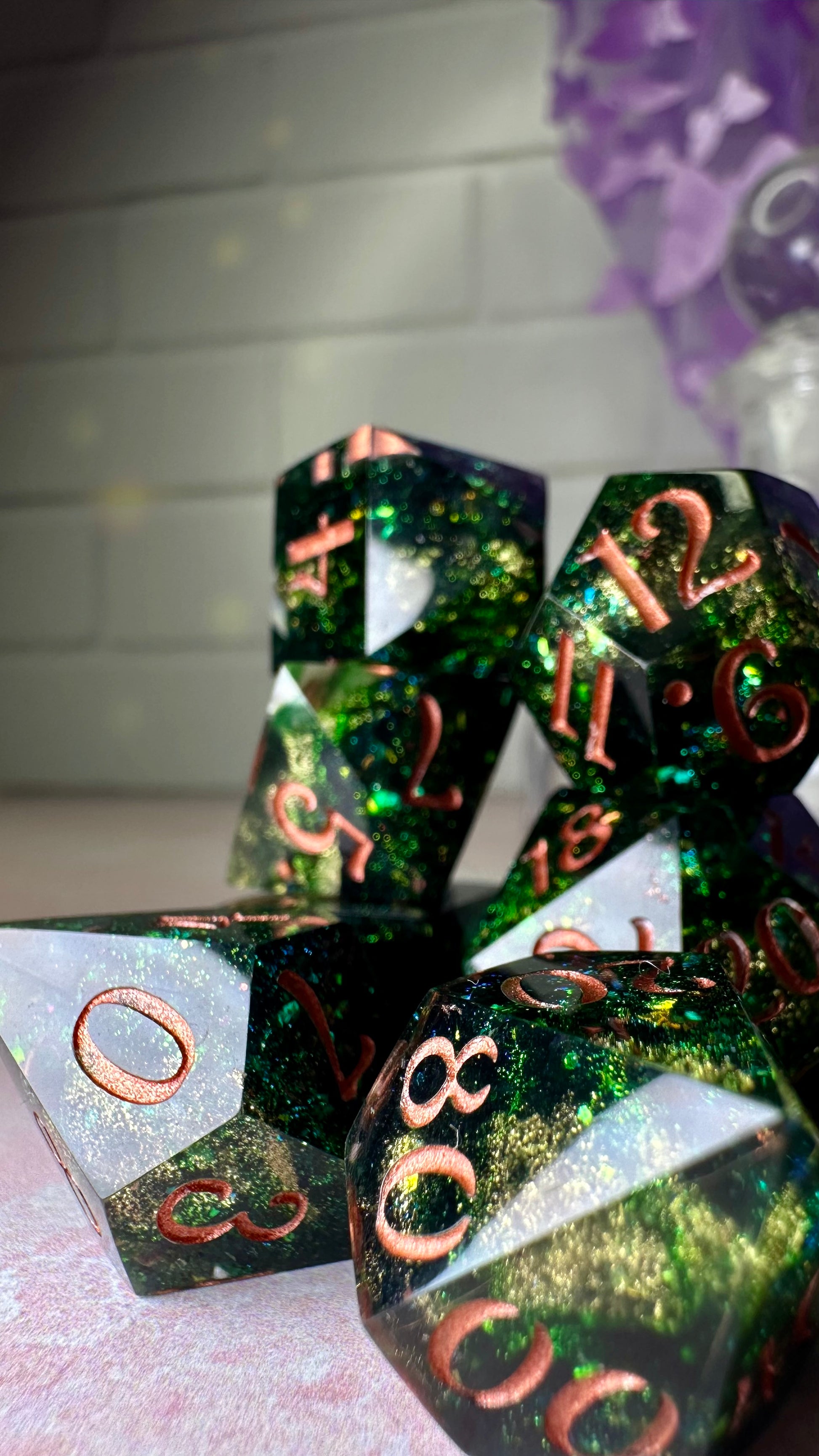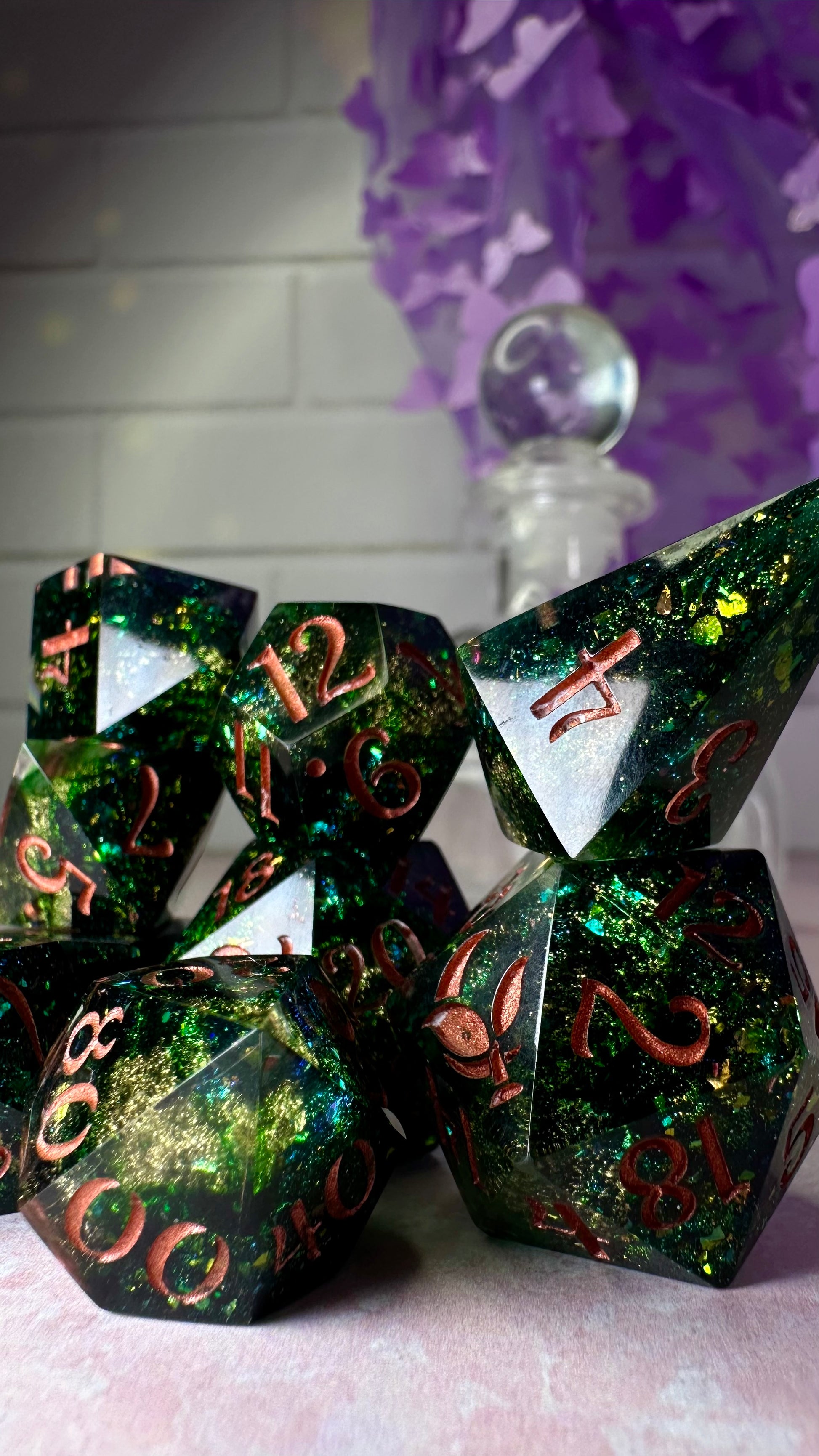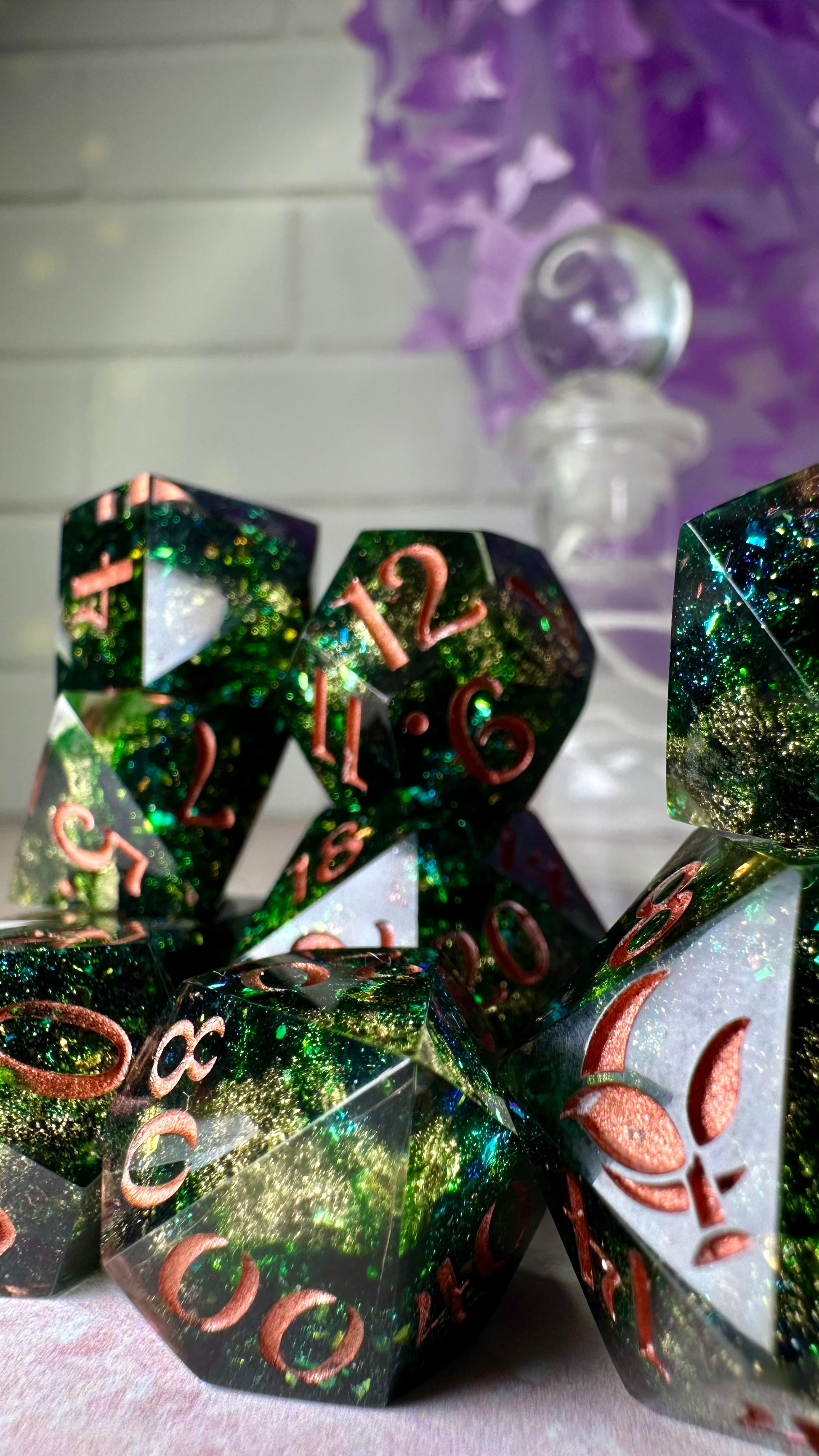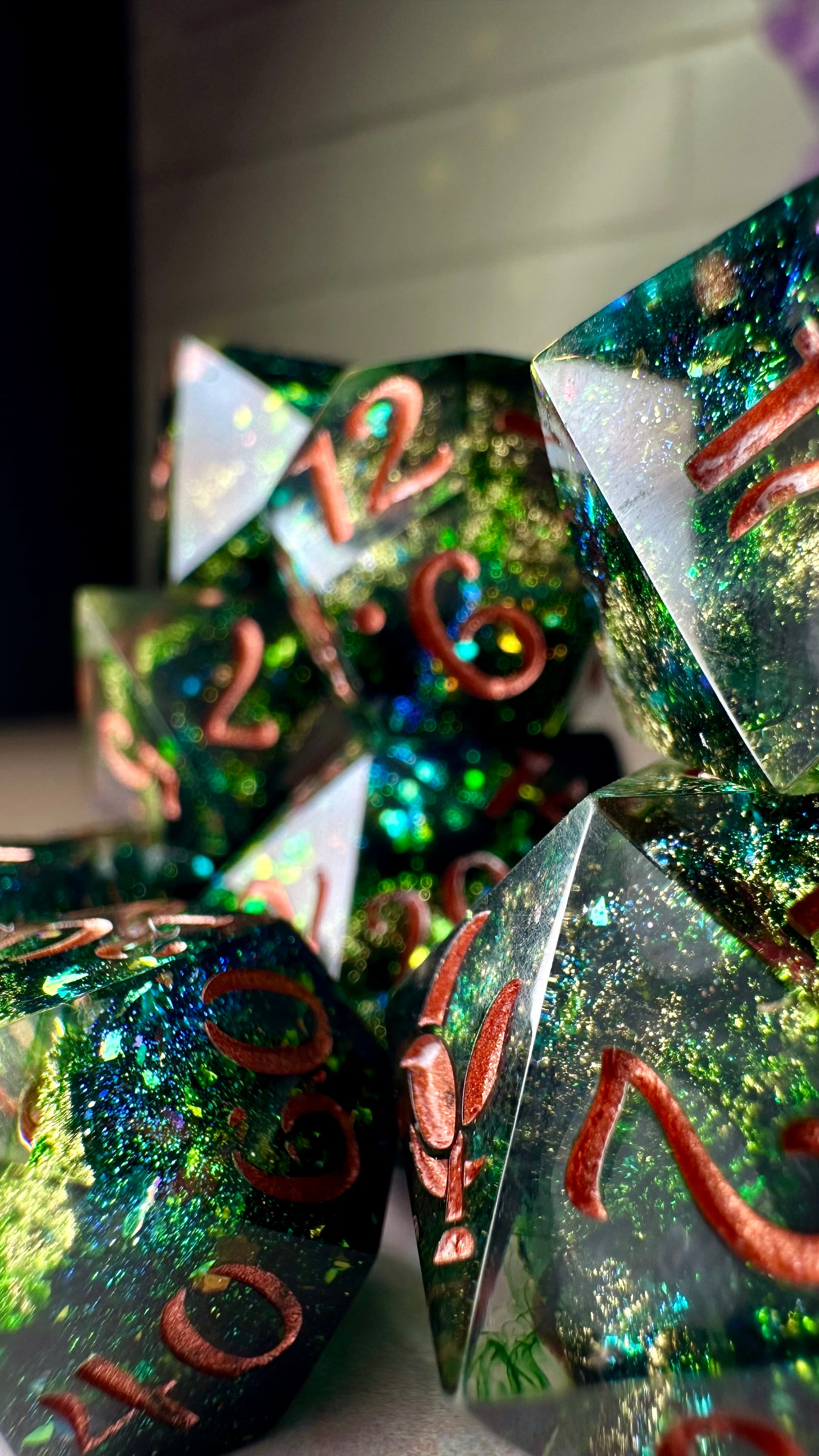 -These dice are bespoke handmade functional art pieces. This means they are not flawless ; they will have some small cosmetic flaws (small bubbles on the surface or in the dice themselves, micro-scratches on the surface, mold or inclusion marks, and carved in numbers. Some dice will have been patched with additional resin. This can cause small variations in color/visual lines) Anything worse than these flaws will be discounted and marked as such