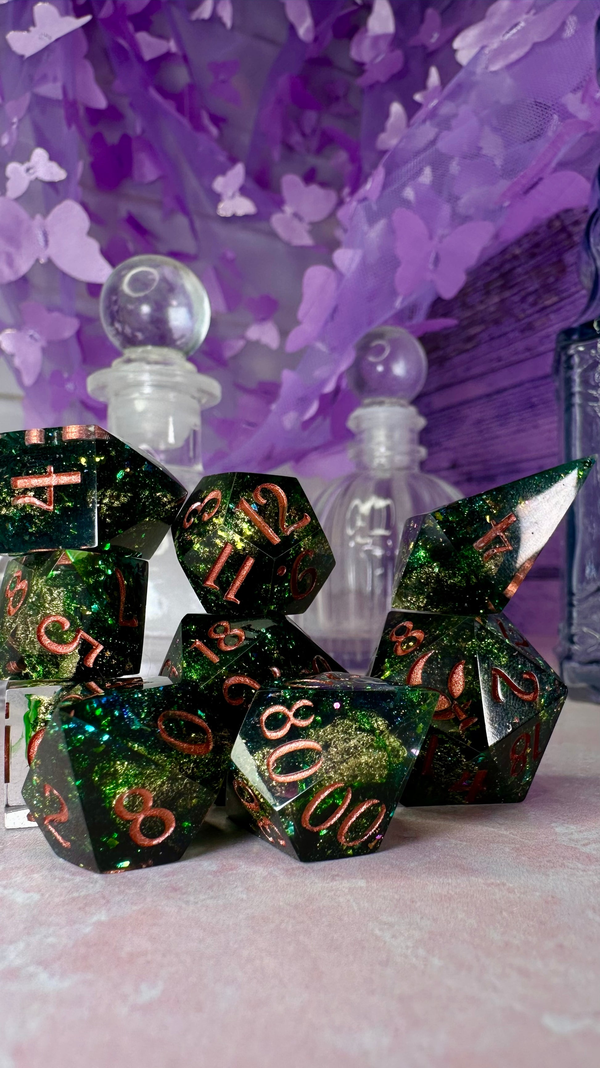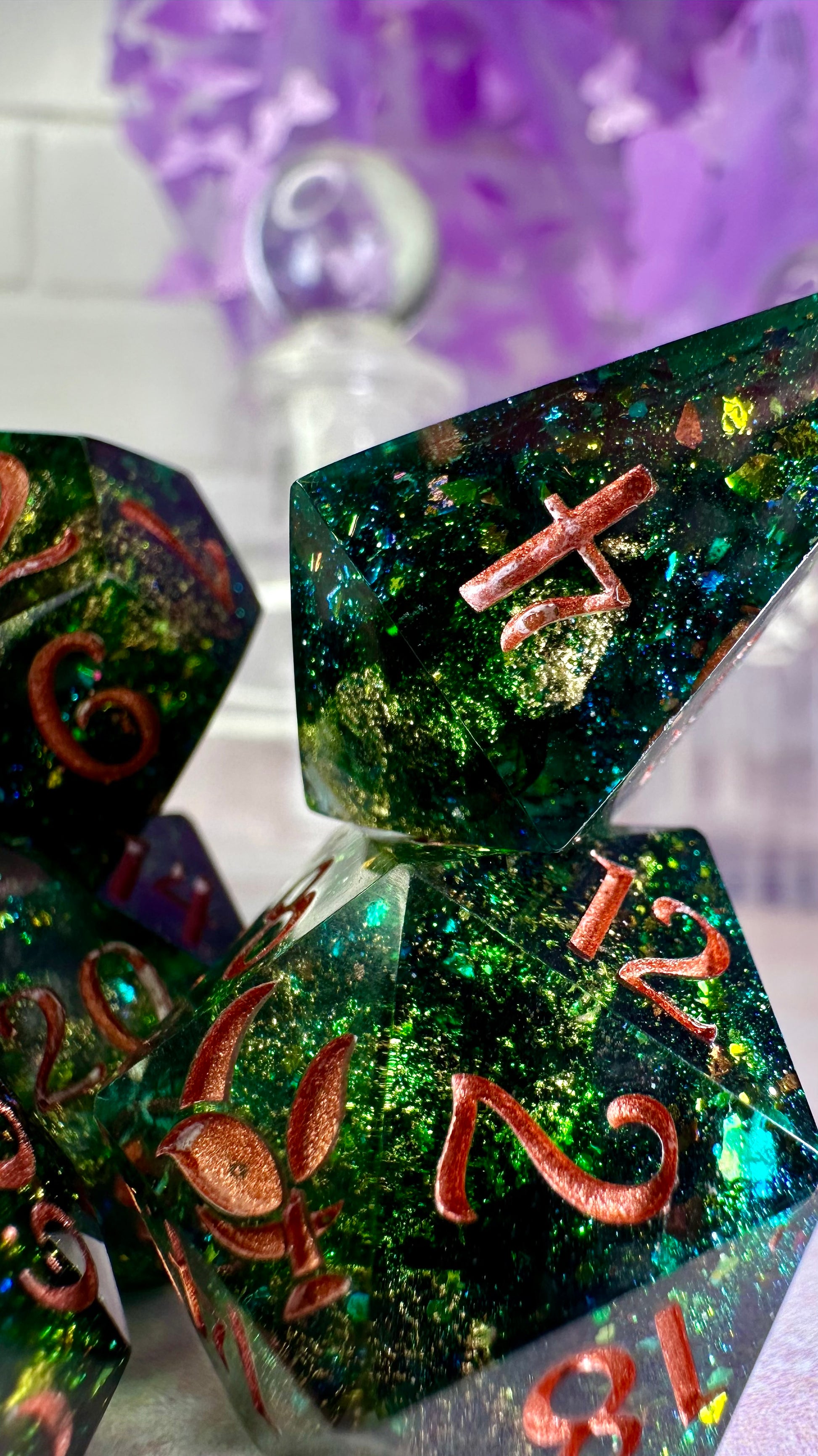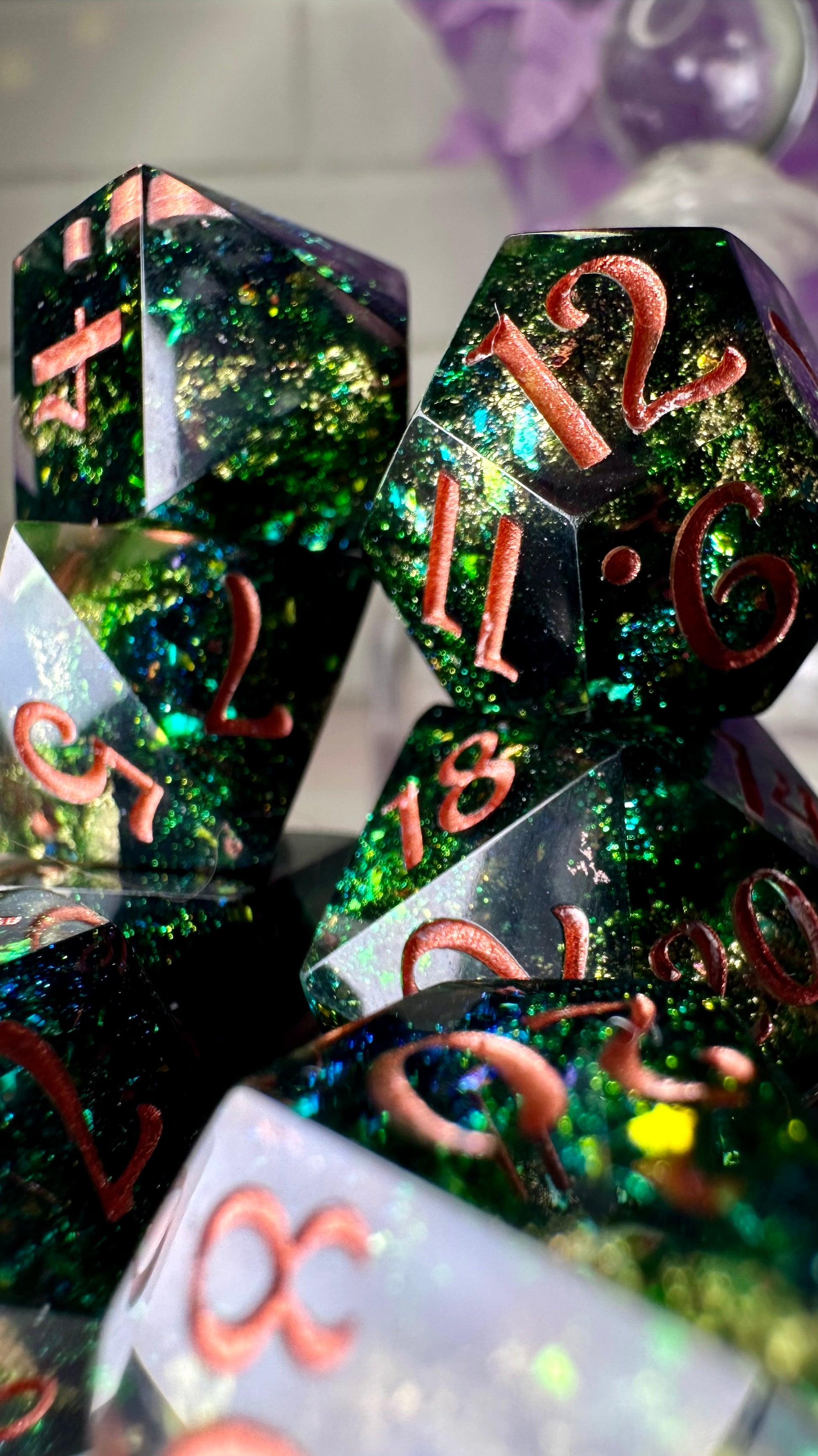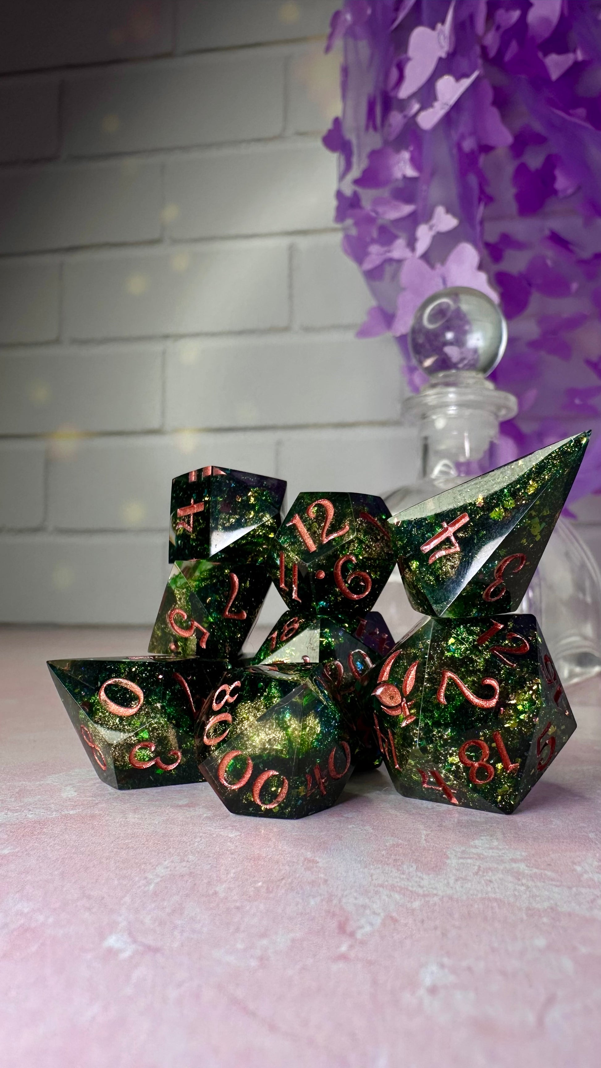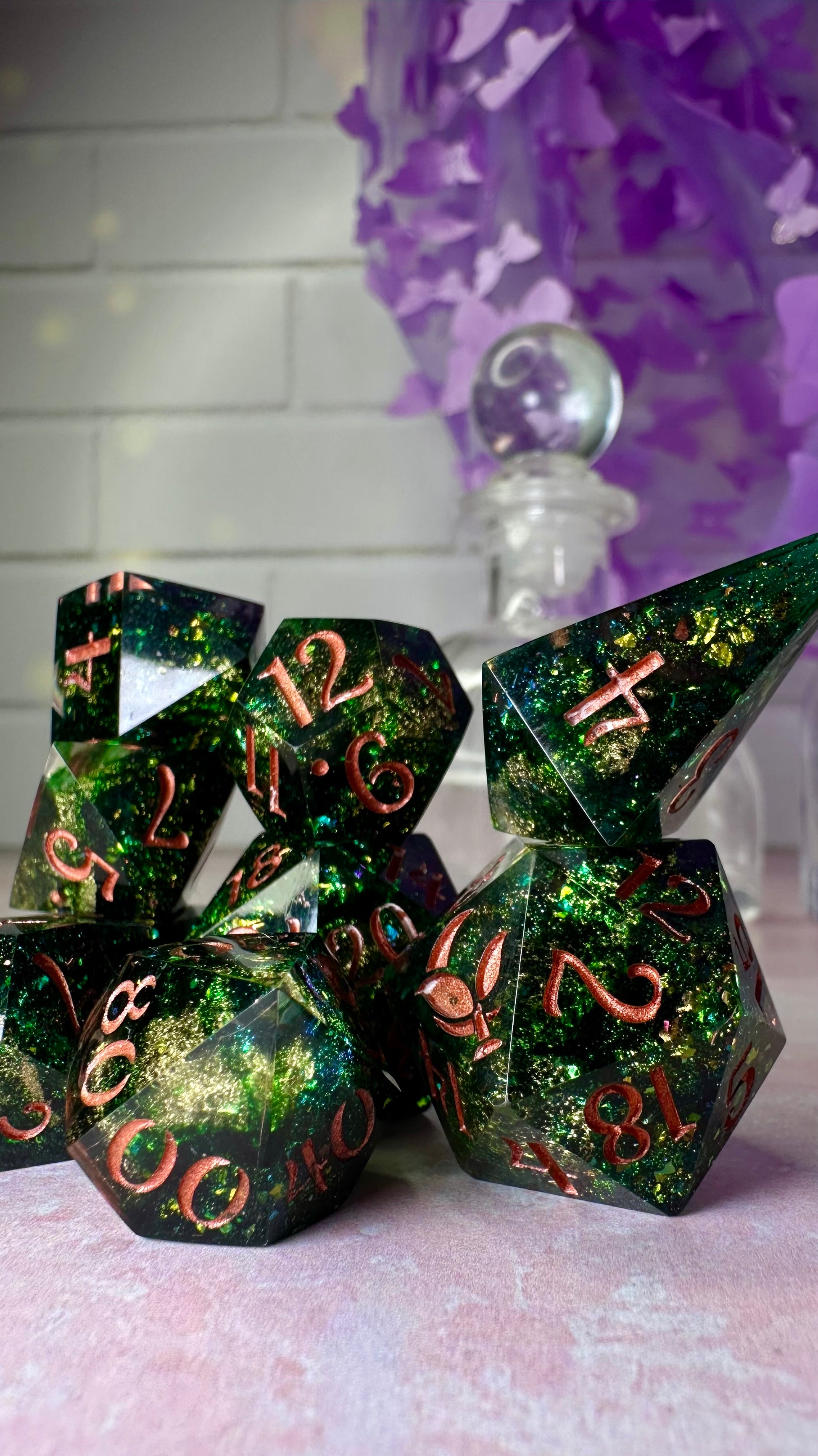 -These dice are bespoke handmade functional art pieces. This means they are not flawless ; they will have some small cosmetic flaws (small bubbles on the surface or in the dice themselves, micro-scratches on the surface, mold or inclusion marks, and carved in numbers. Some dice will have been patched with additional resin. This can cause small variations in color/visual lines) Anything worse than these flaws will be discounted and marked as such