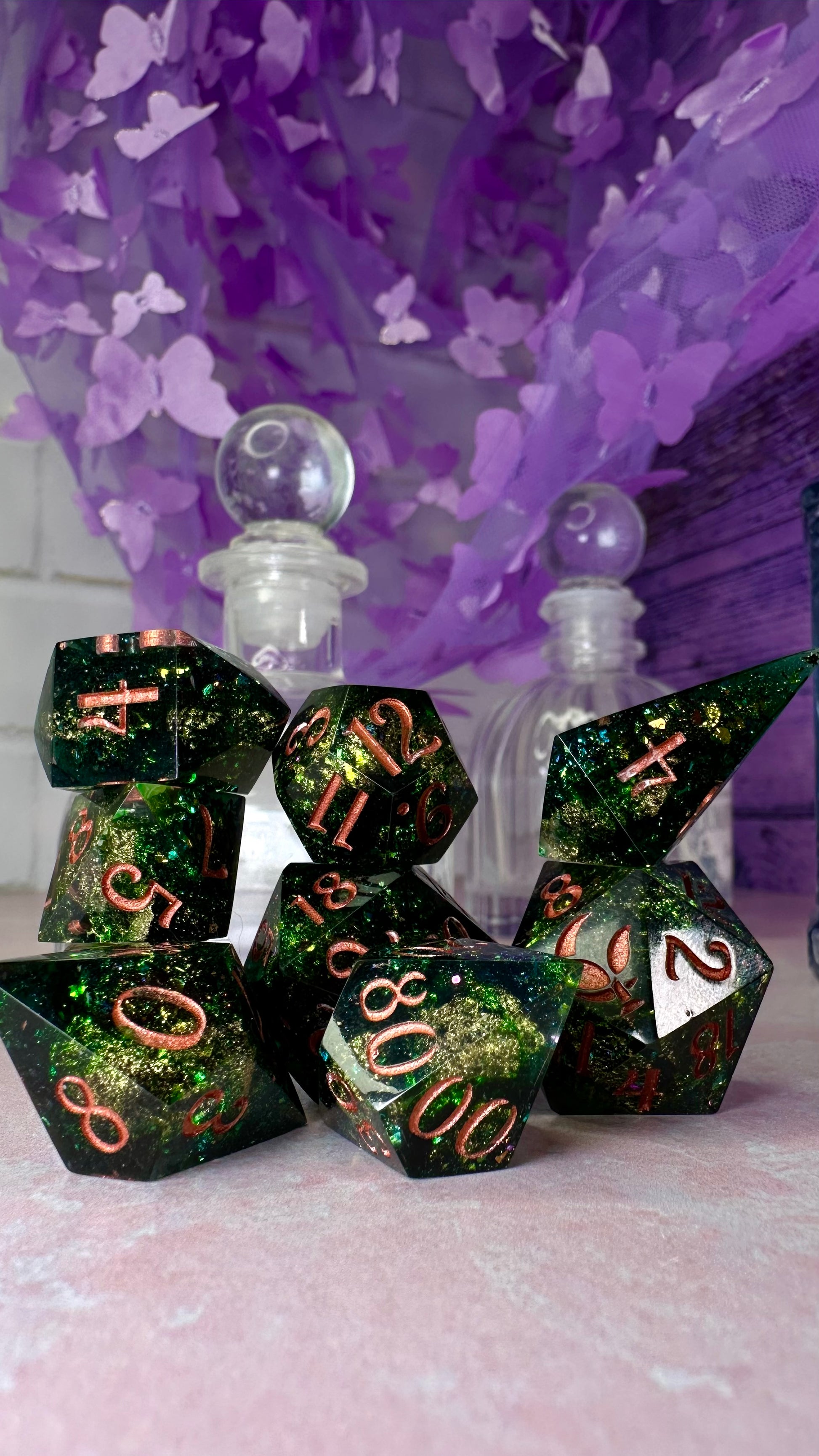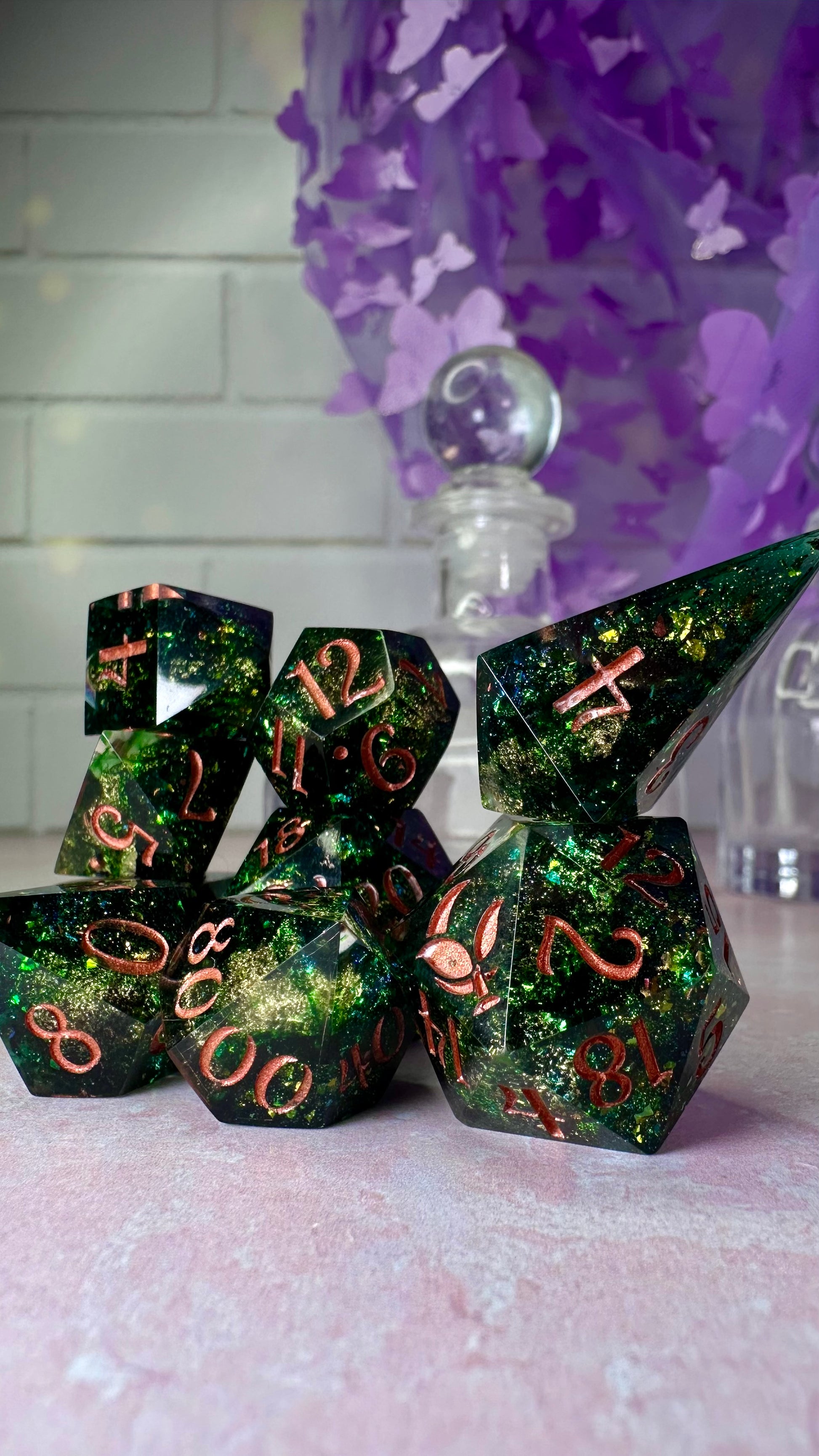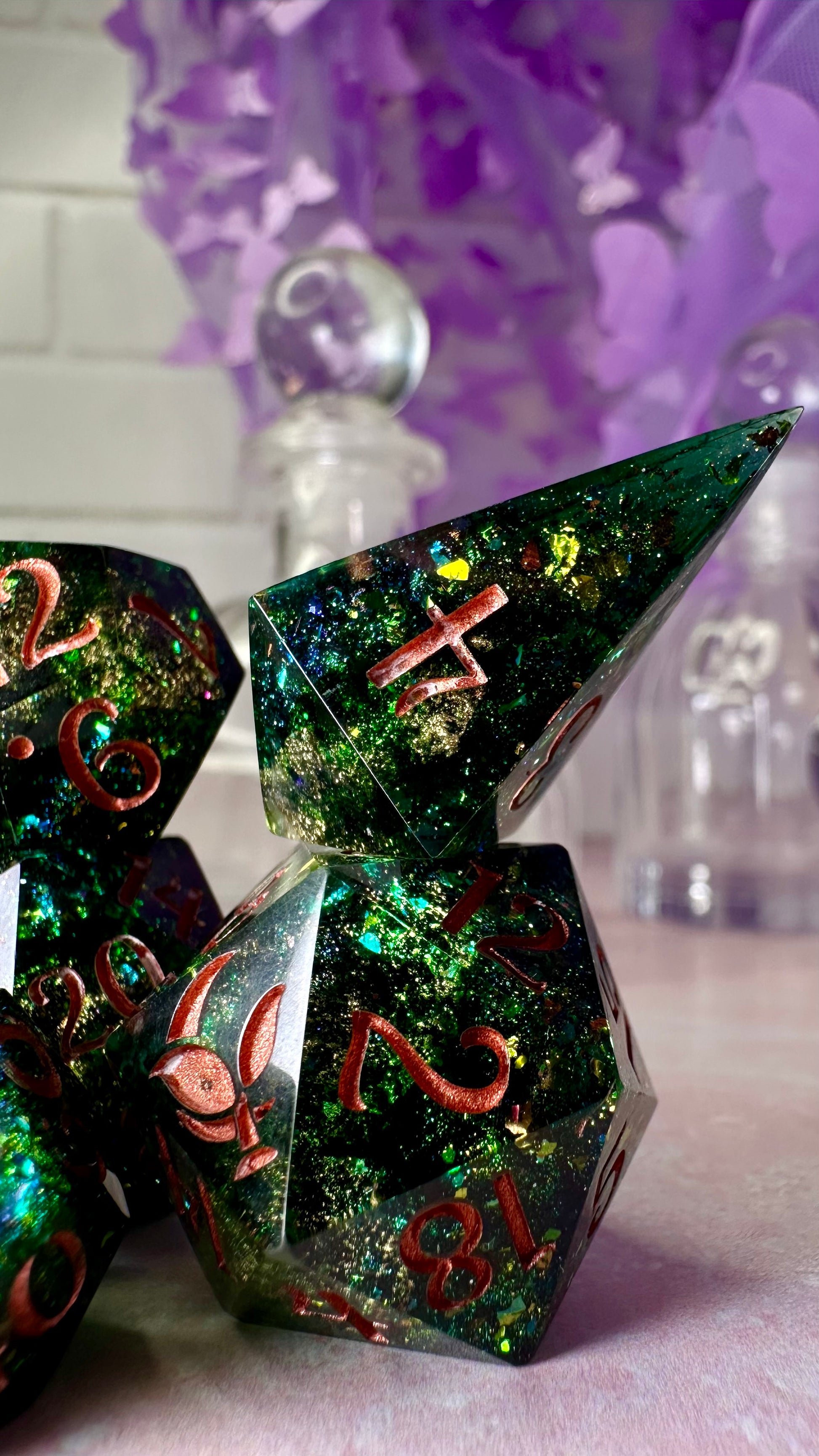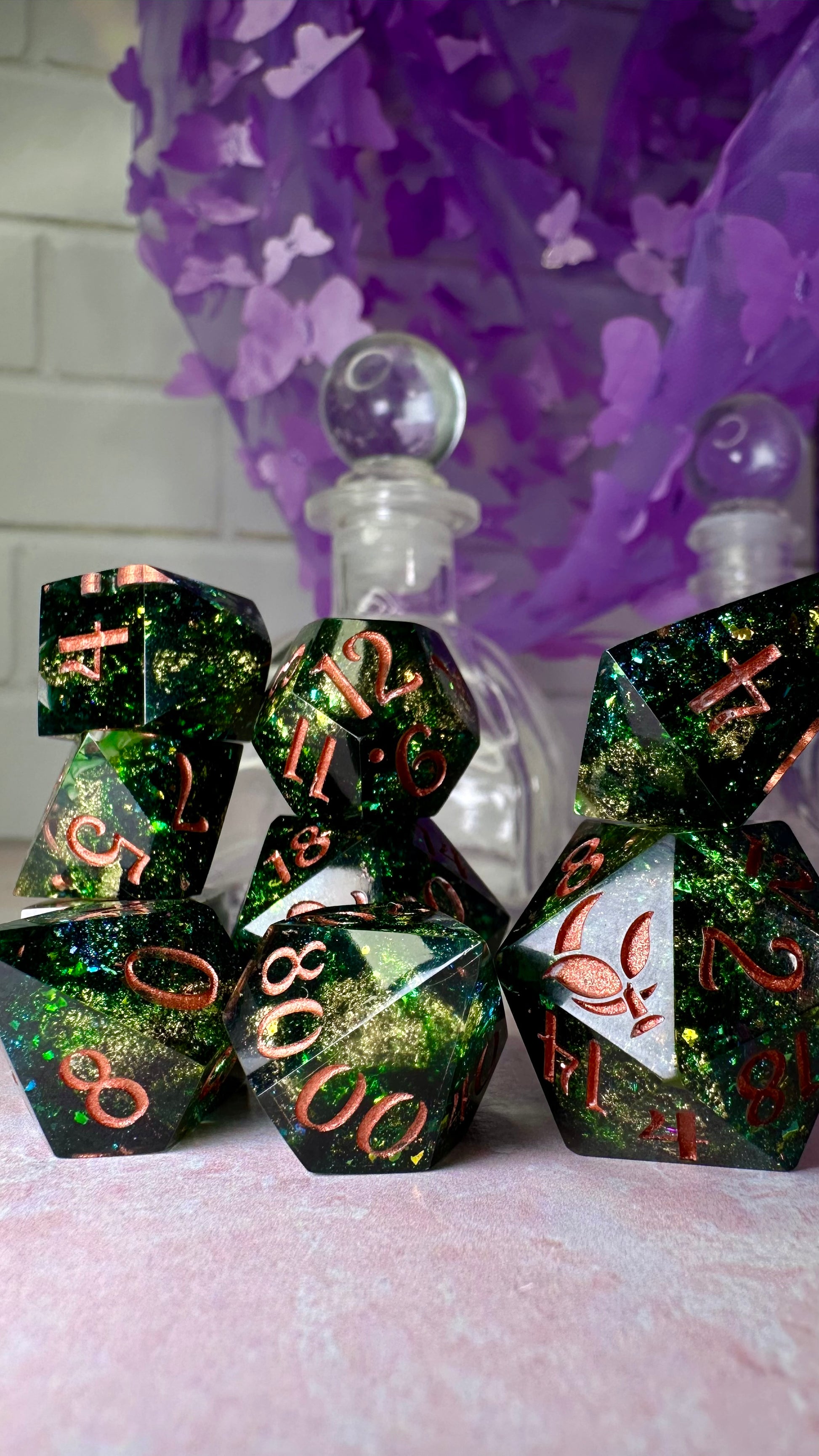 -These dice are bespoke handmade functional art pieces. This means they are not flawless ; they will have some small cosmetic flaws (small bubbles on the surface or in the dice themselves, micro-scratches on the surface, mold or inclusion marks, and carved in numbers. Some dice will have been patched with additional resin. This can cause small variations in color/visual lines) Anything worse than these flaws will be discounted and marked as such