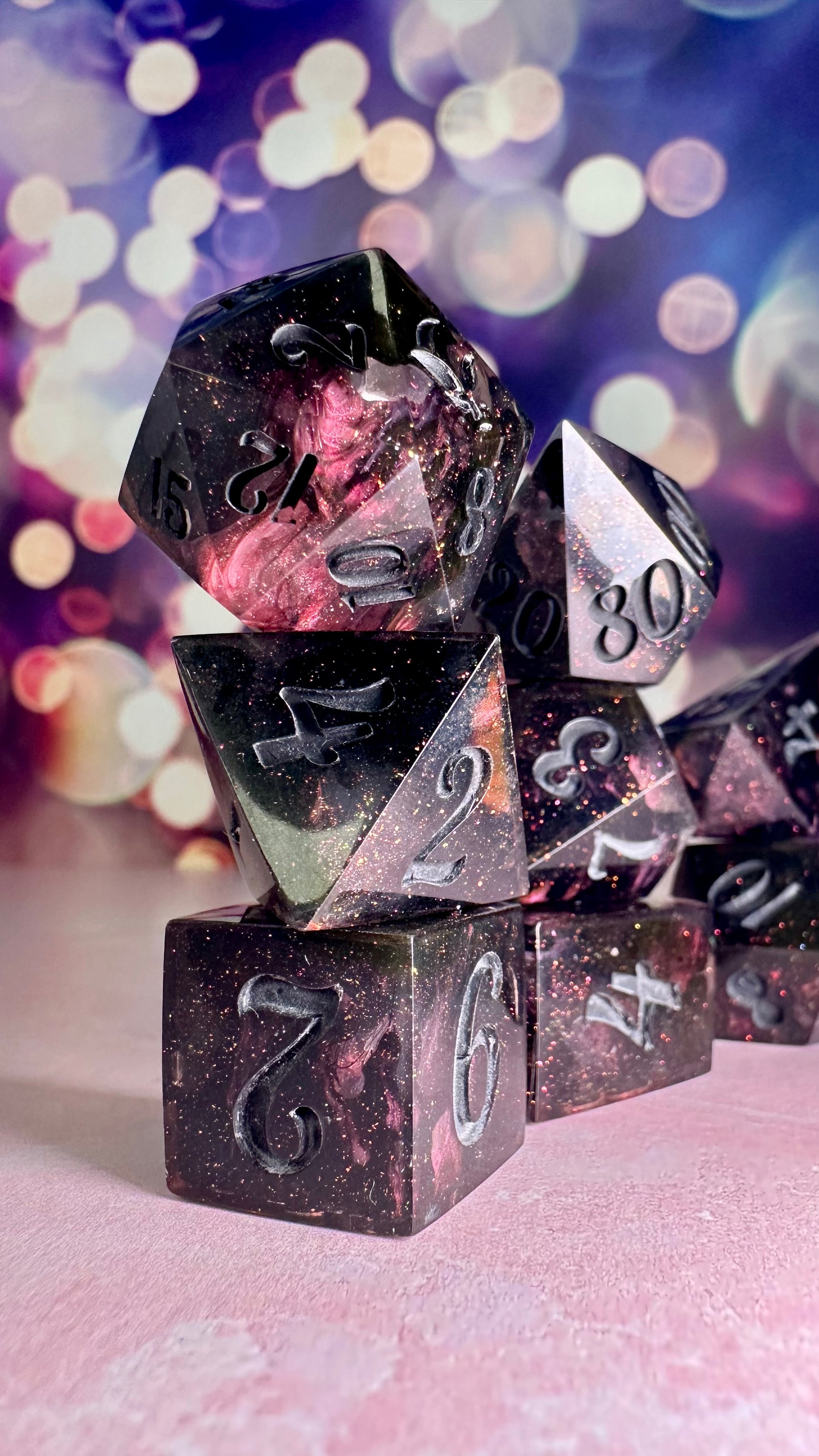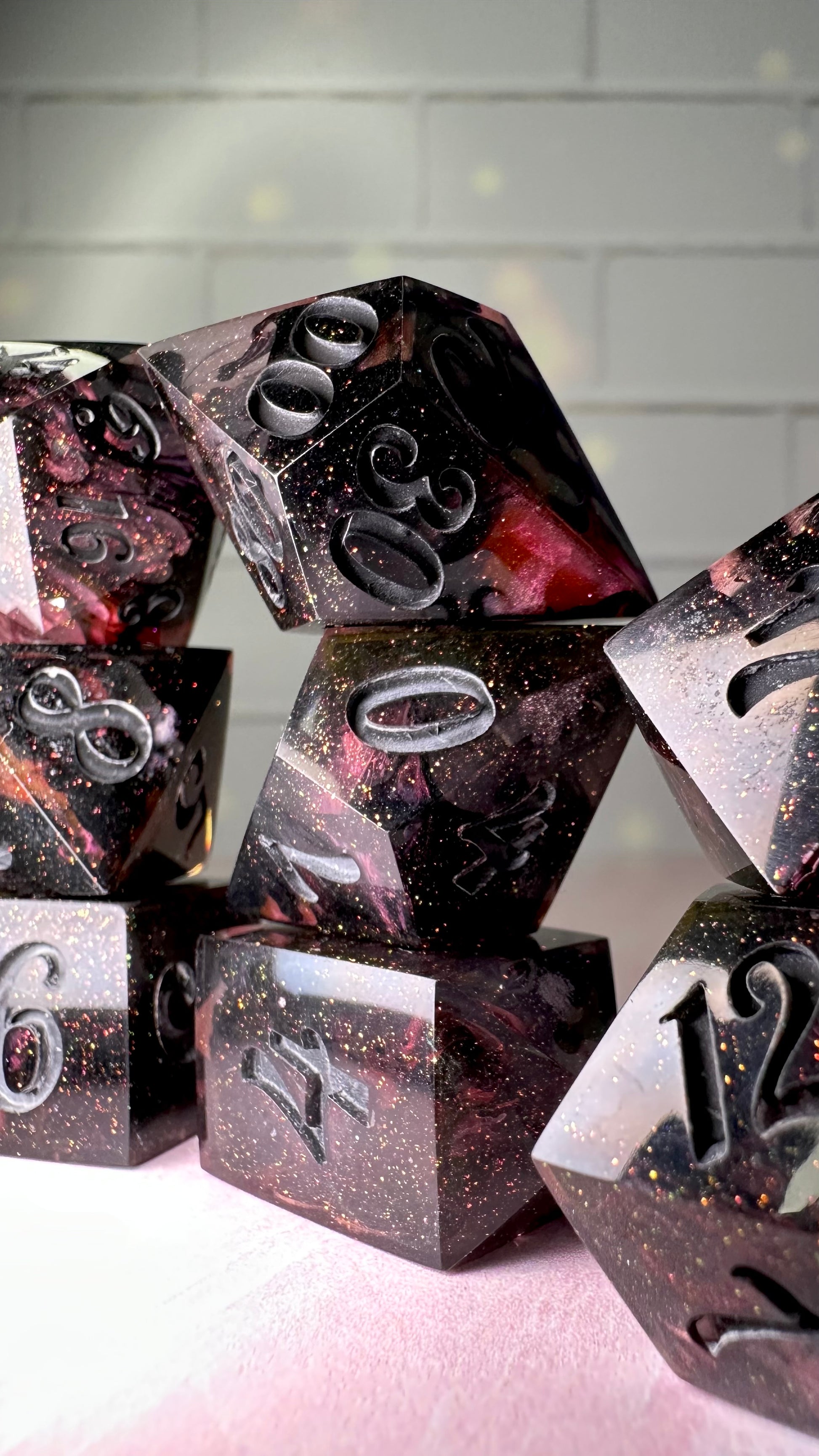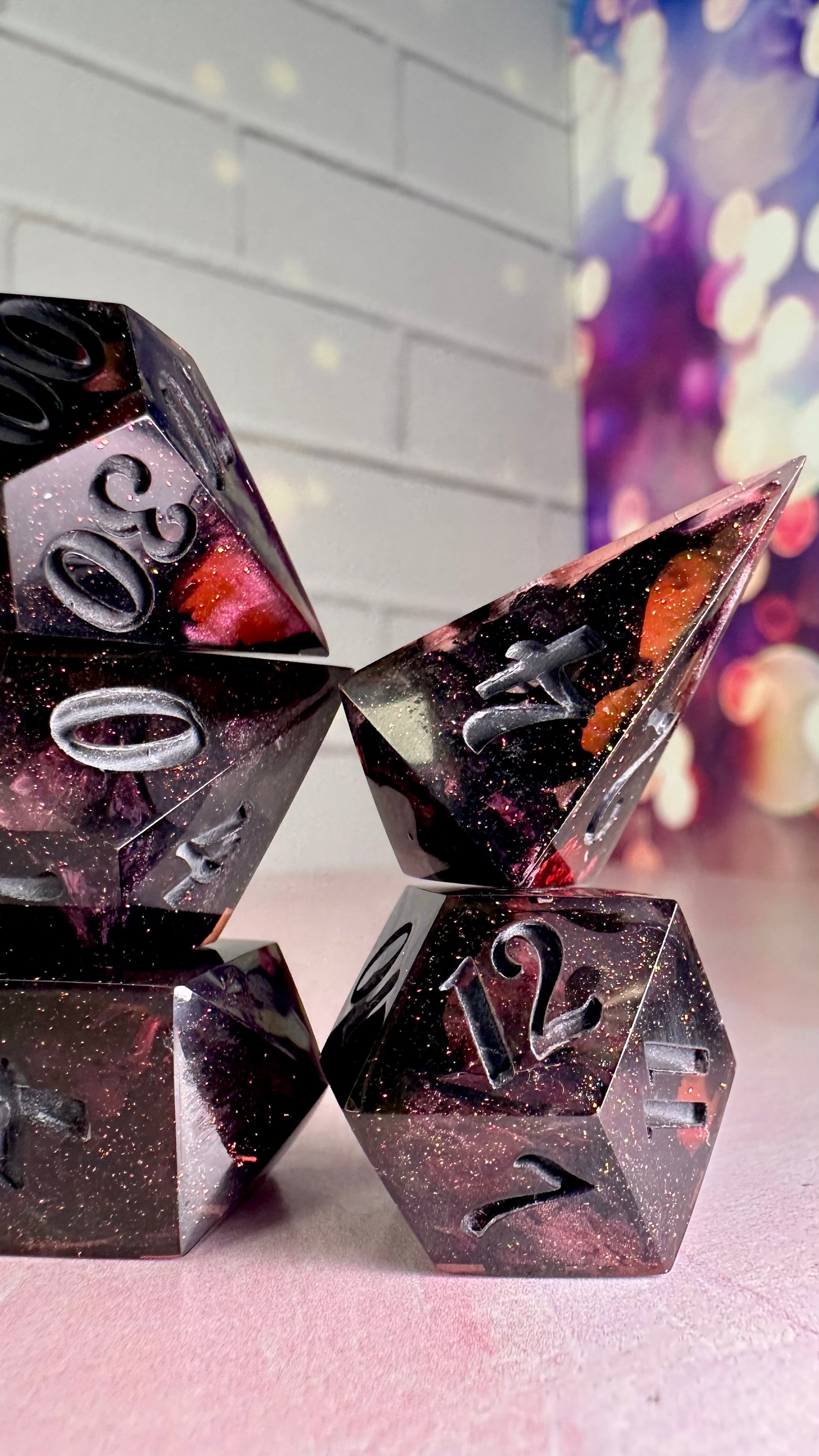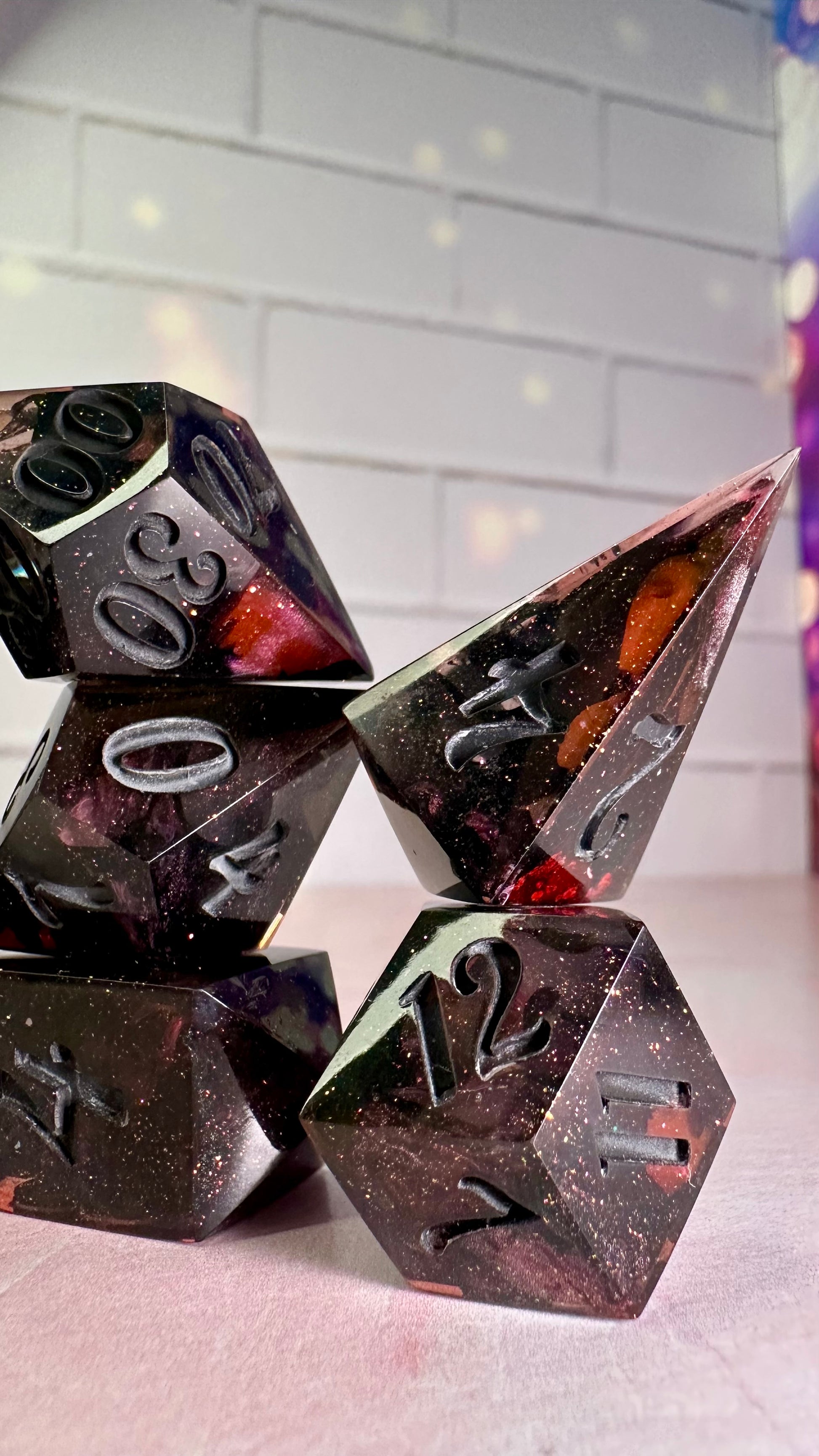 -These dice are bespoke handmade functional art pieces. This means they are not flawless ; they will have some small cosmetic flaws (small bubbles on the surface or in the dice themselves, micro-scratches on the surface, mold or inclusion marks, and carved in numbers. Some dice will have been patched with additional resin. This can cause small variations in color/visual lines) Anything worse than these flaws will be discounted and marked as such