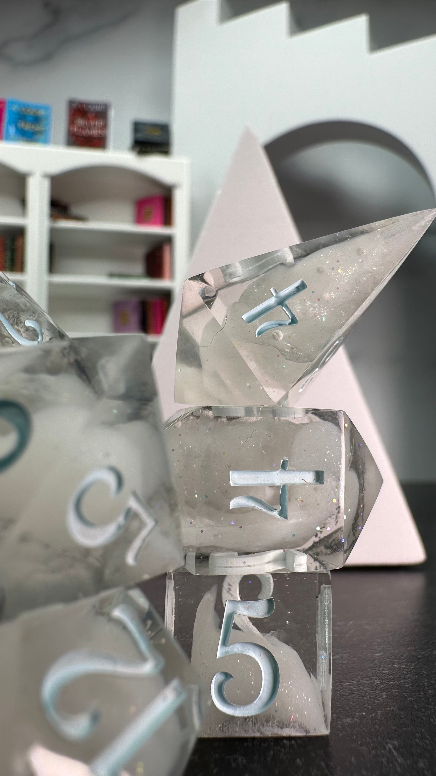 This set of dice is a water clear base with clouds of opaque white glittering resin, with drops of white and silver alcohol ink. They were inked in a custom mixed ice blue matte.