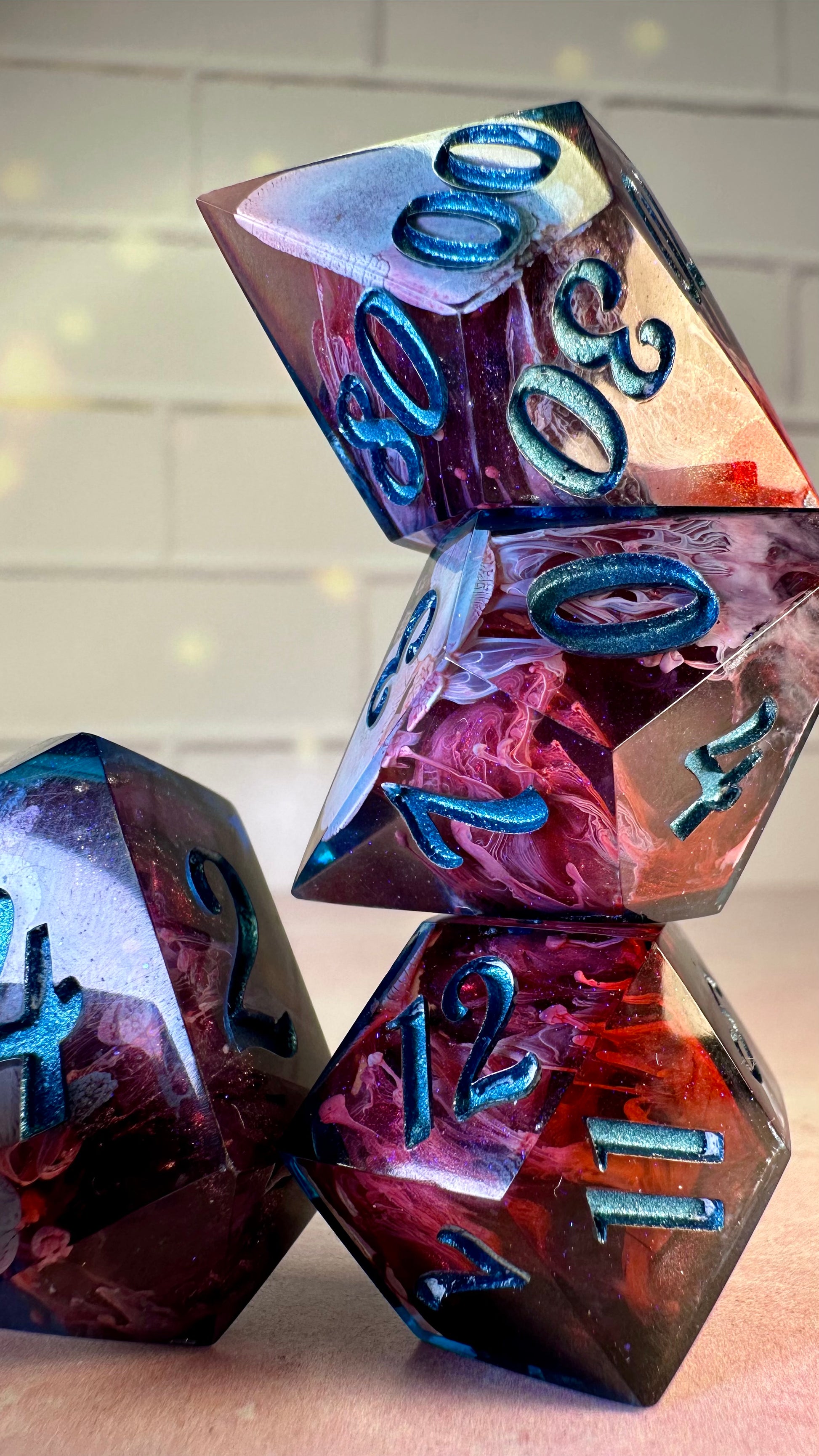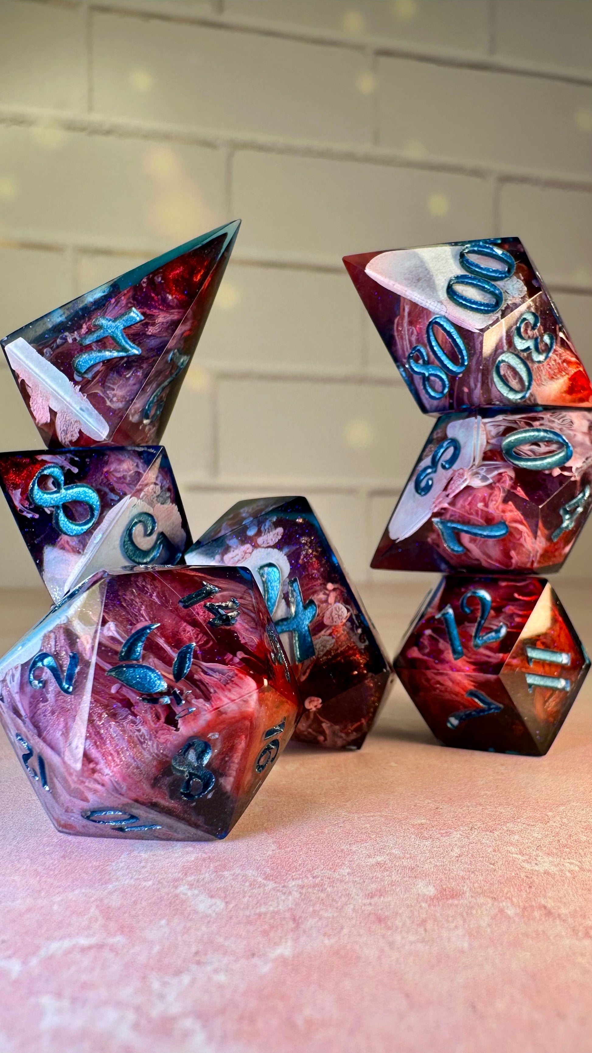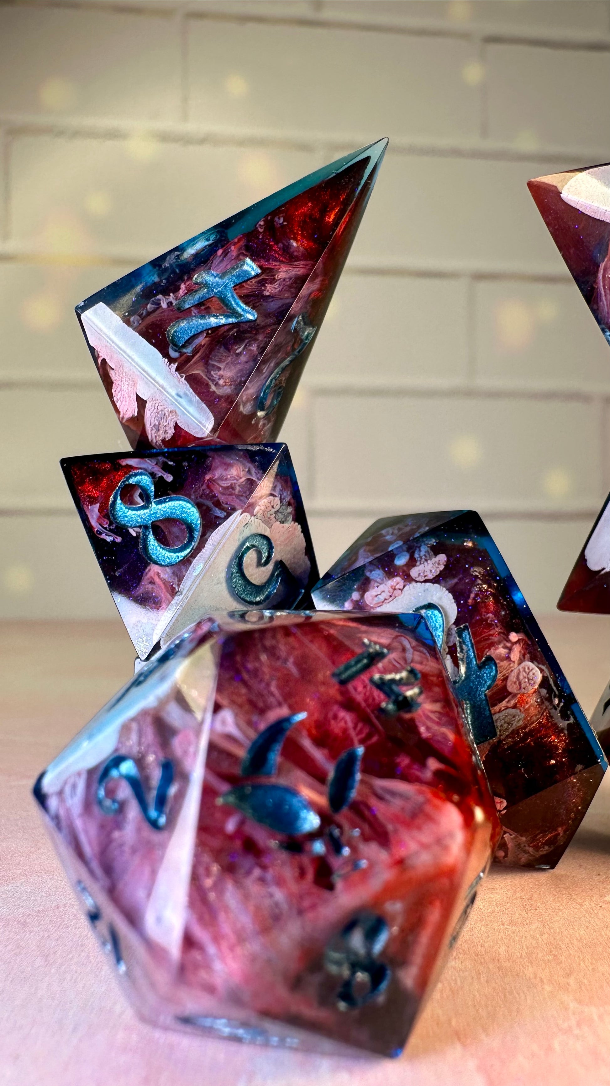 Clear blue resin with white and red alcohol ink pooling through the dice. Plumes of shimmering ruby red resin peek through the windows of alcohol ink. Inked with blue metallic gunmetal