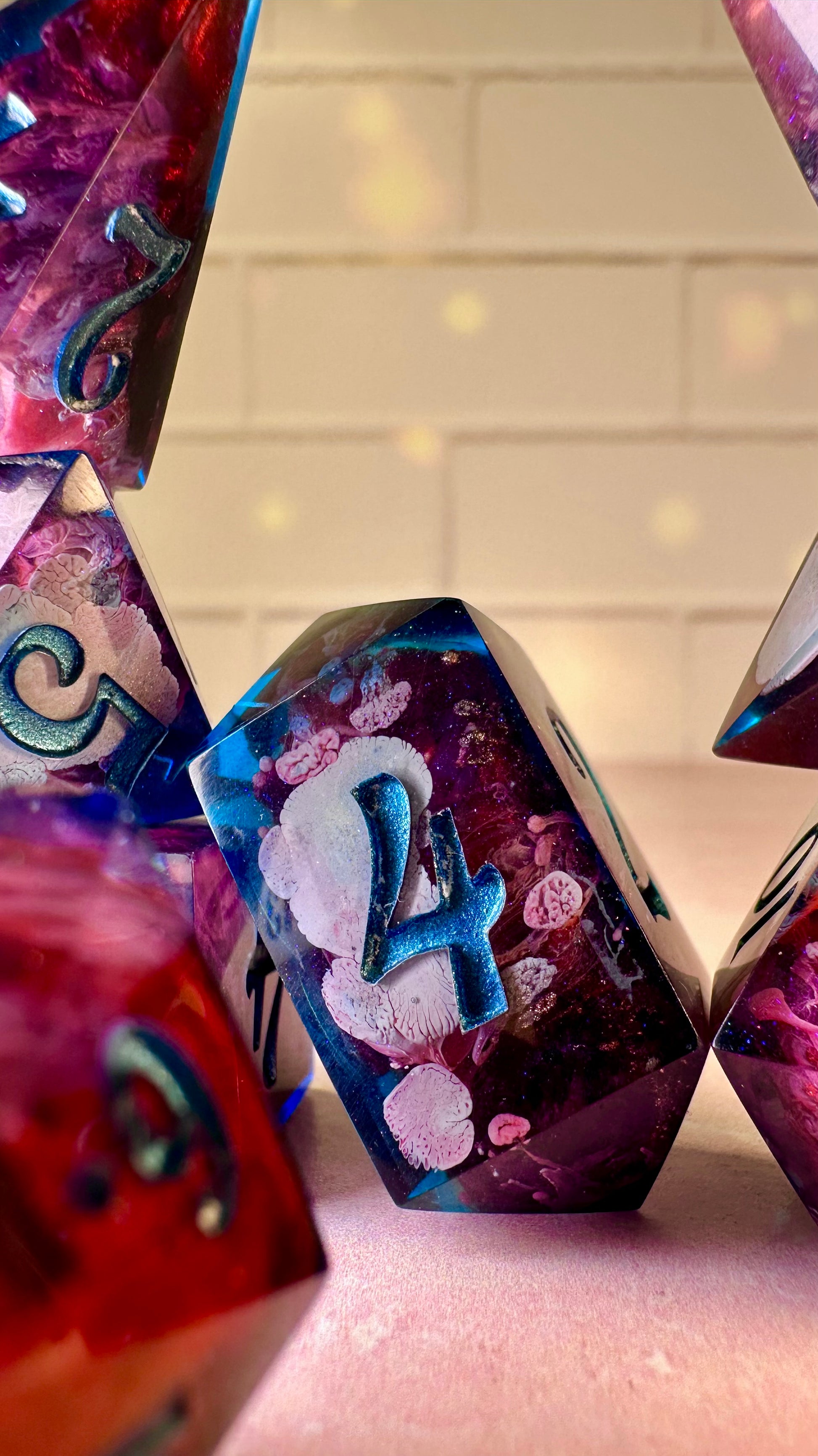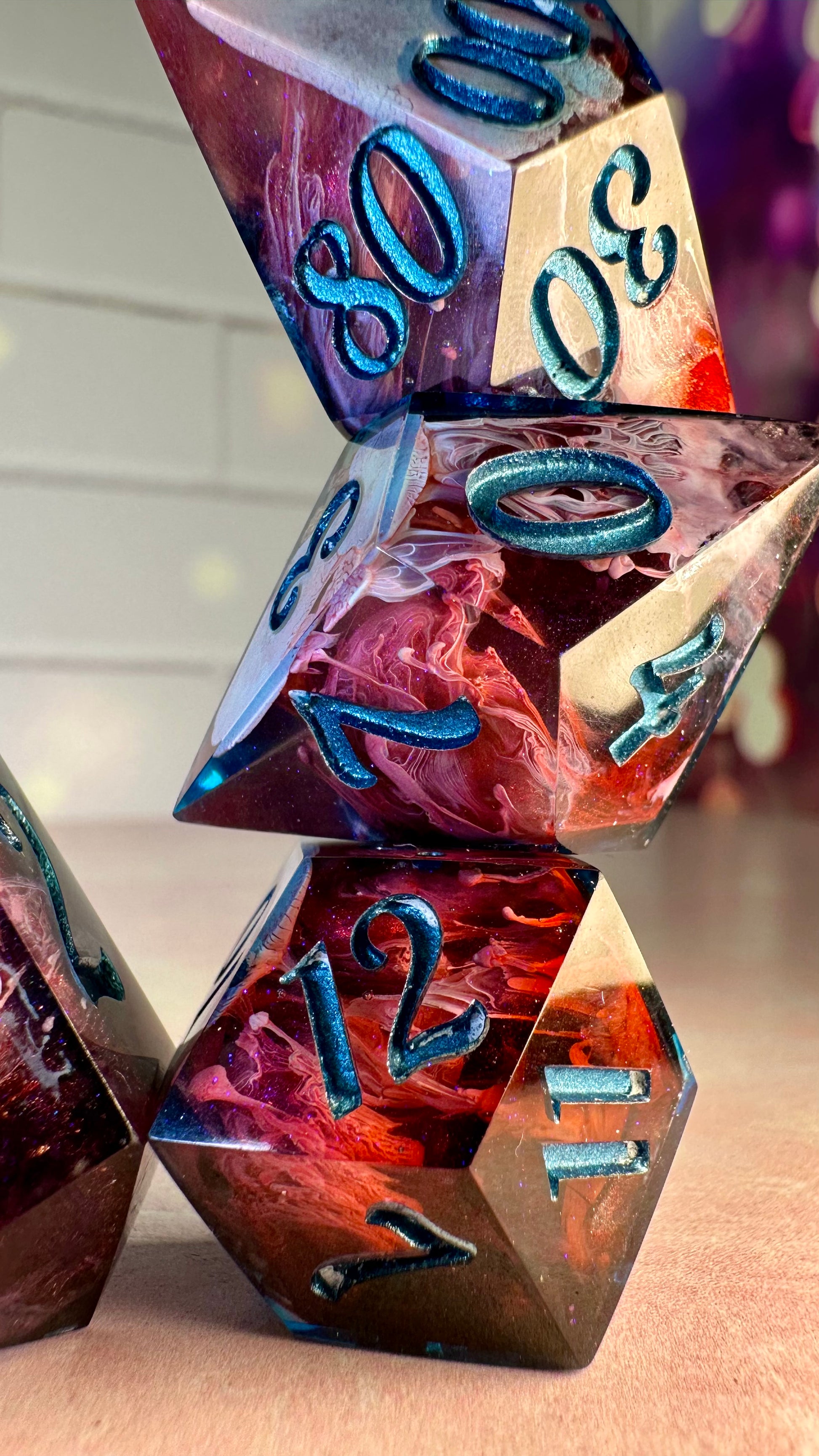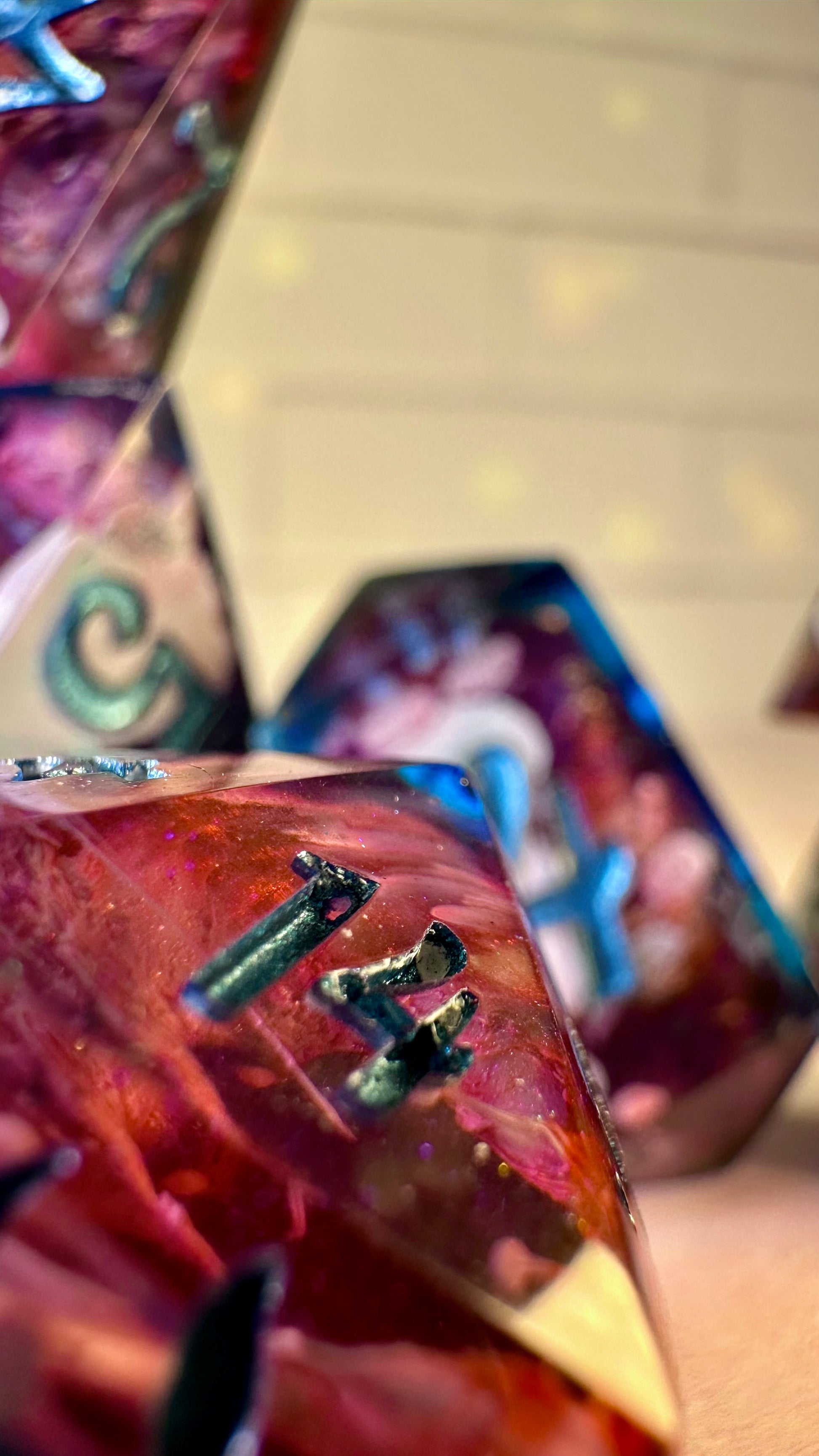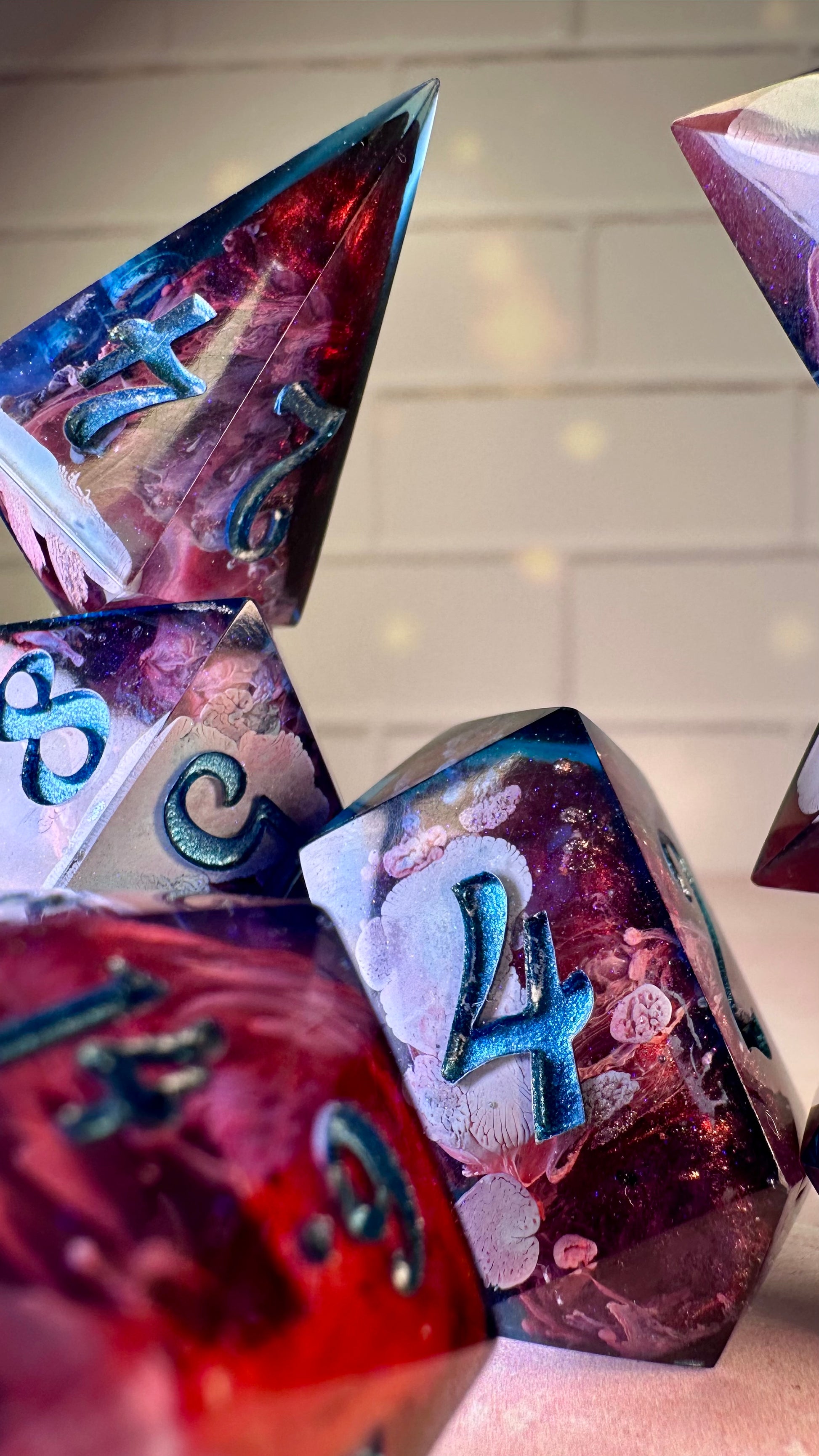 Clear blue resin with white and red alcohol ink pooling through the dice. Plumes of shimmering ruby red resin peek through the windows of alcohol ink. Inked with blue metallic gunmetal